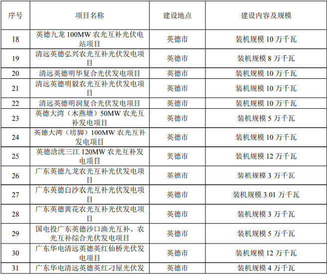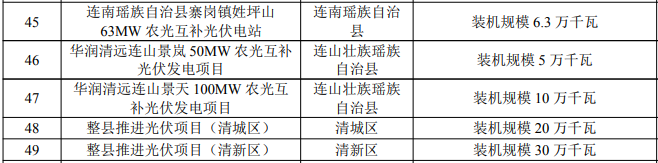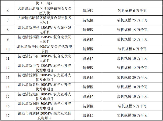 7月25日,清遠(yuǎn)市人民政府辦公室關(guān)于印發(fā)清遠(yuǎn)市能源發(fā)展“十四五”規(guī)劃的通知,通知指出,“十四五”期間,全市新增光伏發(fā)電裝機(jī)300萬(wàn)千瓦以上;清城區(qū)和清新區(qū)整縣推進(jìn)分布式光伏發(fā)電裝機(jī)分別新增約20萬(wàn)千瓦和30萬(wàn)千瓦。 此外,清遠(yuǎn)市公布“十四五”光伏重點(diǎn)項(xiàng)目,續(xù)建項(xiàng)目5個(gè),共計(jì)490MW;49個(gè)新開(kāi)工項(xiàng)目共計(jì)5.1GW。 附:清遠(yuǎn)市“十四五”規(guī)劃重點(diǎn)項(xiàng)目列表(光伏) 續(xù)建項(xiàng)目