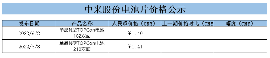 中來股份8月8日最新硅片價格公示單晶N型TOPCon電池182雙面最新價格為1.40元; 單晶N型TOPCon電池210雙面最新價格為1.41元; 本次價格自8月9日開始執(zhí)行。