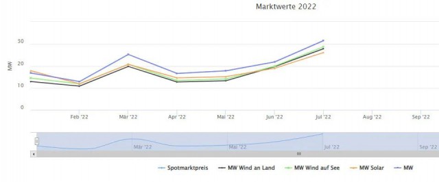 根據(jù)德國輸電系統(tǒng)運(yùn)營商的數(shù)據(jù),6月到7月,德國太陽能的市場價值增加了0.07歐元,達(dá)到了有史以來的最高值0.026093歐元/千瓦時。電力現(xiàn)貨市場價格也大幅上漲,7月份上漲近0.10歐元,達(dá)到0.0315歐元/千瓦時。