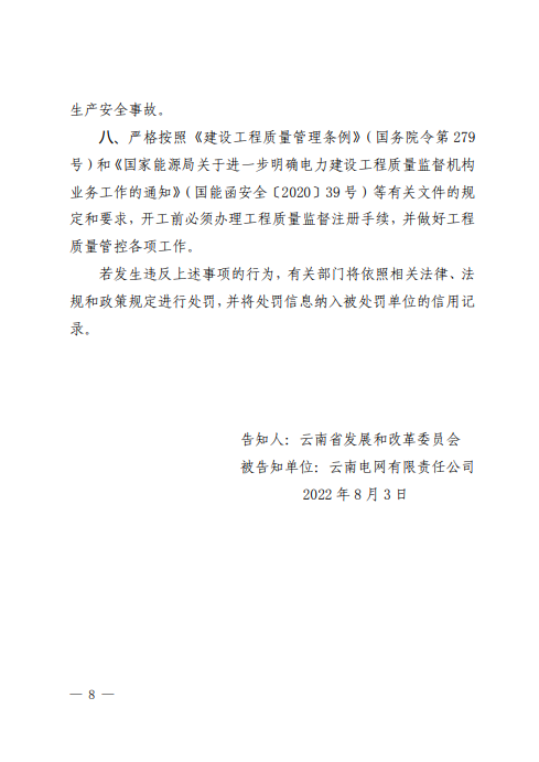 日前,云南省發(fā)改委核準(zhǔn)批復(fù)云南500千伏楚雄北部光伏接入系統(tǒng)工程項目,項目已列入“十四五”電力規(guī)劃。該工程的建設(shè)將滿足楚雄北部新能源電源上網(wǎng)需求,支撐保障區(qū)域新能源產(chǎn)業(yè)的發(fā)展。省發(fā)展改革委原則同意建設(shè)云南500千伏楚雄北部光伏接入系統(tǒng)工程項目。云南電網(wǎng)有限責(zé)任公司作為項目業(yè)主,負責(zé)項目建設(shè)、運營及貸款本息的償還。 原文如下: 云南省發(fā)展和改革委員會關(guān)于云南500千伏楚雄北部光伏接入系統(tǒng)工程項目核準(zhǔn)的批復(fù) 云發(fā)改能源〔2022〕764號 楚雄州發(fā)展和改革委員會,云南電網(wǎng)有限責(zé)任公司: 《楚雄州發(fā)展和改革委員會關(guān)于上報500kV楚雄北部光伏接入系統(tǒng)工程項目核準(zhǔn)的請示》(楚發(fā)改能源〔2022〕194號)、《云南電網(wǎng)有限責(zé)任公司關(guān)于云南500kV楚雄北部光伏接入系統(tǒng)工程項目核準(zhǔn)的請示》(云電規(guī)劃〔2022〕325號)及有關(guān)材料收悉。根據(jù)《國務(wù)院關(guān)于發(fā)布政府核準(zhǔn)的投資項目目錄(2016年本)的通知》(國發(fā)〔2016〕72號)、《企業(yè)投資項目核準(zhǔn)和備案管理辦法》(國家發(fā)展改革委令2017年第2號)、《云南省人民政府關(guān)于發(fā)布政府核準(zhǔn)的投資項目目錄(云南省2016年本)的通知》(云政發(fā)〔2017〕17號)和《云南省人民政府關(guān)于印發(fā)云南省企業(yè)投資項目核準(zhǔn)和備案實施辦法的通知》(云政發(fā)〔2017〕41號),結(jié)合云南省能源局對該項目的審核意見,經(jīng)研究,現(xiàn)就云南500千伏楚雄北部光伏接入系統(tǒng)工程項目(項目代碼:2201—530000—04—01—448235)核準(zhǔn)事項批復(fù)如下: 一、云南500千伏楚雄北部光伏接入系統(tǒng)工程項目已列入“十四五”電力規(guī)劃。該工程的建設(shè)將滿足楚雄北部新能源電源上網(wǎng)需求,支撐保障區(qū)域新能源產(chǎn)業(yè)的發(fā)展。省發(fā)展改革委原則同意建設(shè)云南500千伏楚雄北部光伏接入系統(tǒng)工程項目。云南電網(wǎng)有限責(zé)任公司作為項目業(yè)主,負責(zé)項目建設(shè)、運營及貸款本息的償還。 二、建設(shè)地點 云南省楚雄州永仁縣。 三、工程建設(shè)內(nèi)容和規(guī)模 (一)500千伏猛連變電站新建工程 500千伏猛連變電站本期新建主變規(guī)模2×1000兆伏安,遠期規(guī)模4×1000兆伏安。500千伏本期出線1回至仁和站,遠期出線8回。220千伏本期出線3回,遠期出線14回。500千伏猛連變電站遠期向東、南、西方向各1回出線均預(yù)留1組、共計3組線路高抗位置,本期不裝設(shè)高抗。遠期每臺主變低壓側(cè)預(yù)留4組無功補償裝置位置,本期每臺主變低壓側(cè)暫按配置2組60兆乏電容器、1組60兆乏動態(tài)無功補償裝置考慮,最終按初步設(shè)計確定。 (二)500千伏仁和站擴建工程 500千伏仁和變電站本期擴建1個500千伏間隔至猛連變電站。 (三)線路工程 本期新建猛連變電站至仁和變電站500千伏線路1回,長度19.63千米,其中0.83千米利用已退運的仁和變電站至魯?shù)乩娬炯拙€仁和站側(cè)出線,該段線路與仁和變電站至魯?shù)乩娬疽揖€同塔雙回路架設(shè)。其余18.8千米為新建線路,導(dǎo)線截面積4×400平方毫米,導(dǎo)線最高允許溫升按80攝氏度設(shè)計。對于新建線路鉆越的500千伏仁廠甲乙線、金楚甲乙線、仁黃甲乙線、仁昆乙線進行局部改造,改造段線路總長度7.5千米,導(dǎo)線選型與原線路一致。 (四)建設(shè)配套的通信光纜及二次系統(tǒng)工程 四、項目動態(tài)總投資為40865萬元。工程資本金比例為20%,由云南電網(wǎng)有限責(zé)任公司自籌解決,其余資金向銀行貸款解決。 五、本工程經(jīng)電力規(guī)劃設(shè)計總院評審評估,符合國家產(chǎn)業(yè)政策和節(jié)能要求。工程設(shè)計、建設(shè)和運行滿足國家環(huán)保標(biāo)準(zhǔn),請項目業(yè)主采取有效措施,降低能耗,提高效率。 六、該項目已取得所需支持性文件 (一)中共永仁縣政法委員會《關(guān)于同意〈500kV楚雄北部光伏接入系統(tǒng)工程社會穩(wěn)定風(fēng)險評估備案申請〉的批復(fù)》 (二)《關(guān)于云南500千伏楚雄北部光伏接入系統(tǒng)工程可行性研究報告的批復(fù)》(南方電網(wǎng)規(guī)劃〔2022〕25號) (三)《關(guān)于報送云南500kV楚雄北部光伏接入系統(tǒng)工程可行性研究報告評審意見的報告》(電規(guī)電網(wǎng)〔2021〕1543號) (四)《云南省能源局關(guān)于支持500千伏銅都開關(guān)站擴建主變工程等9個項目建設(shè)的函》(云能源電力函〔2021〕103號 (五)《云南省能源局關(guān)于500千伏楚雄北部光伏接入系統(tǒng)工程審查意見的函》 (六)《建設(shè)項目用地預(yù)審與選址意見書》(用字第530000202200035號) 七、項目的勘察、設(shè)計、建筑工程、安裝工程、監(jiān)理以及與工程建設(shè)有關(guān)的設(shè)備、重要材料等采購要按國家有關(guān)規(guī)定全部進行招標(biāo),招標(biāo)方式為公開招標(biāo),招標(biāo)組織形式為委托招標(biāo)。本項目為依法必須招標(biāo)的投資項目,其招標(biāo)采購活動必須全部納入公共資源交易平臺,實行透明化管理、陽光交易。請加強與有關(guān)行政監(jiān)督部門