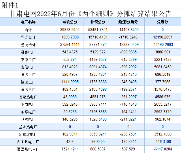 8月11日,甘肅能源監(jiān)管辦關(guān)于甘肅電網(wǎng)2022年6月份《兩個細則》考核補償結(jié)果預公告。其中,涉及的光伏項目259個。 原文如下: 甘肅能源監(jiān)管辦關(guān)于甘肅電網(wǎng)2022年6月份《兩個細則》考核補償結(jié)果預公告 省內(nèi)各有關(guān)發(fā)電企業(yè): 2022年6月份甘肅電網(wǎng)“兩個細則”考核工作已經(jīng)完成,現(xiàn)對各電廠考核、補償分數(shù)及分攤結(jié)果進行預公告,請各發(fā)電廠認真核對考核、補償結(jié)果,如有疑問,請于2022年8月17日前與甘肅能源監(jiān)管辦或甘肅省電力公司溝通聯(lián)系。