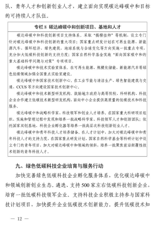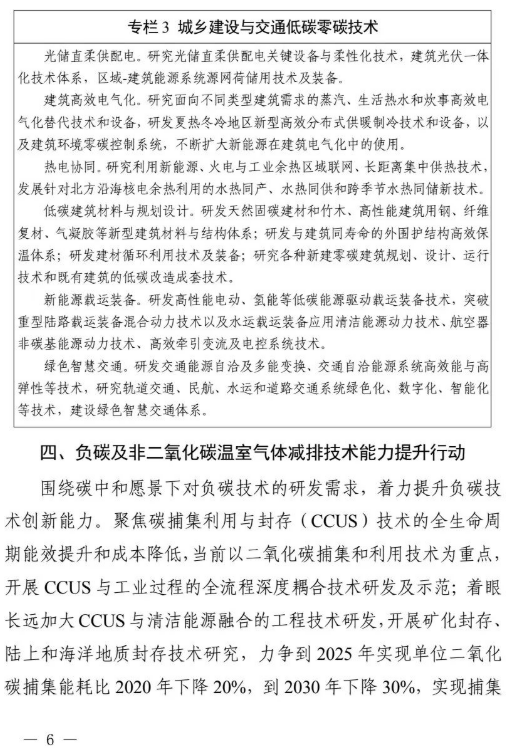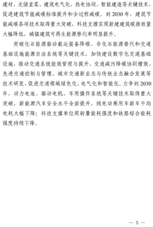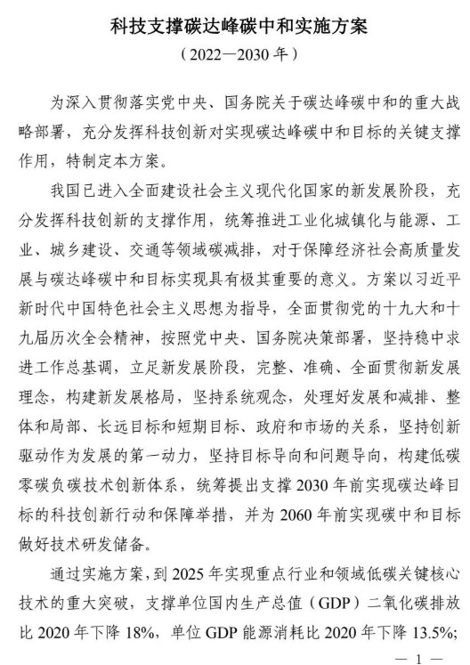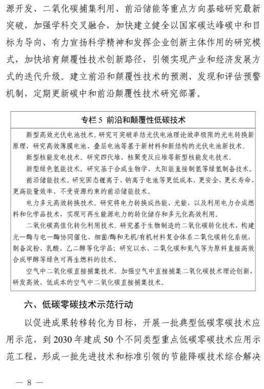 日前,科技部等九部門關于印發(fā)《科技支撐碳達峰碳中和實施方案(2022—2030年)》的通知,通知中多次提到光伏: 研發(fā)高效硅基光伏電池、高效穩(wěn)定鈣鈦礦電池等技術,研發(fā)碳纖維風機葉片、超大型海上風電機組整機設計制造與安裝試驗技術、抗臺風型海上漂浮式風電機組、漂浮式光伏系統(tǒng)。研發(fā)高可靠性、低成本太陽能熱發(fā)電與熱電聯(lián)產技術,突破高溫吸熱傳熱儲熱關鍵材料與裝備。研發(fā)具有高安全性的多用途小型模塊式反應堆和超高溫氣冷堆等技術。開展地熱發(fā)電、海洋能發(fā)電與生物質發(fā)電技術研發(fā)。 新型高效光伏電池技術。研究可突破單結光伏電池理論效率極限的光電轉換新原理,研究高效薄膜電池、疊層電池等基于新材料和新結構的光伏電池新技術。 光儲直柔供配電。研究光儲直柔供配電關鍵設備與柔性化技術,建筑光伏一體化技術體系,區(qū)域-建筑能源系統(tǒng)源網荷儲用技術及裝備。 先進低碳零碳技術示范工程。(1)零碳/低碳能源示范工程:建設大規(guī)模高效光伏、漂浮式海上風電示范工程;在可再生能源分布集中區(qū)域建設“風光互補”等示范工程;建立一批適用于分布式能源的“源-網-荷-儲-數”綜合虛擬電廠;強化氫的制-儲-輸-用全鏈條技術研究,組織實施“氫進萬家”科技示范工程;在煤炭資源富集地區(qū)建設煤炭清潔高效利用、燃煤機組靈活調峰、煤炭制備化學品等示范工程。(2)低碳/零碳工業(yè)流程再造示范工程:在鋼鐵、水泥、化工、有色等重點行業(yè)建設規(guī)模富氫氣體冶煉、生物質燃料/氫/可再生能源電力替代、可再生能源生產化學品、高性能惰性陽極和全新流程再造等集成示范工程。(3)綠色智慧交通示范工程:開展場景驅動的交通自洽能源系統(tǒng)技術示范,實施低碳智慧道路、航道、港口和樞紐示范工程。(4)低碳零碳建筑示范工程:建設規(guī)?;墓鈨χ比嵝滦徒ㄖ┡潆娛痉豆こ?,長距離工業(yè)余熱低碳集中供熱示范工程,在北方沿海地區(qū)建設核電余熱水熱同輸供熱示范工程,在典型氣候區(qū)組織實施一批高性能綠色建筑科技示范工程。(5)CCUS技術示范工程:建設大型油氣田CCUS技術全流程示范工程,推動CCUS與工業(yè)流程耦合應用、二氧化碳高值利用示范。 原文如下: 各有關單位: 為深入貫徹落實黨中央、國務院關于碳達峰碳中和的重大戰(zhàn)略決策,做好科技支撐碳達峰碳中和相關工作,依據《中共中央 國務院關于完整準確全面貫徹新發(fā)展理念做好碳達峰碳中和工作的意見》《2030年前碳達峰行動方案》,結合碳達峰碳中和領域科技創(chuàng)新工作新形勢新情況,科技部、國家發(fā)展改革委、工業(yè)和信息化部、生態(tài)環(huán)境部、住房城鄉(xiāng)建設部、交通運輸部、中科院、工程院、國家能源局共同研究制定了《科技支撐碳達峰碳中和實施方案(2022—2030年)》?,F印發(fā)給你們,請遵照執(zhí)行。 科技部 國家發(fā)展改革委 工業(yè)和信息化部 生態(tài)環(huán)境部 住房城鄉(xiāng)建設部 交通運輸部 中科院 工程院 國家能源局 2022年6月24日 (此件主動公開) 附件: