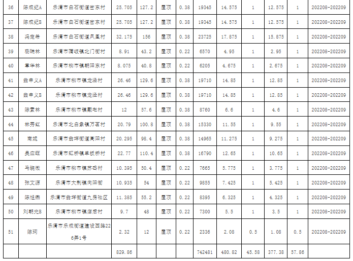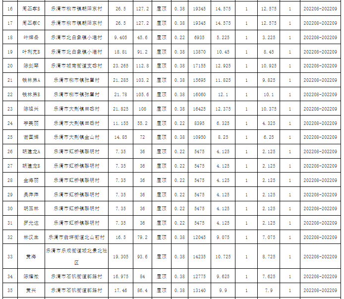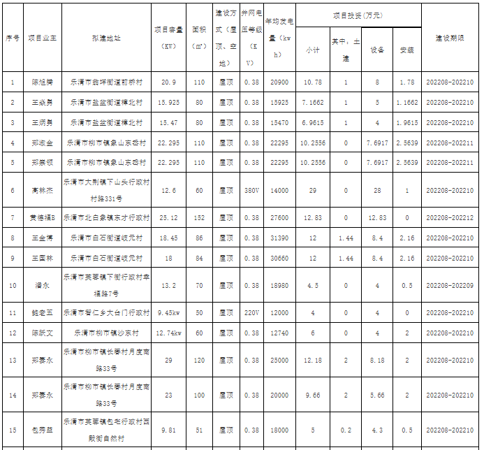 8月18日,浙江樂(lè)清市發(fā)展和改革局公示關(guān)于樂(lè)清市2022年第十一批居民家庭屋頂分布式光伏發(fā)電項(xiàng)目備案的通知,本批次共有居民家庭屋頂分布式光伏發(fā)電項(xiàng)目51個(gè),總裝機(jī)容量829.86kWp,年平均發(fā)電量472481kWh。 截至目前,浙江樂(lè)清市一共公示了11批戶(hù)用光伏項(xiàng)目備案情況,共有410個(gè)項(xiàng)目,總計(jì)裝機(jī)規(guī)模7193.152KWp,詳情如下: 原文如下: 關(guān)于樂(lè)清市2022年第十一批居民家庭屋頂分布式光伏發(fā)電項(xiàng)目備案的通知 國(guó)網(wǎng)浙江樂(lè)清市供電公司: 貴公司報(bào)送的樂(lè)清市居民家庭屋頂分布式光伏發(fā)電項(xiàng)目備案申請(qǐng)材料已收悉,根據(jù)《浙江省光伏發(fā)電項(xiàng)目管理暫行辦法》(浙發(fā)改能源〔2014〕450號(hào))、《樂(lè)清市人民政府關(guān)于扶持分布式光伏發(fā)電的若干意見(jiàn)》(樂(lè)政發(fā)〔2014〕29號(hào)),現(xiàn)予以集中備案,并就備案有關(guān)事項(xiàng)通知如下: 一、本批次共有居民家庭屋頂分布式光伏發(fā)電項(xiàng)目51個(gè),總裝機(jī)容量829.86kWp,年平均發(fā)電量472481kWh。項(xiàng)目情況詳見(jiàn)附表。 二、本備案通知書(shū)有效期壹年,自備案之日起計(jì);有效期內(nèi)未開(kāi)工建設(shè)的,貴公司應(yīng)在備案通知書(shū)有效期滿(mǎn)30日前向我局申請(qǐng)延期。逾期不報(bào),備案通知書(shū)自動(dòng)失效。 三、已備案項(xiàng)目發(fā)生變更的,應(yīng)辦理相應(yīng)的變更手續(xù)。 四、居民家庭屋頂分布式光伏發(fā)電項(xiàng)目屬自然人項(xiàng)目,我局委托貴公司組織驗(yàn)收。 五、本備案通知書(shū)不可作為項(xiàng)目所依托的建筑物符合城鄉(xiāng)、土地等相關(guān)規(guī)劃的認(rèn)定依據(jù)。 附件:樂(lè)清市2022年第十一批居民家庭屋頂分布式光伏發(fā)電項(xiàng)目表 樂(lè)清市發(fā)展和改革局 2022年8月18日 附件 樂(lè)清市2022年第十一批居民家庭屋頂分布式光伏發(fā)電項(xiàng)目表