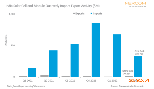 根據(jù)印度商務(wù)部日前發(fā)布的調(diào)查數(shù)據(jù),印度在2022年第二季度(Q2)進(jìn)口了5.9748億美元(約合473.9億盧比)的光伏組件,與去年同期相比下降22%。而與前一季度相比,進(jìn)口量下降了51%,下降到12.3億美元(約926.2億盧比)。 印度在2022年第二季度的光伏組件出口同比下降了57%,降到2622萬(wàn)美元(約20.7億盧比),而去年同期為6058萬(wàn)美元(約48億盧比)。按季度計(jì)算,第二季度的出口額與2022年第一季度出口的700萬(wàn)美元(約合5.551億盧比)相比增長(zhǎng)了250%。