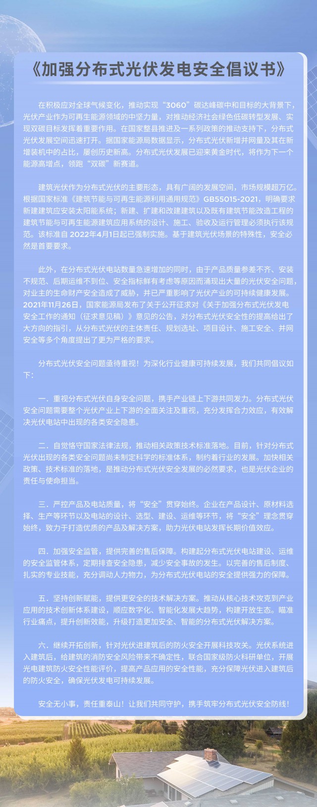 為何要發(fā)起這一倡議?昱能科技董事長凌志敏博士強調(diào),“雙碳”背景下,光伏行業(yè)打開了長期發(fā)展空間。安全一直是一切發(fā)展的前提、是行業(yè)可持續(xù)發(fā)展的根基。碳中和下的光伏新安全,需要一個更高的標準及一系列具體配合措施的落地,助力光伏電站發(fā)揮長期價值效應(yīng)。對此,中國建筑科學研究院防火研究所總工陳景輝也表示,光電建筑為實現(xiàn)“雙碳目標”開拓了一片天空,但是防火安全隱患,如果不加以重視并展開深入研究,就會成為光伏建筑發(fā)展的一個障礙。 如果防止電站起火事故?行業(yè)專家表示,起火通常是由于端子接觸不良,或線纜老化、絕緣性下降,可能產(chǎn)生拉弧。針對光伏電站中存在的“直流拉弧風險”以及“電擊風險”,昱能科技提出了“微型逆變器”與“組件級關(guān)斷器”兩種解決方案。技術(shù)負責人指出,微型逆變器系統(tǒng)為全并聯(lián)電路設(shè)計,組件之間不再有電壓疊加,直流電壓小于60V,可以從根本上解決由于高壓直流拉弧引起火災(zāi)的風險。與此同時,組件級關(guān)斷器的應(yīng)用,可以在危急情況下,遠程或者手動快速關(guān)斷每一塊光伏組件之間的連接,從而消除光伏系統(tǒng)陣列中存在的直流高壓,消除“電擊”風險,為光伏系統(tǒng)的安全保駕護航。 眾所周知,光伏項目安裝在建筑屋頂上,一旦發(fā)生起火等安全事故,后果十分嚴重。隨著《關(guān)于加強分布式光伏發(fā)電安全工作的通知(征求意見稿)》等政策推進落實,對電站安全、特別是電氣安全的重視明顯提升?!冻h書》發(fā)布后,得到了多位專家的高度評價,預(yù)計后續(xù)將有更多企業(yè)、機構(gòu)響應(yīng)這一倡議,提高產(chǎn)品與系統(tǒng)安全性能,避免起火等安全事故,通過行業(yè)上下游協(xié)作、共筑分布式光伏安全防線,確保光伏產(chǎn)業(yè)健康可持續(xù)發(fā)展。