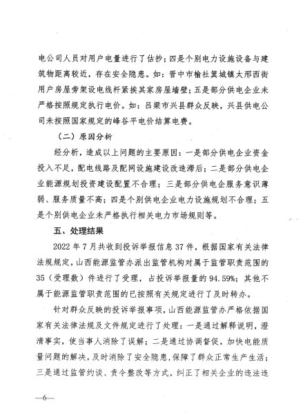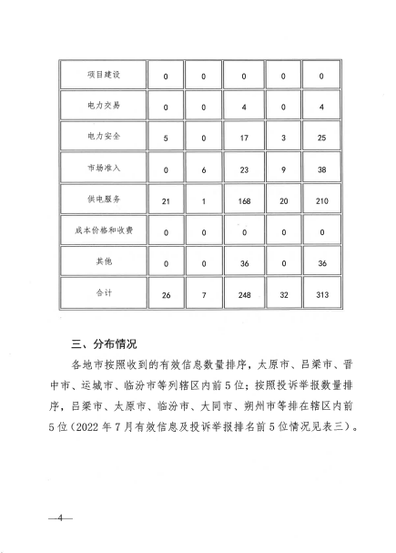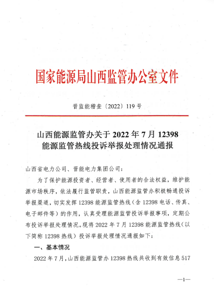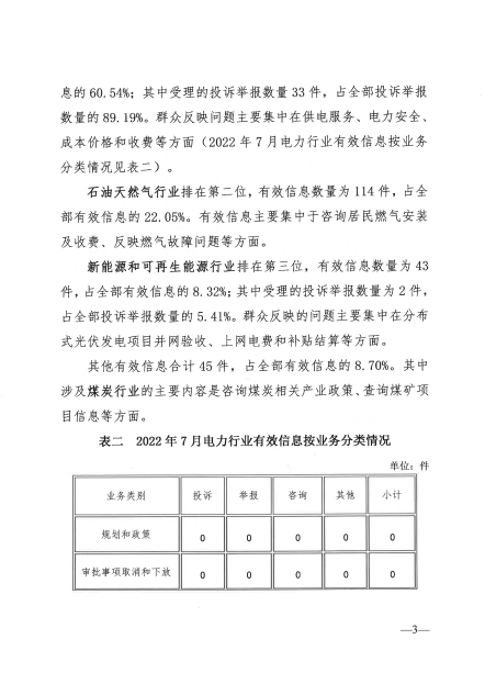 日前,山西能源監(jiān)管辦公示關(guān)于2022年7月12398能源監(jiān)管熱線投訴舉報(bào)處理情況通報(bào),7月,山西能監(jiān)辦共收到有效信息517件,環(huán)比增加4.66%,同比增加34.99%。其中,電力行業(yè)排在首位,有效信息數(shù)量為313件,群眾所反映問(wèn)題主要集中在供電服務(wù),電力安全、成本價(jià)格和收費(fèi)等方面。 其中,新能源和可再生能源行業(yè)排在第三位,有效信息數(shù)量為43件,占全部有效信息的8.32%,問(wèn)題主要集中在分布式光伏發(fā)電項(xiàng)目并網(wǎng)驗(yàn)收、上網(wǎng)電費(fèi)和補(bǔ)貼結(jié)算等方面。原文如下: