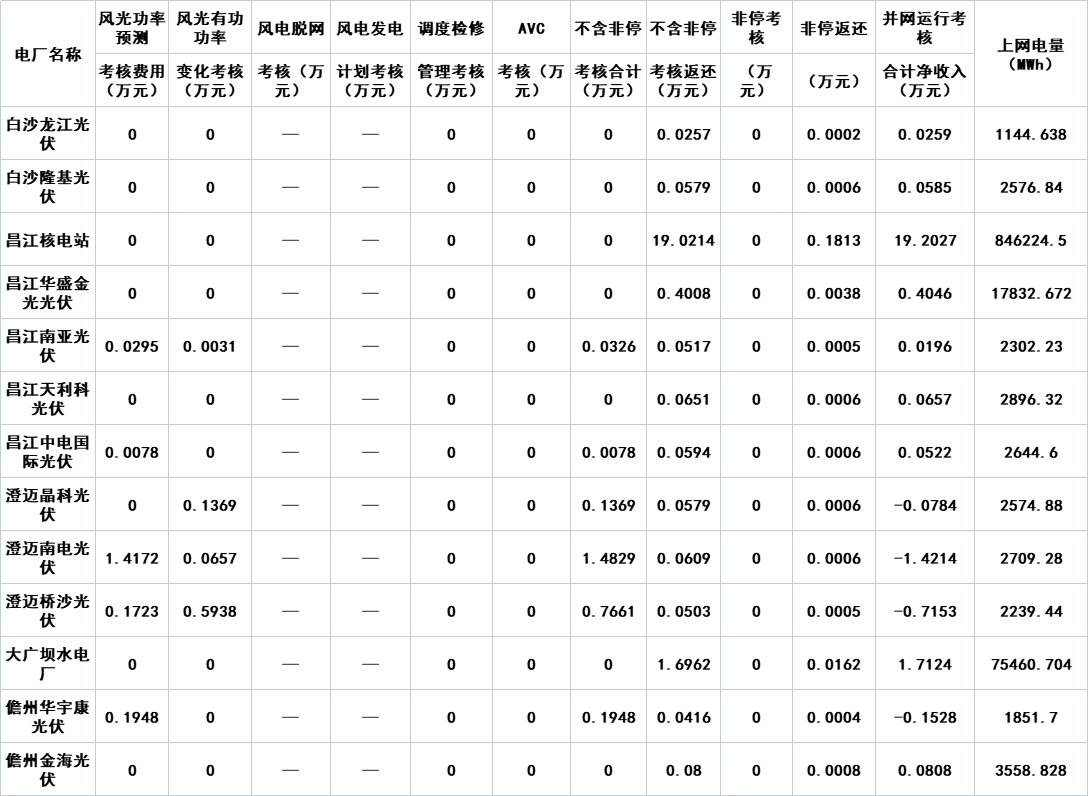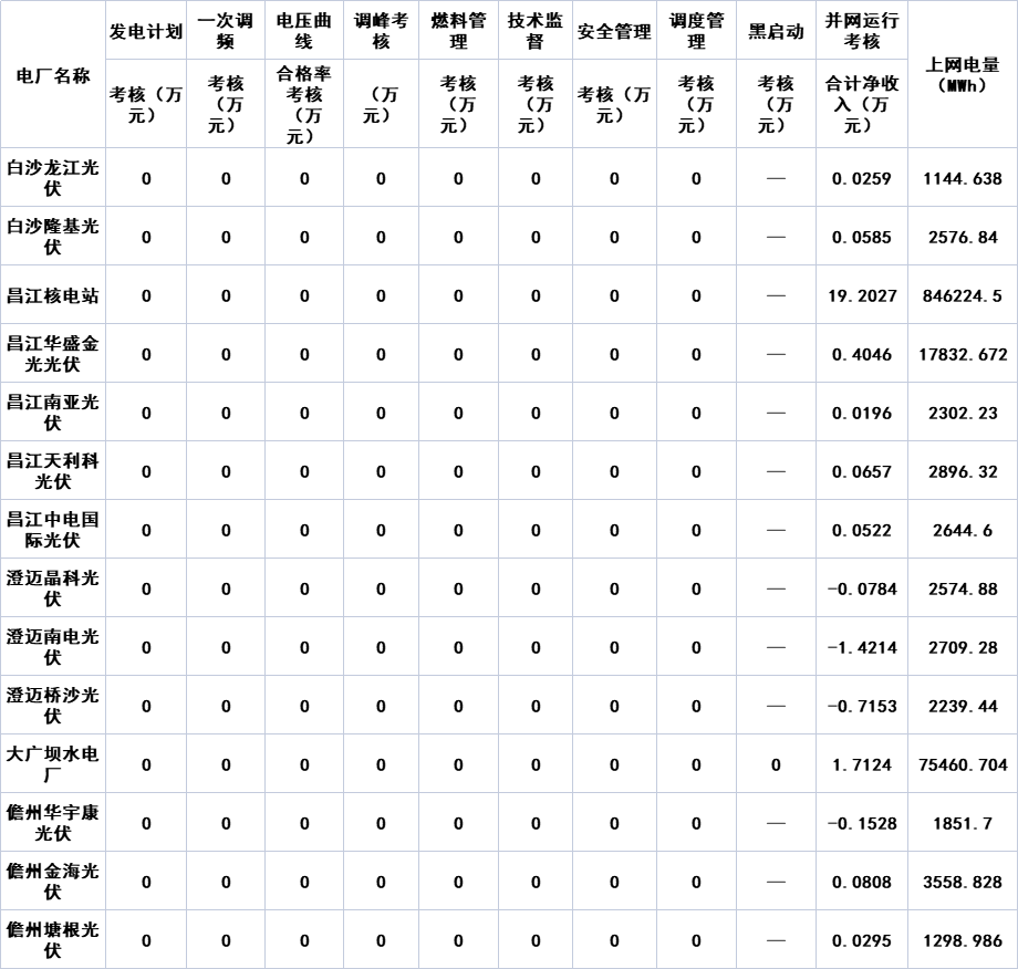 8月29日,國家能源局南方監(jiān)管局發(fā)布海南統(tǒng)調(diào)電廠2022年6月并網(wǎng)運行考核及輔助服務(wù)補償結(jié)果的通知。 原文如下: 南方監(jiān)能瓊辦〔2022〕34號 關(guān)于發(fā)布海南統(tǒng)調(diào)電廠2022年6月并網(wǎng)運行考核及輔助服務(wù)補償結(jié)果的通知 海南電網(wǎng)公司,各有關(guān)電廠: 按照南方區(qū)域“兩個細則”規(guī)定,海南電力調(diào)度控制中心完成了2022年6月的并網(wǎng)運行考核及輔助服務(wù)補償統(tǒng)計工作,并向我局報送了并網(wǎng)運行考核、輔助服務(wù)補償結(jié)果。經(jīng)審核,現(xiàn)予以發(fā)布。請你們按照規(guī)定開展結(jié)算。 附件:1.2022年6月海南統(tǒng)調(diào)電廠并網(wǎng)運行考核結(jié)果 2.2022年6月海南統(tǒng)調(diào)電廠輔助服務(wù)補償結(jié)果 南方能源監(jiān)管局 2022年8月26日 抄送:南方電網(wǎng)公司 南方能源監(jiān)管局綜合處 2022年8月26日印發(fā) 附件1 2022年6月海南統(tǒng)調(diào)電廠并網(wǎng)運行考核結(jié)果 2022年6月海南統(tǒng)調(diào)電廠并網(wǎng)運行考核結(jié)果(續(xù)表) 附件2:2022年6月海南統(tǒng)調(diào)電廠輔助服務(wù)補償費用清單