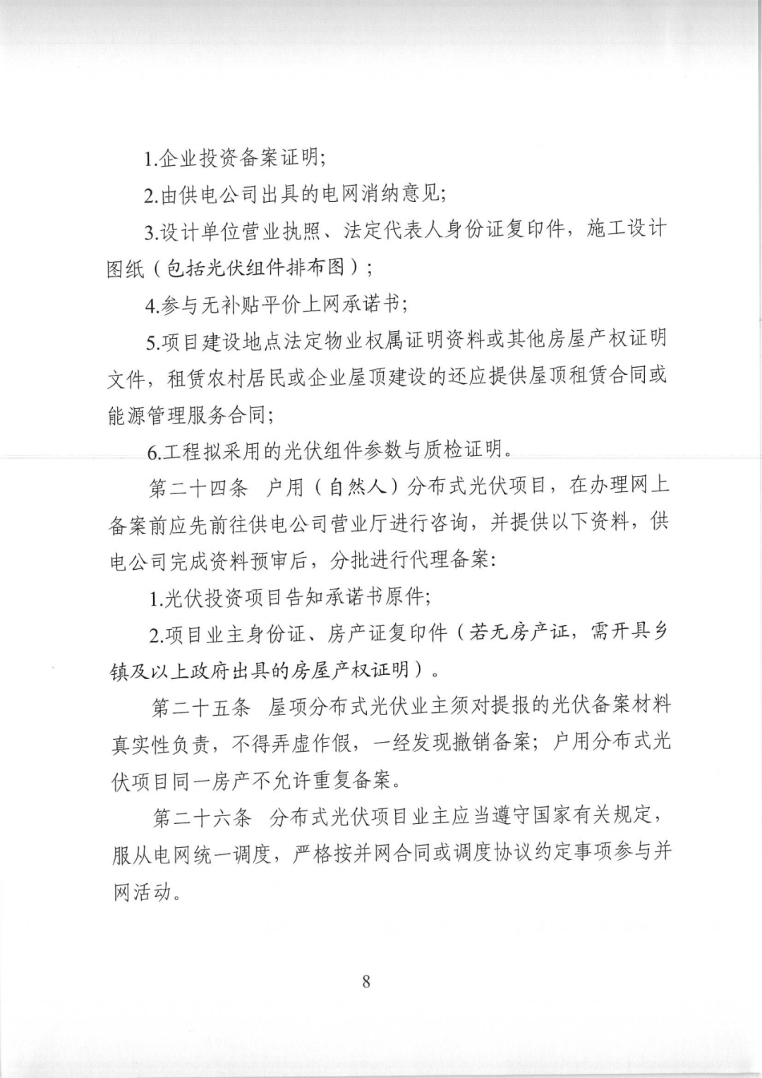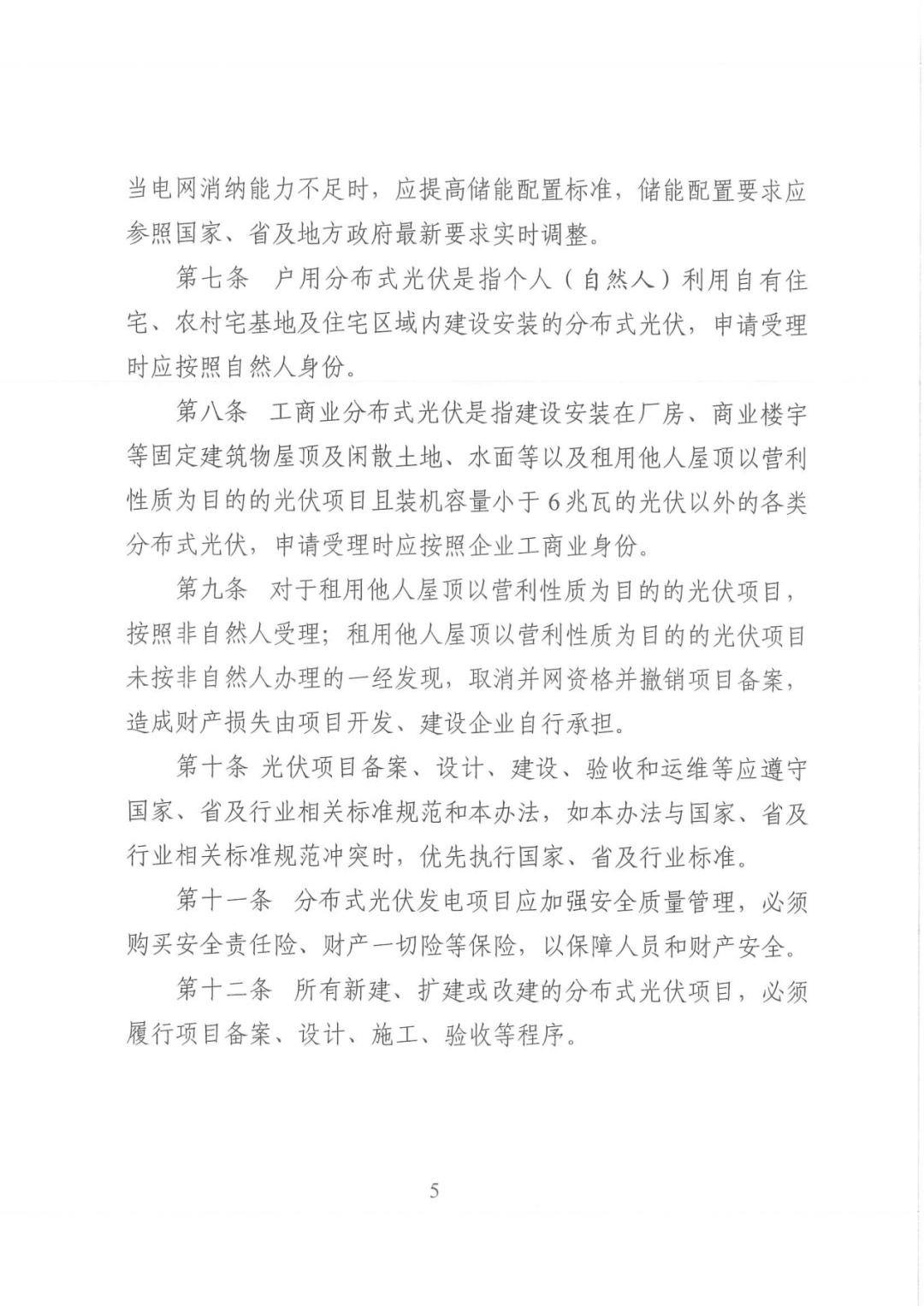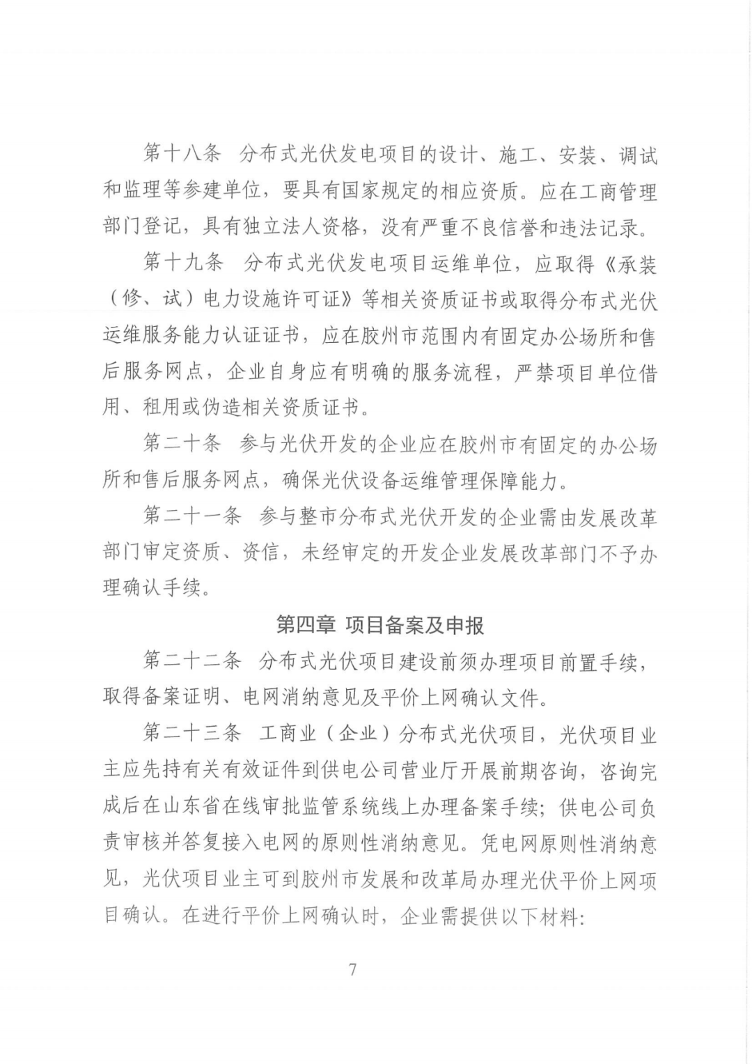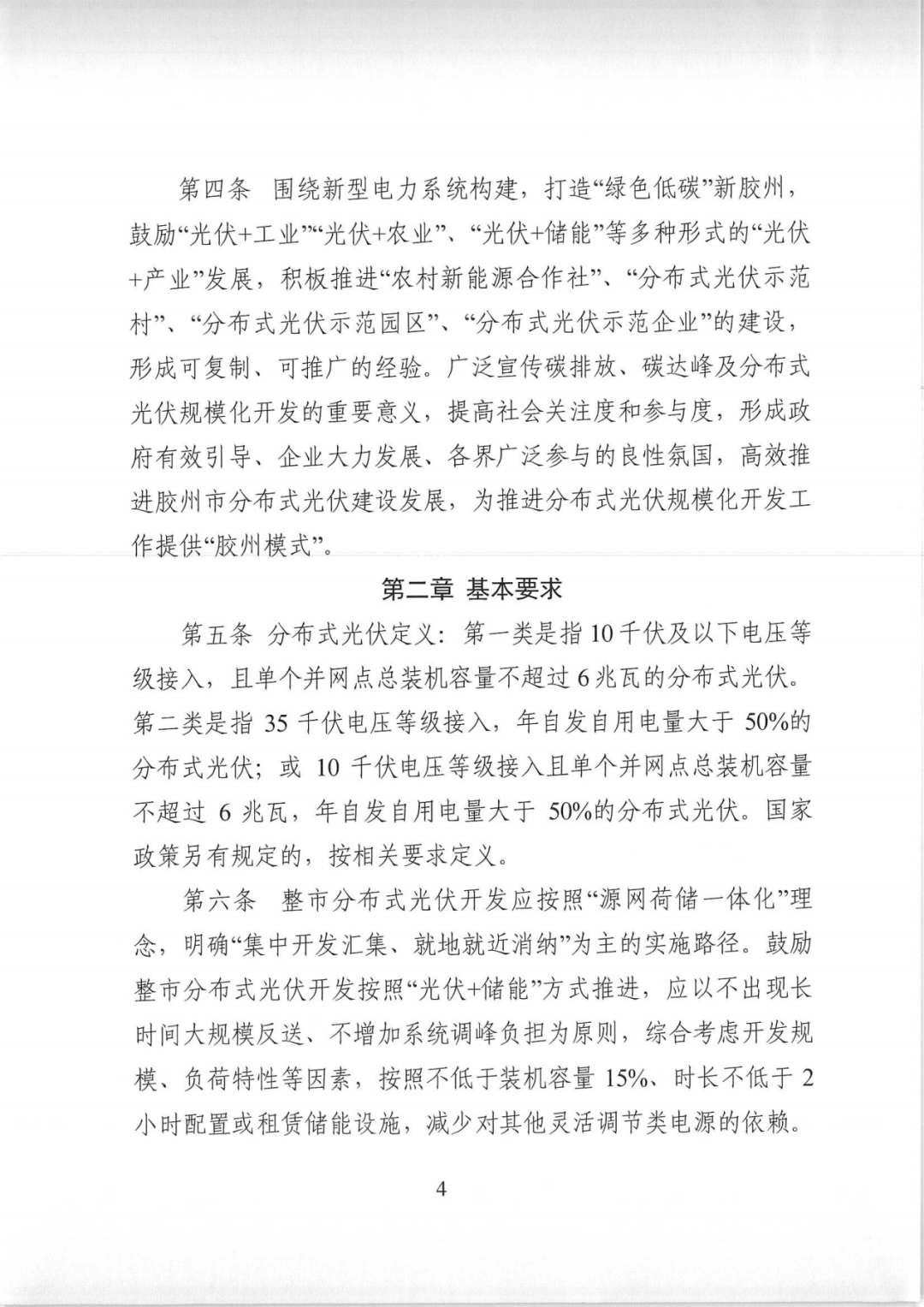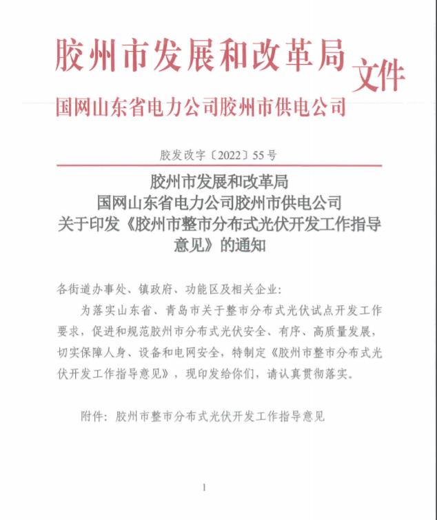 8月29日,山東省膠州市發(fā)改委印發(fā)《膠州市整市分布式光伏開發(fā)工作指導(dǎo)意見》,文件指出,整市屋頂分布式光伏開發(fā),采用“政府主導(dǎo)、市場化運作”模式,本質(zhì)上是分布式光伏集約化規(guī)?;_發(fā),優(yōu)先鼓勵支持采用整體開發(fā)模式,應(yīng)符合優(yōu)先就近就地平衡的電力發(fā)展規(guī)律,順應(yīng)鄉(xiāng)村振興戰(zhàn)略的國家要求,符合國家能源和區(qū)域發(fā)展戰(zhàn)略,應(yīng)在供電公司公布的可開放容量區(qū)域內(nèi)安裝,符合我市分布式光伏規(guī)劃布局。 文件要求,整市分布式光伏開發(fā)應(yīng)按照“源網(wǎng)荷儲一體化”理念,明確“集中開發(fā)匯集、就地就近消納”為主的實施路徑。鼓勵整市分布式光伏開發(fā)按照“光伏+儲能”方式推進,應(yīng)以不出現(xiàn)長時間大規(guī)模反送、不增加系統(tǒng)調(diào)峰負擔(dān)為原則,綜合考慮開發(fā)規(guī)模、負荷特性等因素,按照不低于裝機容量15%、時長不低于2小時配置或租賃儲能設(shè)施,減少對其他靈活調(diào)節(jié)類電源的依賴。當電網(wǎng)消納能力不足時,應(yīng)提高儲能配置標準,儲能配置要求應(yīng)參照國家、省及地方政府最新要求實時調(diào)整。 供電公司每月對外公布全市新增并網(wǎng)和當年全市累計并網(wǎng)的分布式可再生能源裝機規(guī)模。當截至上月底的當年累計新增并網(wǎng)裝機規(guī)模超過電網(wǎng)消納能力時,當月不再答復(fù)電網(wǎng)消納意見,暫緩受理分布式可再生能源接入申請。 文件強調(diào),嚴禁私自增加分布式光伏并網(wǎng)容量。超出備案容量1%,認定為私自增容,一經(jīng)核實,由供電公司予以解網(wǎng),同時下發(fā)整改通知書,用戶整改達標后重新并網(wǎng)。 全文如下:
