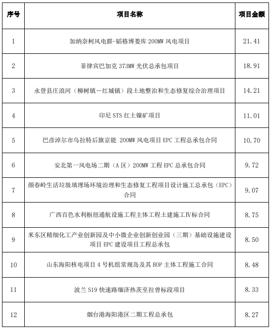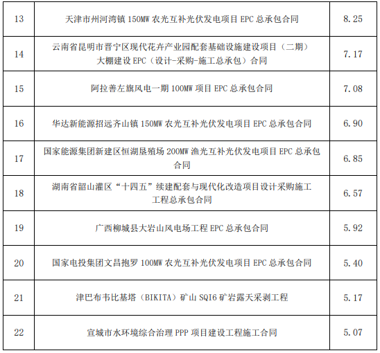 注: 1.能源電力業(yè)務(wù)包括水電、風(fēng)電、太陽能發(fā)電、火電、電網(wǎng)等; 2.水資源與環(huán)境業(yè)務(wù)包括水利、水務(wù)、水環(huán)境治理和水生態(tài)修復(fù)等; 3.基礎(chǔ)設(shè)施業(yè)務(wù)包括市政、房建、鐵路、城市軌道交通、公路、機場、港口與航道等; 4.其他業(yè)務(wù)指除以上三項業(yè)務(wù)外的業(yè)務(wù); 5.上述合同金額統(tǒng)計范圍已包含公司與控股股東中國電力建設(shè)集團有限公司之間資產(chǎn) 置換所涉置入公司。 2022年8月,公司新簽合同金額在人民幣5億元以上的單個項目有: 單位:億元 幣種:人民幣