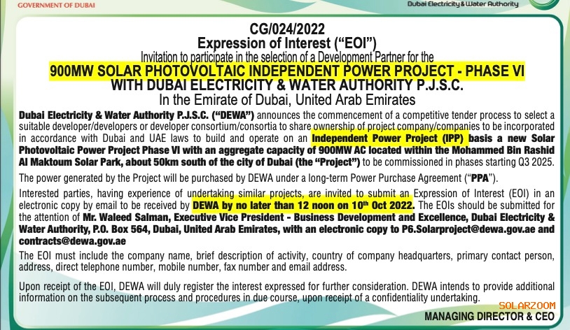 日前,迪拜水電局P.J.S.C.("DEWA")宣布啟動(dòng)競(jìng)爭(zhēng)性招標(biāo)流程,用于選擇合適的開發(fā)商或開發(fā)商聯(lián)合體分享根據(jù)迪拜和阿聯(lián)酋法律成立的項(xiàng)目公司的所有權(quán),以獨(dú)立發(fā)電項(xiàng)目(IPP)方式建設(shè)和運(yùn)營(yíng)一個(gè)太陽能光伏發(fā)電新項(xiàng)目的第六期。 該項(xiàng)目總?cè)萘繛?00MW AC,位于迪拜市南部約50公里處的Mohammed Bin Rashid Al Maktoum太陽能電站內(nèi)("項(xiàng)目"),將于2025年三季度開始分階段投產(chǎn)。 項(xiàng)目發(fā)電將由DEWA根據(jù)長(zhǎng)期購(gòu)電協(xié)議("PPA")購(gòu)買。 意向邀請(qǐng)函顯示,感興趣的各方如有承擔(dān)類似項(xiàng)目的經(jīng)驗(yàn),可通過電子郵件于2022年10月10日中午12點(diǎn)前向DEWA提交意向書(EOI)電子文本。意向書必須包括公司名稱、活動(dòng)簡(jiǎn)介、公司總部所在國(guó)、主要聯(lián)系人、地址、直撥電話號(hào)碼、移動(dòng)電話號(hào)碼、傳真號(hào)碼和電子郵件地址。 收到意向書后,DEWA 會(huì)正式登記意向以供進(jìn)一步審議。在收到保密承諾后,DEWA會(huì)適時(shí)提供有關(guān)后續(xù)進(jìn)展和流程的補(bǔ)充信息。