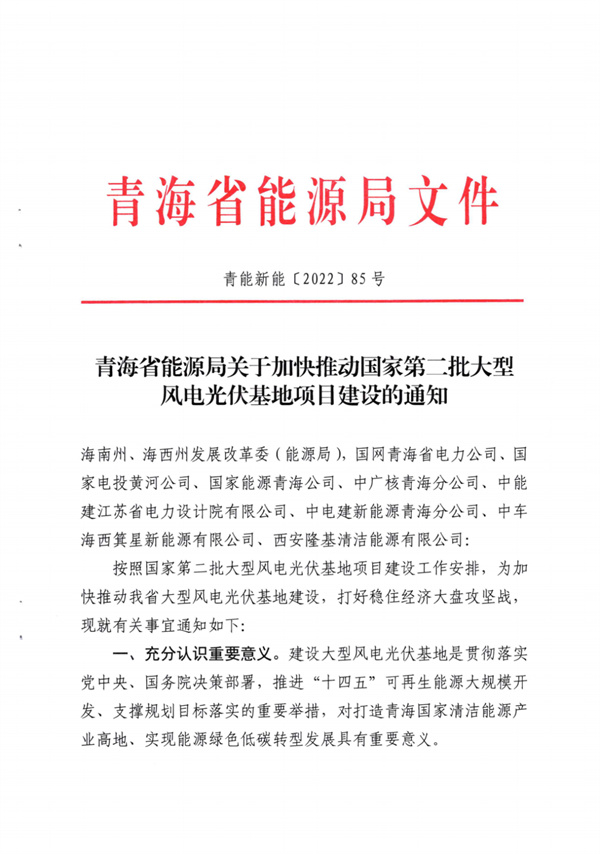 近日,青海省能源局印發(fā)《關(guān)于加快推進(jìn)國家第二批大型風(fēng)電光伏基地項目建設(shè)的通知》,文件顯示,共有7個大型基地項目入圍,總裝機(jī)700萬千瓦,其中包括4個100萬千瓦源網(wǎng)荷儲項目、2個100萬千瓦光伏光熱項目以及1個100萬千瓦風(fēng)光儲項目。業(yè)主涵蓋隆基綠能、國家電投、中能建聯(lián)合江蘇美科、中電建、中廣核、國家能源集團(tuán)、中車等,規(guī)模各100萬千瓦。 根據(jù)項目清單,青海省第二批項目共計將建設(shè)540萬千瓦光伏、120萬千瓦風(fēng)電、40萬千瓦光熱以及100萬千萬/360萬千瓦時儲能。 詳情如下: