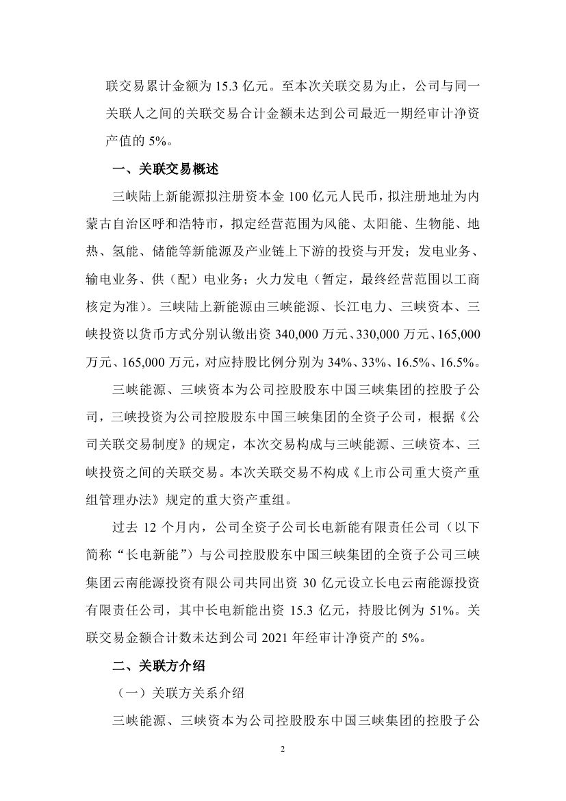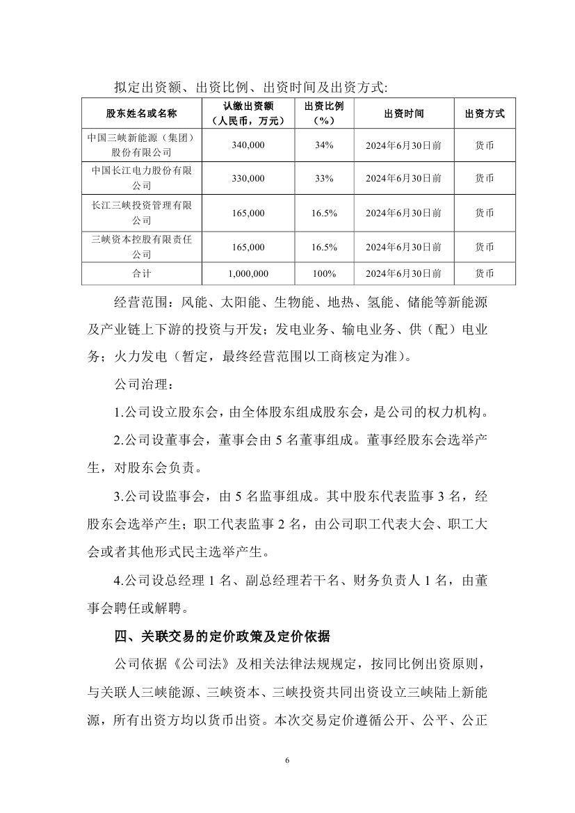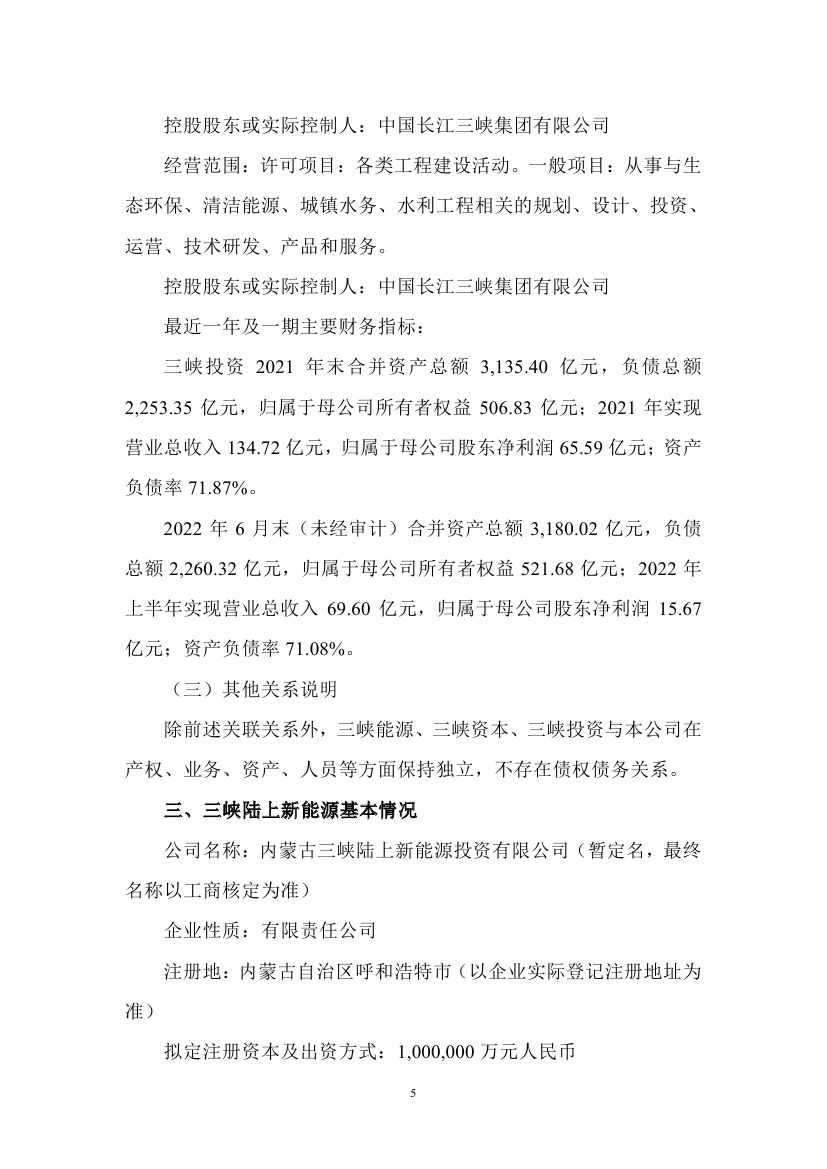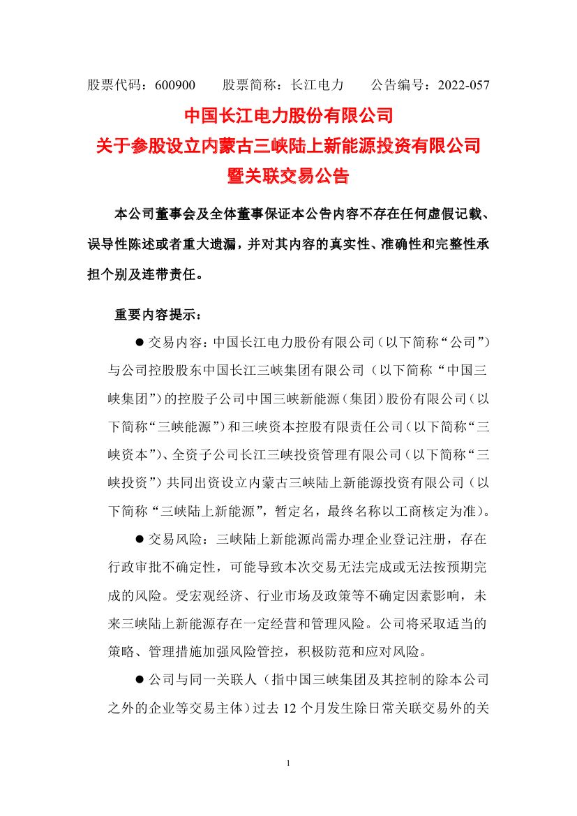 9月29日晚間,長江電力發(fā)布公告稱,公司與公司控股股東三峽集團(tuán)的控股子公司中國三峽新能源(集團(tuán))股份有限公司和三峽資本控股有限責(zé)任公司、全資子公司長江三峽投資管理有限公司共同出資設(shè)立內(nèi)蒙古三峽陸上新能源投資有限公司(簡稱:三峽陸上新能源,暫定名,最終名稱以工商核定為準(zhǔn))。 三峽陸上新能源擬注冊(cè)資本金100億元人民幣,擬注冊(cè)地址為內(nèi)蒙古自治區(qū)呼和浩特市,擬定經(jīng)營范圍為風(fēng)能、太陽能、生物能、地?zé)帷淠?、?chǔ)能等新能源及產(chǎn)業(yè)鏈上下游的投資與開發(fā);發(fā)電業(yè)務(wù)、 輸電業(yè)務(wù)、供(配)電業(yè)務(wù);火力發(fā)電(暫定,最終經(jīng)營范圍以工商核定為準(zhǔn))。 長江電力表示,內(nèi)蒙古自治區(qū)是全國最大、最具潛力的新能源生產(chǎn)基地之一。公司與三峽能源、三峽資本、三峽投資共同出資設(shè)立三峽陸上新能源,是落實(shí)公司發(fā)展戰(zhàn)略的重要舉措,對(duì)公司在內(nèi)蒙古區(qū)域大力開發(fā)新能源大基地項(xiàng)目、拓展新能源資源具有重大戰(zhàn)略意義,可持續(xù)優(yōu)化公司投資結(jié)構(gòu),拓展新發(fā)展空間,進(jìn)一步推進(jìn)公司高質(zhì)量可持續(xù)發(fā)展。