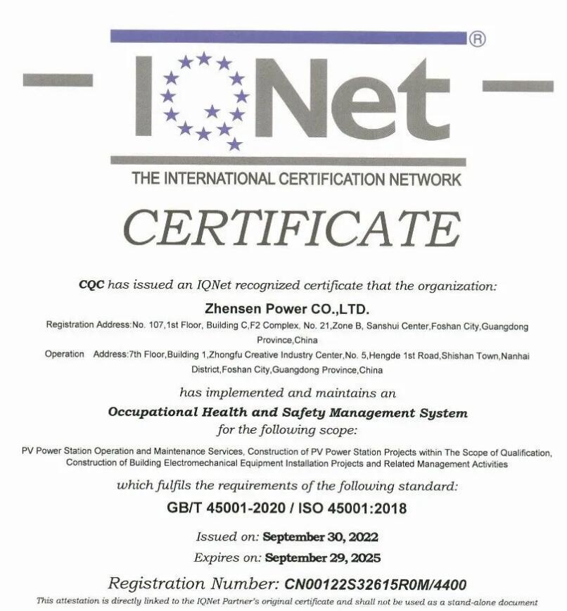 中國質(zhì)量認(rèn)證中心(CQC)是由中國政府批準(zhǔn)設(shè)立、批準(zhǔn)編號為001的 “國字號” 質(zhì)量服務(wù)機(jī)構(gòu),經(jīng)過三十多年的發(fā)展,已經(jīng)成為國內(nèi)規(guī)模性、嚴(yán)謹(jǐn)性及公正性頂級的機(jī)構(gòu),被多國政府和多個國際權(quán)威組織互認(rèn)認(rèn)可。 10月13日,振森電能有限公司歷經(jīng)10個月的體系執(zhí)行,經(jīng)過多輪整改與規(guī)范化要求,通過權(quán)威機(jī)構(gòu)中國質(zhì)量認(rèn)證中心11名專家審核組2個階段的嚴(yán)格考查與審核,順利成為了分布式光伏行業(yè)中僅有通過該認(rèn)證的企業(yè)之一,獲得:《GB/T 50430工程建設(shè)施工企業(yè)質(zhì)量管理認(rèn)證》、《ISO9001質(zhì)量管理體系認(rèn)證》、《ISO14001環(huán)境管理體系認(rèn)證》、《ISO45001職業(yè)健康與安全管理體系認(rèn)證》。 GB/T 50430,是建設(shè)部為加強(qiáng)項(xiàng)目建設(shè)企業(yè)的質(zhì)量管理工作,規(guī)范企業(yè)從項(xiàng)目投標(biāo)、合同簽訂、現(xiàn)場勘測、圖紙?jiān)O(shè)計、編制作業(yè)指導(dǎo)書、人機(jī)料進(jìn)場、過程管理及檢驗(yàn)、內(nèi)部竣工驗(yàn)收、竣工交付驗(yàn)收、檔案移交人員離場、保修服務(wù)等一系列流程的標(biāo)準(zhǔn)。 目的就是通過推動企業(yè)全面實(shí)施企業(yè)質(zhì)量管理規(guī)范,使企業(yè)的一切工作處于良好的受控狀態(tài),促進(jìn)項(xiàng)目建設(shè)企業(yè)質(zhì)量管理有效性的不斷提高。實(shí)現(xiàn)優(yōu)化和鞏固業(yè)務(wù)流程,確保部門之間職責(zé)明確,接口清晰,加強(qiáng)施工監(jiān)督和規(guī)范化管理,加強(qiáng)項(xiàng)目資料規(guī)范化。 從2022年1月份啟動認(rèn)證工作開始,在大半年的實(shí)施過程中,振森電能嚴(yán)格遵守資質(zhì)校驗(yàn)、材料審核和質(zhì)量規(guī)范等流程環(huán)節(jié)。ISO三體系認(rèn)證是我們對于客戶、對于社會的重要承諾——時刻以高標(biāo)準(zhǔn)要求自己,持續(xù)引領(lǐng)高品質(zhì)的產(chǎn)品和服務(wù),承擔(dān)起對員工、客戶以及社會的責(zé)任。 同時,ISO三體系認(rèn)證也是現(xiàn)代化管理的重要標(biāo)志,是公司向公眾展示良好形象和社會責(zé)任的佐證。通過ISO三體系認(rèn)證,標(biāo)志著振森電能各項(xiàng)管理工作進(jìn)一步走向規(guī)范化、標(biāo)準(zhǔn)化。 三個證書的取得,對不斷提高體系運(yùn)行的有效性,不斷提高公司的管理水平,共同推進(jìn)公司的快速發(fā)展有著重要保證。不僅是一種肯定,更說明在各項(xiàng)管理系統(tǒng)等方面已達(dá)到嚴(yán)苛的國際標(biāo)準(zhǔn),表明振森電能有能力穩(wěn)定地提供符合顧客以及相關(guān)方要求的產(chǎn)品。 未來,振森電能將進(jìn)一步優(yōu)化和規(guī)范各項(xiàng)管理制度,嚴(yán)把產(chǎn)品研發(fā)及質(zhì)量監(jiān)控安全關(guān),通過全員參與、全過程管理、全面管理途徑,堅(jiān)持以負(fù)責(zé)任的態(tài)度,對從產(chǎn)品設(shè)計到交付各個環(huán)節(jié)的質(zhì)量嚴(yán)格把控。不斷創(chuàng)新和超越,追求更高的目標(biāo),在工商業(yè)分布式光伏市場上立于不敗之地。