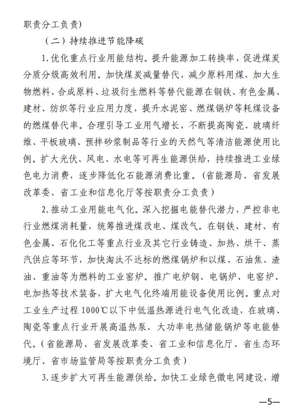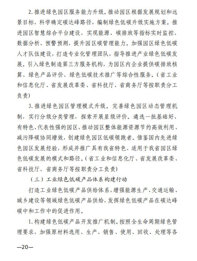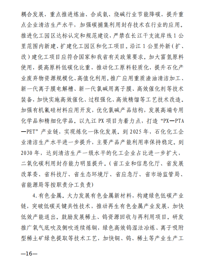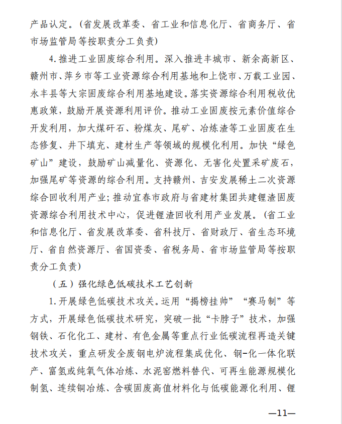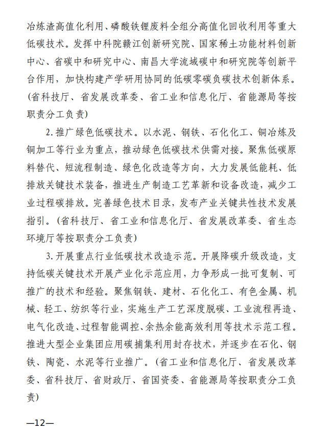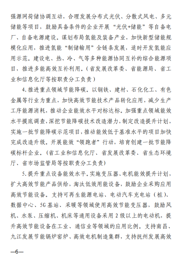 10月10日,江西省工業(yè)和信息化廳、江西省發(fā)展和改革委員會和江西省生態(tài)環(huán)境廳發(fā)布《關(guān)于印發(fā)江西省工業(yè)領(lǐng)域碳達峰實施方案的通知》,《江西省工業(yè)領(lǐng)域碳達峰實施方案》提出,“十四五”期間,江西力爭產(chǎn)業(yè)結(jié)構(gòu)與用能結(jié)構(gòu)優(yōu)化取得積極進展,能源資源利用效率明顯提升,綠色工廠和綠色園區(qū)分別達到200家和50家;到2025年,全省規(guī)模以上工業(yè)單位增加值能耗較2020年下降12%以上?!笆逦濉逼陂g,力爭一批重點產(chǎn)品工藝能效達到國內(nèi)領(lǐng)先水平,基本建立以高效、綠色、循環(huán)、低碳為特征的現(xiàn)代工業(yè)體系;確保工業(yè)領(lǐng)域二氧化碳排放在2030年前達峰。 方案提出,逐步擴大可再生能源供給。加快工業(yè)綠色微電網(wǎng)建設(shè),增強源網(wǎng)荷儲協(xié)調(diào)互動,合理發(fā)展分布式光伏、分散式風電、多元 儲能等項目,鼓勵具備條件的企業(yè)開展“光伏+儲能”等自備電廠、自備電源建設(shè)。謀劃布局氫能及裝備產(chǎn)業(yè),加快新型儲能規(guī)?;瘧?yīng)用,推進氫能“制儲輸用”全鏈條發(fā)展,適時開發(fā)氫能應(yīng)用示范。建設(shè)電、熱、冷、氣等多種能源協(xié)同互補的綜合能源項目,推進多能高效互補利用。 發(fā)揮綠色園區(qū)示范引領(lǐng)作用,聚焦園區(qū)能源資源利用、產(chǎn)業(yè) 發(fā)展、環(huán)境保護等,探索開展綠色園區(qū)低碳升級示范建設(shè),帶動 全省園區(qū)綠色低碳發(fā)展。 推進綠色園區(qū)基礎(chǔ)設(shè)施低碳升級。加快園區(qū)能源基礎(chǔ)設(shè)施建設(shè),推進“光伏上房”、綠色微電網(wǎng)、園區(qū)儲能等項目,鼓勵園區(qū)實施熱電聯(lián)產(chǎn)。 原文如下: