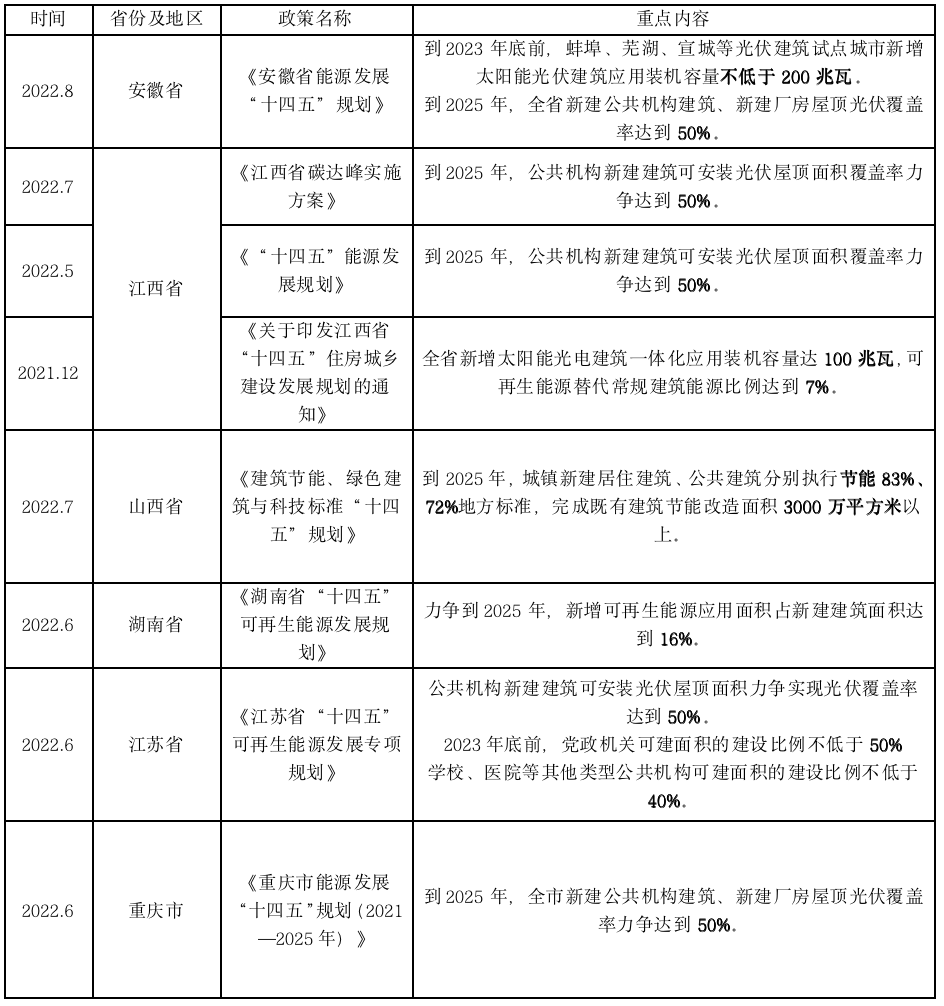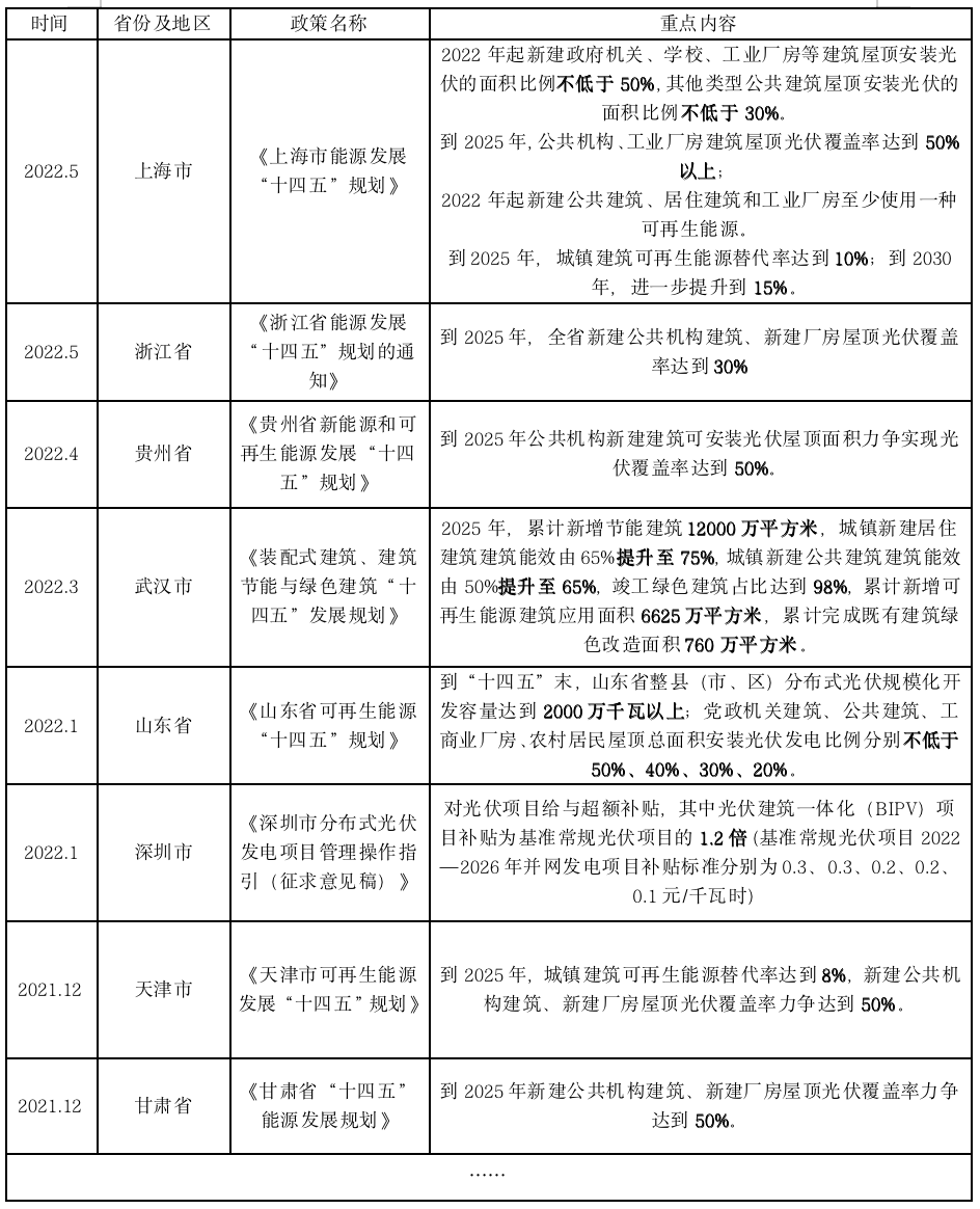 光伏產(chǎn)業(yè),尤其是綠色建筑發(fā)展的政策紅利仍在持續(xù)釋放。近兩年,全國(guó)各省市均在細(xì)化光伏建筑一體化的相關(guān)配套支持政策及發(fā)展目標(biāo)。目前,全國(guó)城鎮(zhèn)新建建筑已經(jīng)全部執(zhí)行節(jié)能強(qiáng)制性標(biāo)準(zhǔn),全面實(shí)現(xiàn)新建建筑節(jié)能。 伴隨著“十四五”發(fā)展規(guī)劃的提出,各省市也相應(yīng)出臺(tái)關(guān)于BIPV的相關(guān)政策和規(guī)劃。部分省市出臺(tái)的BIPV相關(guān)措施涉及綠色建筑光伏裝機(jī)容量、新建BIPV建筑占比和應(yīng)用面積等。 全國(guó)性政策: 住房和城鄉(xiāng)建設(shè)部2022年3月印發(fā)的《“十四五”建筑節(jié)能與綠色建筑發(fā)展規(guī)劃》中提出,到2025年,完成既有建筑節(jié)能改造面積3.5億平方米以上,建設(shè)超低能耗、近零能耗建筑0.5億平方米以上,全國(guó)新增建筑太陽(yáng)能光伏裝機(jī)容量0.5億千瓦以上。