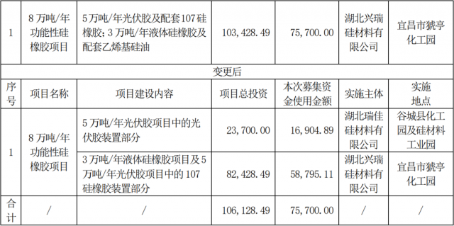 項(xiàng)目概況 項(xiàng)目名稱:40萬噸/年有機(jī)硅新材料項(xiàng)目 實(shí)施單位:湖北興瑞硅材料有限公司 建設(shè)內(nèi)容:主要包括單體合成裝置、分離裝置、二甲水解及環(huán)線分 離裝置、氯甲烷合成裝置、硅粉加工裝置,以及高沸裂解、歧化、鹽酸解析、尾氣焚燒、污水處理、罐區(qū)等裝置。同時,配套建設(shè)綜合樓、配電室、機(jī)柜間、冷凍站、循環(huán)水站等公輔設(shè)施。 建設(shè)地點(diǎn):宜昌新材料產(chǎn)業(yè)園D區(qū) 投資概算:25.13億元 建設(shè)時間:項(xiàng)目分兩期建設(shè),其中項(xiàng)目一期20萬噸/年有機(jī)硅新材料及配套裝置計劃2023年三季度建成投產(chǎn)。項(xiàng)目二期20萬噸/年有機(jī)硅新材料及配套裝置將根據(jù)項(xiàng)目一期實(shí)施情況擇機(jī)推進(jìn)。 近年來,興發(fā)集團(tuán)積極打造有機(jī)硅全產(chǎn)業(yè)鏈競爭優(yōu)勢,通過并購布局工業(yè)硅資源,在宜昌區(qū)域戰(zhàn)略引進(jìn)湖北匯富納米材料股份有限公司、宜昌興邁新材料有限公司、湖北君邦新材料有限公司、湖北興發(fā)凌志新材料有限公司、湖北卡樂爾新材料有限公司、新亞強(qiáng)硅化學(xué)股份有限公司等十余家有機(jī)硅下游細(xì)分領(lǐng)域隱形冠軍企業(yè),構(gòu)建了較為完善的上游硅礦和工業(yè)硅配套、中間單體生產(chǎn)、下游深加工一體的產(chǎn)業(yè)集群。預(yù)計到2024年,該區(qū)域內(nèi)產(chǎn)業(yè)集群對硅氧烷混合環(huán)體新增需求將超過20萬噸,可以完全消化本項(xiàng)目產(chǎn)品。本項(xiàng)目建成后,預(yù)計實(shí)現(xiàn)銷售收入33.95億元、銷售利潤3.44億元、稅后利潤2.27億元。 同日,興發(fā)集團(tuán)發(fā)布關(guān)于變更部分募投項(xiàng)目實(shí)施主體和實(shí)施地點(diǎn)的公告,將公司“8萬噸/年功能性硅橡膠項(xiàng)目”中的子項(xiàng)目“5萬噸/年光伏膠項(xiàng)目”部分裝置進(jìn)行實(shí)施主體和實(shí)施地點(diǎn)的變更:實(shí)施主體由公司全資子公司湖北興瑞硅材料有限公司變更為興瑞公司全資子公司湖北瑞佳硅材料有限公司,實(shí)施地點(diǎn)由宜昌市猇亭化工園變更為谷城縣化工園及硅材料工業(yè)園。 具體情況如下: