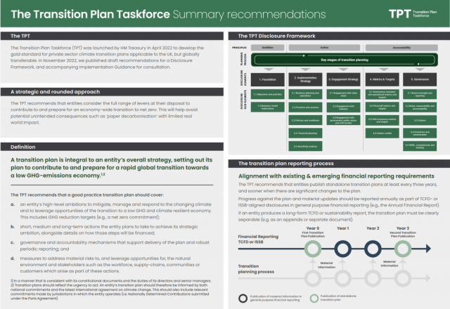 2022年11月8日,即COP27會議的第三天,英國的過渡計(jì)劃工作組( Transition Plan Taskforce,TPT)公布了過渡計(jì)劃披露框架的建議草案,以及實(shí)施指南草案供咨詢。 TPT是由英國財(cái)政部在2022年4月成立的。它的任務(wù)是為私營部門的氣候過渡計(jì)劃制定黃金標(biāo)準(zhǔn),適用于英國,但可在全球范圍內(nèi)轉(zhuǎn)化。這些建議草案是為了支持 “報(bào)告實(shí)體”,即受FCA過渡計(jì)劃披露要求的公司(上市公司和FCA監(jiān)管的資產(chǎn)所有者和資產(chǎn)管理者)。 如果TPT提出的制度被采納,將大大增加報(bào)告實(shí)體的氣候相關(guān)監(jiān)測和報(bào)告負(fù)擔(dān)。報(bào)告實(shí)體將被要求至少每三年發(fā)布一次獨(dú)立的過渡計(jì)劃,此外還需要在一般目的的財(cái)務(wù)報(bào)告中每年報(bào)告該計(jì)劃的進(jìn)展和重大更新。建議草案還將要求報(bào)告實(shí)體確保他們的過渡計(jì)劃在報(bào)告實(shí)體運(yùn)營的所有管轄范圍內(nèi) “參考[溫室氣體減排]國家承諾和最新的氣候變化國際協(xié)議”。