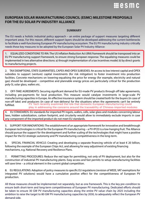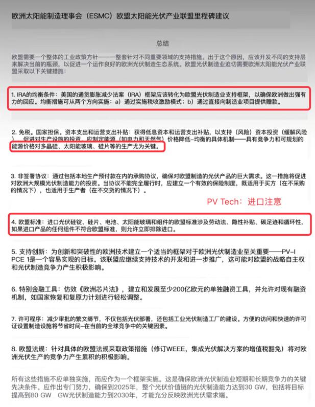 歐洲太陽能制造委員會(ESMC)表示,歐洲需要采取與美國通貨膨脹削減法案(IRA)類似的措施,激發(fā)一個有競爭力的光伏制造生態(tài)系統(tǒng)。 歐洲太陽能光伏聯(lián)盟即將于12月9日正式成立,在聯(lián)盟成立前夕,歐洲光伏制造業(yè)代表機構(gòu)ESMC給歐盟委員會發(fā)出了一封信,信中概述了其對制造業(yè)給與更廣泛的支持和投資的愿望。 為了令歐盟取得最大的成功,這封信概述了八項被稱為"快速、具體、成熟和全面"的措施(以下簡稱“歐8條”建議)。八項措施最重要的首要要求是與美國IRA保持一致,采取稅收優(yōu)惠或直接撥款給制造項目的方式,同時還對光伏產(chǎn)品進口提出了標(biāo)準(zhǔn)建議。 信中稱,"放眼全球,由于激烈的競爭和不公平的競爭環(huán)境,歐洲的光伏制造業(yè)目前幾乎不存在。" 歐洲太陽能光伏聯(lián)盟將致力于解決這些問題,ESMC秘書長Johan Lindahl表示,"這是在整條光伏價值鏈中,發(fā)展具有競爭力的歐洲光伏制造業(yè)的一個重要基石。" 歐洲太陽能光伏聯(lián)盟表示,歡迎歐盟2025年30GW的光伏制造目標(biāo),但建議2030年實現(xiàn)80GW更高擴張目標(biāo)。 為了降低投資風(fēng)險、允許更高的靈活性,聯(lián)盟要求設(shè)立一個200億歐元(合210億美元)的特別融資工具,類似于為提高歐盟在半導(dǎo)體技術(shù)領(lǐng)域的彈性和競爭力而推出的《歐洲芯片法案》。 信中還強調(diào),重要的承購協(xié)議是發(fā)展歐洲制造業(yè)文化的關(guān)鍵措施,這可以在其他國家給予的重大激勵措施面前,推動對本土制造光伏產(chǎn)品的需求。 今年,印度推出了兩項刺激措施,一項是對進口組件和電池征收基本關(guān)稅及產(chǎn)能掛鉤激勵計劃,目的是增加65GW產(chǎn)能。另一項措施是取消了制造廠審批的繁文縟節(jié)。 此前,歐盟根據(jù)REPowerEU計劃出臺了一項緊急法規(guī),要求縮短光伏開發(fā)的許可時間。ESMC表示,希望將這種“積極行政沉默”原則擴展到制造許可流程。 ESMC政策主管?ygimantas Vai?iūnas表示:“支持性政策是歐洲光伏產(chǎn)業(yè)競爭力的支柱。鑒于美國IRA帶來的緊迫局面,歐洲光伏制造業(yè)已經(jīng)火燒眉毛?!?/span>