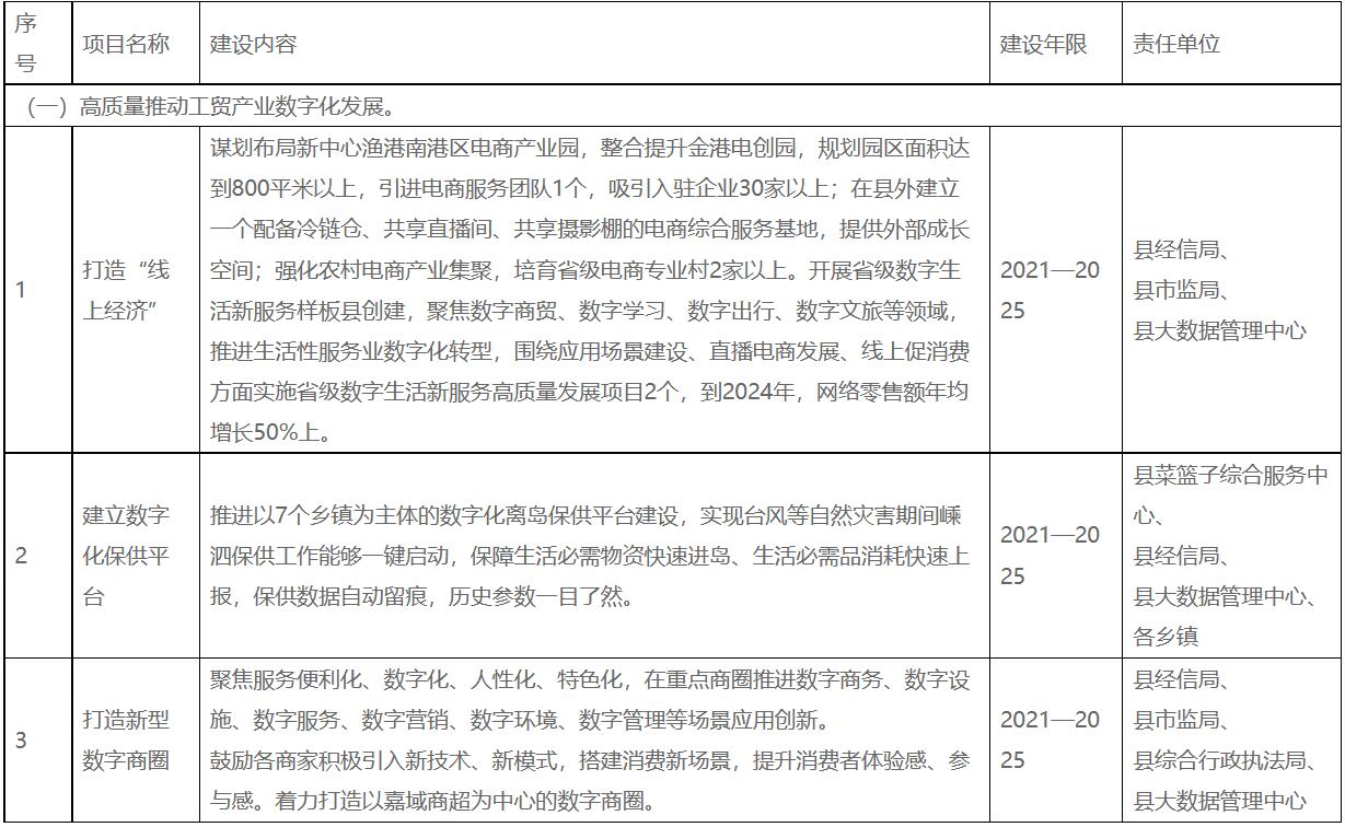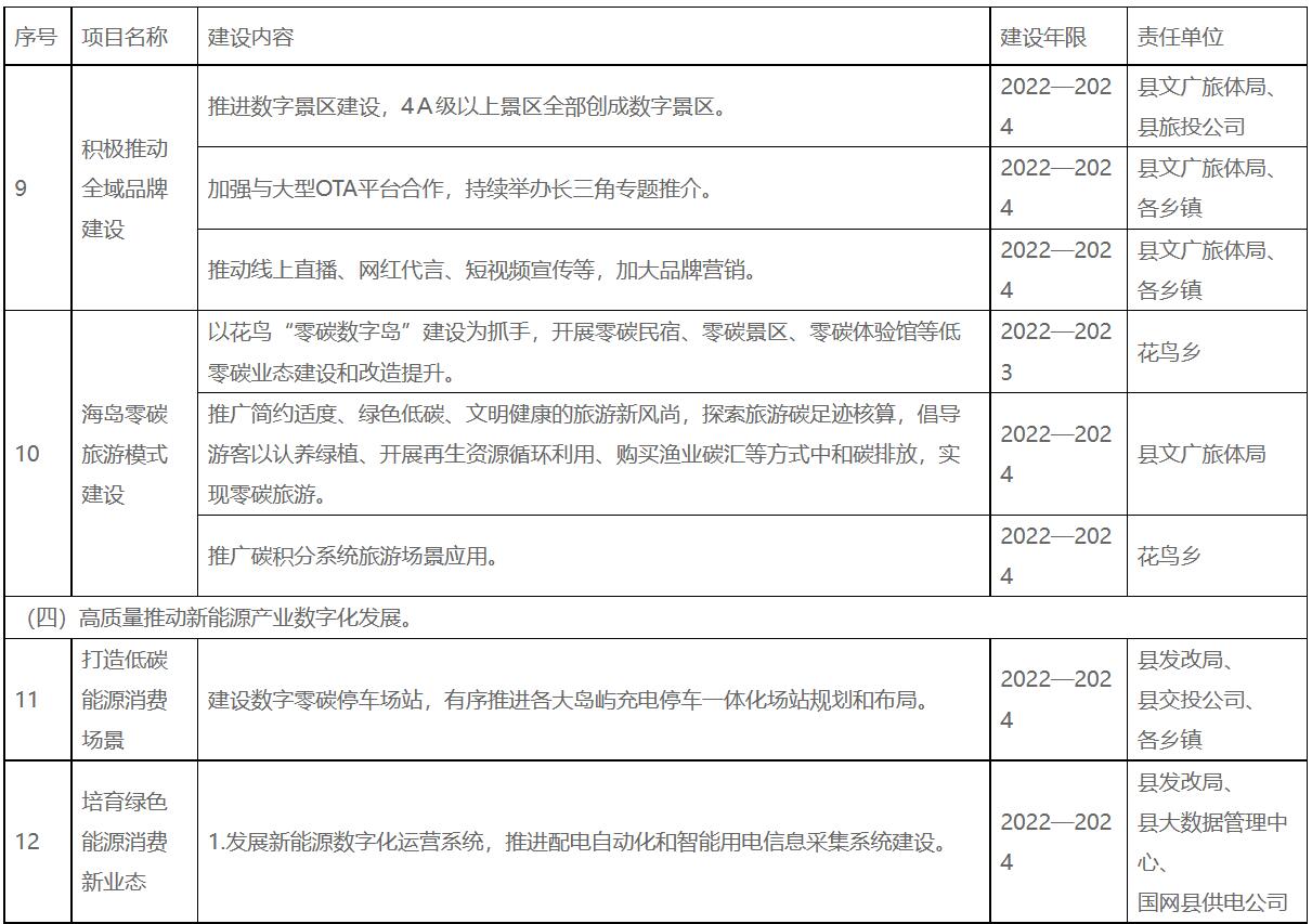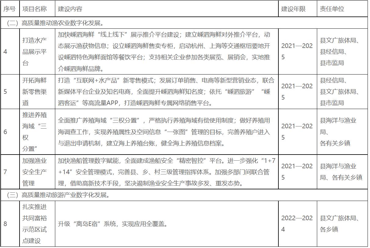 三、主要任務(wù)和重點工程 (一)提升數(shù)字創(chuàng)新能力。 1.打造一個創(chuàng)新平臺。 提升嵊泗海洋科技研究所能級,加大水產(chǎn)養(yǎng)殖科技攻關(guān)力度,積極對接高校院所,突破厚殼貽貝三倍體繁育技術(shù)、南美白對蝦良種培育關(guān)鍵技術(shù)等,增強良種供給能力。整合海洋科技研究所基地和縣養(yǎng)殖服務(wù)中心“產(chǎn)學研”中試基地,建設(shè)貽貝種質(zhì)資源保護和良種繁育基地,加強本地種苗培育技術(shù)研發(fā),培育一批特色水產(chǎn)養(yǎng)殖苗種。 2.培育一批主體企業(yè)。 大力實施“放水養(yǎng)魚”行動、“雛鷹行動”“雄鷹行動”等,推動企業(yè)結(jié)構(gòu)優(yōu)化、制度創(chuàng)新、層次提升。發(fā)揮企業(yè)創(chuàng)新主體作用,實施新一輪高新技術(shù)企業(yè)和科技型中小企業(yè)“雙倍增”行動計劃。積極引進一批海洋領(lǐng)域高科技企業(yè)。推動平臺經(jīng)濟規(guī)范健康發(fā)展,圍繞生產(chǎn)生活各領(lǐng)域,積極引培一批平臺型企業(yè)。 3.培養(yǎng)一批創(chuàng)新人才。 加強與上海合作,依托在滬“人才飛地”,引進一批專業(yè)數(shù)字人才。加大科技交流與合作,加強與浙江海洋大學、浙江大學海洋學院等在舟高等院校合作,積極采取靈活機制,引進各類人才和技術(shù)。創(chuàng)新人才激勵機制,以“揭榜掛帥”“股權(quán)激勵”“聚才計劃”以及“一事一議”“一人一策”等方式招攬和培育人才,大力集聚科技創(chuàng)新人才。 (二)謀劃培育特色數(shù)字產(chǎn)業(yè)。 1.培育大數(shù)據(jù)服務(wù)業(yè)。 圍繞數(shù)據(jù)全生命周期,重點發(fā)展數(shù)據(jù)清洗、脫敏、挖掘分析、可視化等大數(shù)據(jù)服務(wù)。打造服務(wù)政府、服務(wù)社會、服務(wù)產(chǎn)業(yè)的成熟應(yīng)用場景,以數(shù)據(jù)創(chuàng)新帶動管理創(chuàng)新和模式創(chuàng)新,促進數(shù)字醫(yī)療、數(shù)字交通、數(shù)字文旅、數(shù)字教育、數(shù)字養(yǎng)殖、數(shù)字監(jiān)管、數(shù)字能源等模式快速發(fā)展。引進大數(shù)據(jù)中心,提供包括漁船管理、漁業(yè)資源、漁船安全等重點領(lǐng)域的探測與監(jiān)控服務(wù),提高海洋應(yīng)用領(lǐng)域云服務(wù)能力。圍繞數(shù)據(jù)資源、行業(yè)應(yīng)用、數(shù)據(jù)安全、數(shù)據(jù)維護等方面,梳理重點大數(shù)據(jù)技術(shù)產(chǎn)品、服務(wù)產(chǎn)品,繪制大數(shù)據(jù)產(chǎn)業(yè)圖譜,整合現(xiàn)有大數(shù)據(jù)服務(wù)資源,培育或引進1—2家發(fā)展?jié)摿Υ?、技術(shù)實力強、服務(wù)本地的大數(shù)據(jù)服務(wù)企業(yè),支持本地數(shù)字化改革、物流產(chǎn)業(yè)、旅游產(chǎn)業(yè)、漁業(yè)、電子商務(wù)、數(shù)字城市、網(wǎng)絡(luò)安全服務(wù)等領(lǐng)域。 2.布局新能源產(chǎn)業(yè)。 挖掘海洋資源優(yōu)勢,大力支持新能源產(chǎn)業(yè)發(fā)展,積極發(fā)展新能源數(shù)字裝備產(chǎn)業(yè),鼓勵發(fā)展智能光伏產(chǎn)業(yè),重點培育發(fā)展新一代高效太陽能電池組件、智能化光伏生產(chǎn)設(shè)備等光伏電站配套產(chǎn)業(yè),提升配套部件供應(yīng)能力,積極發(fā)展高效光伏材料、零部件與裝備產(chǎn)業(yè),提高光伏產(chǎn)品和裝備本地配套率,持續(xù)降低光伏發(fā)電成本;重點發(fā)展光伏建筑一體化(BIPV)技術(shù)、光伏發(fā)電監(jiān)控智能化云平臺、智能光伏儲能一體機、高效光伏并網(wǎng)電源設(shè)備,培育新能源集成應(yīng)用服務(wù)一體型企業(yè)。以屋頂分布式光伏開發(fā)國家試點為契機,大力發(fā)展分布式光伏,推進大洋山高效養(yǎng)殖暨屋頂分布式光伏示范基地項目、整縣屋頂分布式光伏試點項目建設(shè),結(jié)合嵊泗海島優(yōu)勢,重點發(fā)展集中式光伏電站。以打造氫能海上供應(yīng)鏈為契機,充分利用海上風電、光伏等富余電力資源,積極引導風電開發(fā)企業(yè)加快海上風電制氫儲氫技術(shù)研發(fā),在小洋山、灘滸等島上,規(guī)劃布局基于風電和光伏的制氫工廠,積極發(fā)展氫能產(chǎn)業(yè)。開發(fā)海島太陽能、海上風能、潮汐能等可再生能源,實施漁光互補等一批清潔能源項目、綠華花鳥雙島聯(lián)動零碳數(shù)字島項目、黃沙漁人碼頭波浪能試驗項目等項目建設(shè)。加快打造海上風電運維基地,大力引進有實力的風電運維企業(yè),加快大小洋山海上運維基地建設(shè)。強化浙滬新能源領(lǐng)域合作,做大做強油氣儲運、分撥、交易等業(yè)態(tài),推進國際油氣儲運基地建設(shè)。加快LNG冷能利用、油氣貿(mào)易等關(guān)聯(lián)產(chǎn)業(yè)落地,加快推進上海LNG一期儲罐擴建工程冷能發(fā)電項目建設(shè),打造小洋山LNG接收中心。 3.培育數(shù)字文化創(chuàng)意產(chǎn)業(yè)。 依托嵊泗的區(qū)位優(yōu)勢,加強與上海的合作交流,探索發(fā)展文化創(chuàng)意產(chǎn)業(yè),發(fā)揮海洋文化IP優(yōu)勢,豐富數(shù)字文創(chuàng)內(nèi)容和形式,深入開展海洋自然和文化遺產(chǎn)調(diào)查與挖掘保護,加強對海洋非物質(zhì)文化遺產(chǎn)進行數(shù)字化轉(zhuǎn)化和開發(fā),積極開發(fā)嵊泗漁歌、漁民畫等海洋文化文創(chuàng)研發(fā)項目,充分利用語