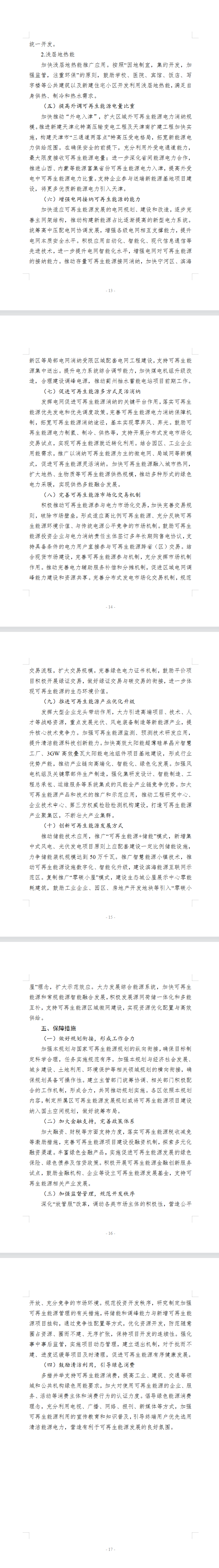 根據(jù)其“十三五”光伏累計(jì)裝機(jī)163.6萬千瓦、風(fēng)電裝機(jī)84.5萬千瓦的發(fā)展成績來看,即意味著“十四五”天津市光伏新增裝機(jī)規(guī)劃為4GW,風(fēng)電新增裝機(jī)近1.2GW。 去年8月,天津市發(fā)改委曾公示了《關(guān)于天津市2021-2022年風(fēng)電、光伏發(fā)電項(xiàng)目開發(fā)建設(shè)方案》,涉及光伏、風(fēng)電規(guī)模共計(jì)5.3GW,新增光伏項(xiàng)目4.32GW,風(fēng)電項(xiàng)目0.98GW。結(jié)合其“十四五”規(guī)劃來看,預(yù)計(jì)該批項(xiàng)目基本為天津“十四五”重點(diǎn)建設(shè)項(xiàng)目。 此外,文件強(qiáng)調(diào)要集散并重加快光伏發(fā)電開發(fā),充分挖掘屋頂資源潛力,結(jié)合電力體制改革,加快發(fā)展分布式光伏發(fā)電;統(tǒng)籌土地資源利用、電網(wǎng)消納和生態(tài)保護(hù),大力推進(jìn)集中式光伏發(fā)電。 分布式光伏方面,推動(dòng)光伏建筑一體化應(yīng)用,促進(jìn)光伏發(fā)電與城市建筑、基礎(chǔ)設(shè)施等要素融合發(fā)展,鼓勵(lì)新建建筑同步安裝光伏發(fā)電設(shè)施或預(yù)留安裝條件,政府投資項(xiàng)目優(yōu)先采用光伏發(fā)電滿足部分用能需求。支持利用工業(yè)園區(qū)、學(xué)校、醫(yī)院、商場、寫字樓等公共建筑,以及機(jī)場、車站、高速公路服務(wù)區(qū)等交通設(shè)施,推廣分布式光伏發(fā)電系統(tǒng)。鼓勵(lì)居民在自有產(chǎn)權(quán)住宅屋頂建設(shè)戶用分布式光伏。推進(jìn)整區(qū)(鎮(zhèn))屋頂分布式光伏開發(fā)試點(diǎn)。 集中式光伏方面,按照“優(yōu)先存量、優(yōu)化增量”的原則,結(jié)合土地、電網(wǎng)等資源條件,有效利用坑塘水面、農(nóng)業(yè)設(shè)施,推進(jìn)漁光互補(bǔ)、農(nóng)光互補(bǔ)等復(fù)合型光伏項(xiàng)目建設(shè);盤活荒山荒地、鹽場、沿海灘涂等資源,開展鹽光互補(bǔ)、水面光伏等項(xiàng)目建設(shè),推動(dòng)濱海新區(qū)“鹽光互補(bǔ)”百萬千瓦級(jí)基地建設(shè)。拓展“光伏+”綜合應(yīng)用領(lǐng)域,探索“光伏+制氫”、“光伏+曬鹽”、“光伏+旅游”等綜合應(yīng)用模式。充分發(fā)揮風(fēng)、光資源互補(bǔ)優(yōu)勢(shì),鼓勵(lì)已投產(chǎn)風(fēng)電場建設(shè)風(fēng)光互補(bǔ)光伏電站。 要提高外調(diào)可再生能源電量比重,加快推動(dòng)“外電入津”,擴(kuò)大區(qū)域外可再生能源電力消納規(guī)模。推進(jìn)新建天津北特高壓輸變電工程及天津南擴(kuò)建工程加快實(shí)施,構(gòu)建天津市“三通道兩落點(diǎn)”特高壓受電格局,拓寬新能源電力供給范圍。在確保安全的前提下,充分利用外受電通道能力,最大限度接收可再生能源電量;進(jìn)一步深化省間能源電力合作,推進(jìn)山西、內(nèi)蒙等能源富集省份可再生能源電力入津,提高外受電中可再生能源電力比重。支持企業(yè)參與送端新能源基地項(xiàng)目建設(shè),將更多優(yōu)質(zhì)新能源電力引入天津。 推進(jìn)可再生能源產(chǎn)業(yè)優(yōu)化升級(jí),發(fā)揮大型企業(yè)龍頭帶動(dòng)作用,大力引進(jìn)高端項(xiàng)目、技術(shù)、人才等戰(zhàn)略資源,重點(diǎn)發(fā)展光伏、風(fēng)電裝備制造等新能源產(chǎn)業(yè),提升核心技術(shù)競爭力。加強(qiáng)可再生能源監(jiān)測、預(yù)測技術(shù)研發(fā)應(yīng)用,提升清潔能源科技創(chuàng)新能力。加快高效太陽能超薄硅單晶片智慧工廠、3GW高效疊瓦太陽能電池組件項(xiàng)目基地建設(shè),形成行業(yè)優(yōu)勢(shì)產(chǎn)能,推動(dòng)產(chǎn)業(yè)鏈向高端化、智能化、綠色化發(fā)展。