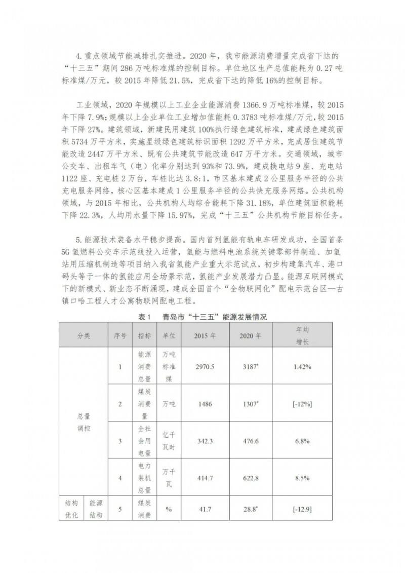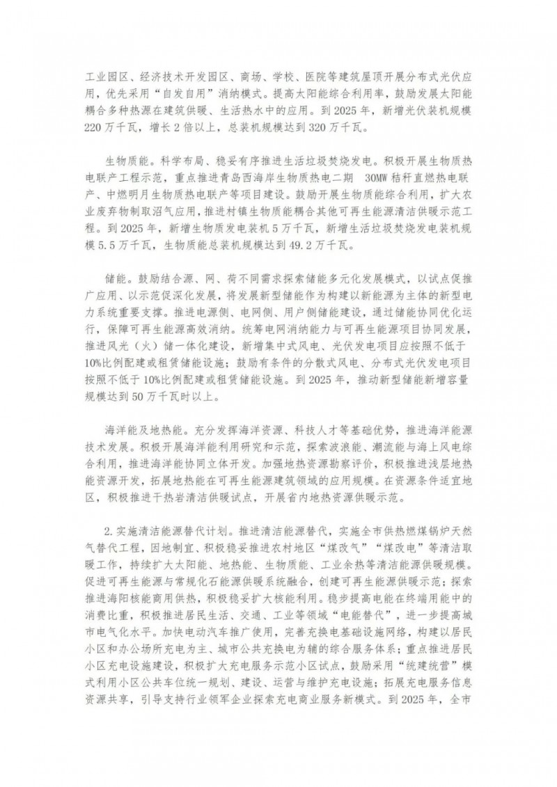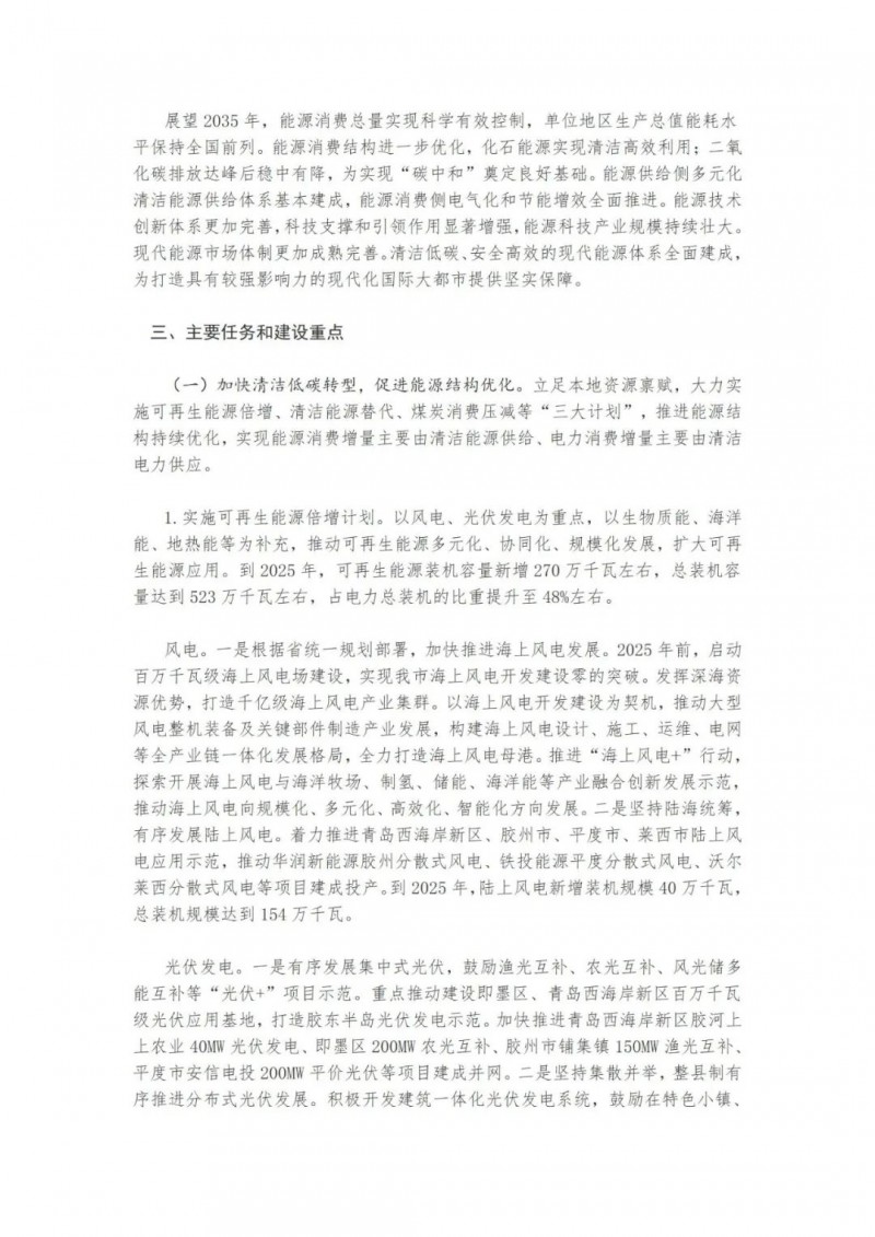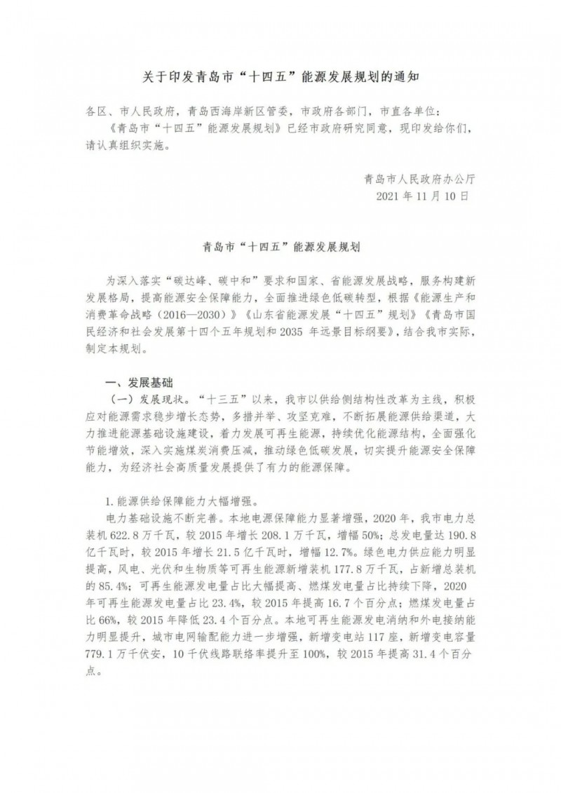 青島“十四五”能源規(guī)劃公示:風(fēng)光新增2.6GW,配儲(chǔ)不低于10%近日,山東青島市人民政府辦公廳印發(fā)了《關(guān)于印發(fā)青島市“十四五”能源發(fā)展規(guī)劃的通知》。提出了青島市“十四五”能源發(fā)展的主要任務(wù)和建設(shè)重點(diǎn)。實(shí)施可再生能源倍增計(jì)劃。以風(fēng)電、光伏發(fā)電為重點(diǎn),以生物質(zhì)能、海洋能、地?zé)崮艿葹檠a(bǔ)充。到2025年,可再生能源裝機(jī)容量新增270萬千瓦左右,總裝機(jī)容量達(dá)到523萬千瓦左右,占電力總裝機(jī)的比重提升至48%左右。 儲(chǔ)能方面: 鼓勵(lì)結(jié)合源、網(wǎng)、荷不同需求探索儲(chǔ)能多元化發(fā)展模式,以試點(diǎn)促推廣應(yīng)用、以示范促深化發(fā)展,將發(fā)展新型儲(chǔ)能作為構(gòu)建以新能源為主體的新型電力系統(tǒng)重要支撐。推進(jìn)電源側(cè)、電網(wǎng)側(cè)、用戶側(cè)儲(chǔ)能建設(shè),通過儲(chǔ)能協(xié)同優(yōu)化運(yùn)行,保障可再生能源高效消納。統(tǒng)籌電網(wǎng)消納能力與可再生能源項(xiàng)目協(xié)同發(fā)展,推進(jìn)風(fēng)光(火)儲(chǔ)一體化建設(shè),新增集中式風(fēng)電、光伏發(fā)電項(xiàng)目應(yīng)按照不低于10%比例配建或租賃儲(chǔ)能設(shè)施;鼓勵(lì)有條件的分散式風(fēng)電、分布式光伏發(fā)電項(xiàng)目按照不低于10%比例配建或租賃儲(chǔ)能設(shè)施。到2025年,推動(dòng)新型儲(chǔ)能新增容量規(guī)模達(dá)到50萬千瓦時(shí)以上。 光伏方面: 一是有序發(fā)展集中式光伏,鼓勵(lì)漁光互補(bǔ)、農(nóng)光互補(bǔ)、風(fēng)光儲(chǔ)多能互補(bǔ)等“光伏+”項(xiàng)目示范。重點(diǎn)推動(dòng)建設(shè)即墨區(qū)、青島西海岸新區(qū)百萬千瓦級光伏應(yīng)用基地,打造膠東半島光伏發(fā)電示范。加快推進(jìn)青島西海岸新區(qū)膠河上上農(nóng)業(yè)40MW光伏發(fā)電、即墨區(qū)200MW農(nóng)光互補(bǔ)、膠州市鋪集鎮(zhèn)150MW漁光互補(bǔ)、平度市安信電投200MW平價(jià)光伏等項(xiàng)目建成并網(wǎng)。 二是堅(jiān)持集散并舉,整縣制有序推進(jìn)分布式光伏發(fā)展。積極開發(fā)建筑一體化光伏發(fā)電系統(tǒng),鼓勵(lì)在特色小鎮(zhèn)、工業(yè)園區(qū)、經(jīng)濟(jì)技術(shù)開發(fā)園區(qū)、商場、學(xué)校、醫(yī)院等建筑屋頂開展分布式光伏應(yīng)用,優(yōu)先采用“自發(fā)自用”消納模式。提高太陽能綜合利用率,鼓勵(lì)發(fā)展太陽能耦合多種熱源在建筑供暖、生活熱水中的應(yīng)用。到2025年,新增光伏裝機(jī)規(guī)模220萬千瓦,增長2倍以上,總裝機(jī)規(guī)模達(dá)到320萬千瓦。 風(fēng)電方面: 一是根據(jù)省統(tǒng)一規(guī)劃部署,加快推進(jìn)海上風(fēng)電發(fā)展。2025年前,啟動(dòng)百萬千瓦級海上風(fēng)電場建設(shè),實(shí)現(xiàn)青島市海上風(fēng)電開發(fā)建設(shè)零的突破。發(fā)揮深海資源優(yōu)勢,打造千億級海上風(fēng)電產(chǎn)業(yè)集群。以海上風(fēng)電開發(fā)建設(shè)為契機(jī),推動(dòng)大型風(fēng)電整機(jī)裝備及關(guān)鍵部件制造產(chǎn)業(yè)發(fā)展,構(gòu)建海上風(fēng)電設(shè)計(jì)、施工、運(yùn)維、電網(wǎng)等全產(chǎn)業(yè)鏈一體化發(fā)展格局,全力打造海上風(fēng)電母港。推進(jìn)“海上風(fēng)電+”行動(dòng),探索開展海上風(fēng)電與海洋牧場、制氫、儲(chǔ)能、海洋能等產(chǎn)業(yè)融合創(chuàng)新發(fā)展示范,推動(dòng)海上風(fēng)電向規(guī)?;⒍嘣?、高效化、智能化方向發(fā)展。 二是堅(jiān)持陸海統(tǒng)籌,有序發(fā)展陸上風(fēng)電。著力推進(jìn)青島西海岸新區(qū)、膠州市、平度市、萊西市陸上風(fēng)電應(yīng)用示范,推動(dòng)華潤新能源膠州分散式風(fēng)電、鐵投能源平度分散式風(fēng)電、沃爾萊西分散式風(fēng)電等項(xiàng)目建成投產(chǎn)。到2025年,陸上風(fēng)電新增裝機(jī)規(guī)模40萬千瓦,總裝機(jī)規(guī)模達(dá)到154萬千瓦。 以下是原文件: