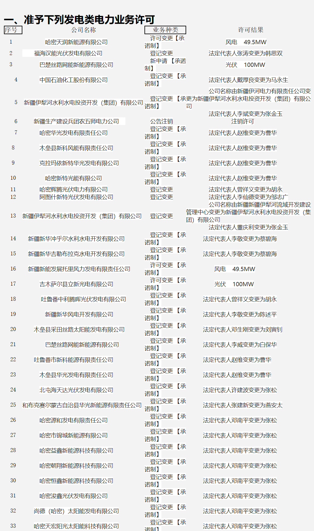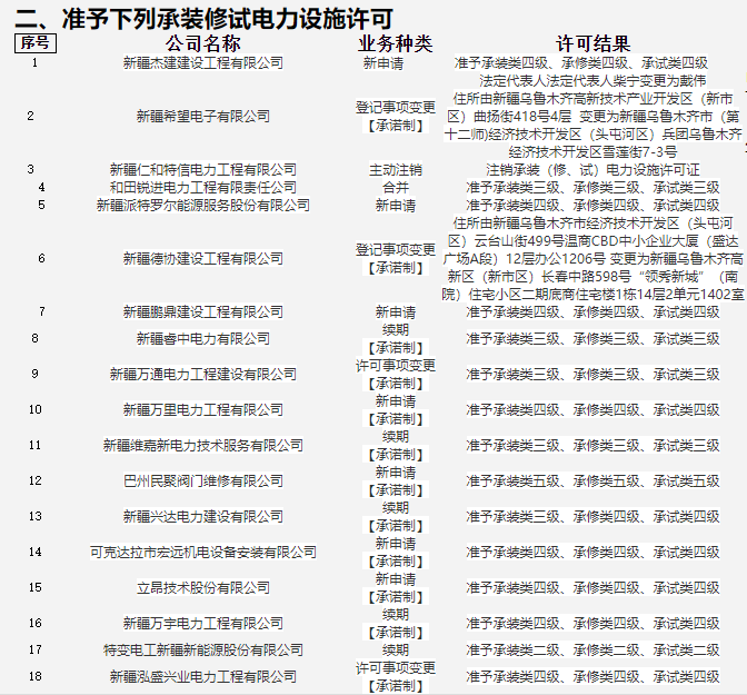 據(jù)新疆能監(jiān)辦消息,日前,國家能源局新疆監(jiān)管辦發(fā)布2023年第1號行政許可公告,經(jīng)審查,共有33家企業(yè)準予發(fā)電類電力業(yè)務(wù)許可。 原文見下: 行政許可公告 (2023年第1號) 根據(jù)《電力業(yè)務(wù)許可證管理規(guī)定》及《承裝(修、試)電力設(shè)施許可證管理辦法》36號令相關(guān)規(guī)定,經(jīng)國家能源局新疆監(jiān)管辦公室審查,做出下列許可決定,現(xiàn)公告如下: