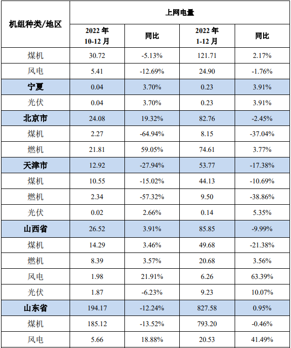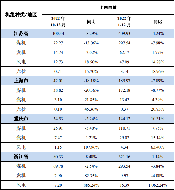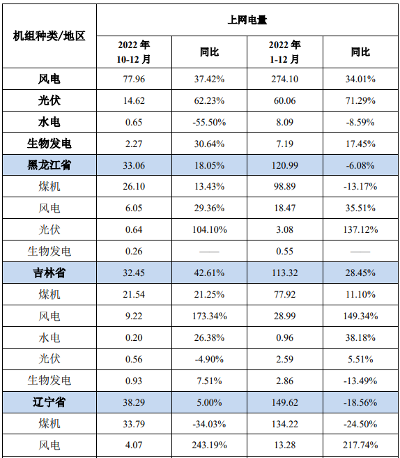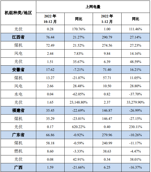 1月17日,華能國際發(fā)布2022年全年上網(wǎng)電量完成情況公告,2022年第四季度,公司中國境內(nèi)各運行電廠按合并報表口徑完成上網(wǎng)電量1050.40億千瓦時,同比下降2.32%;2022年,公司中國境內(nèi)各運行電廠按合并報表口徑累計完成上網(wǎng)電量4251.86億千瓦時,同比下降1.44%;2022年全年公司中國境內(nèi)各運行電廠平均上網(wǎng)結(jié)算電價為509.92元/兆瓦時,同比上升18.04%。2022年全年,公司市場化交易電量比例為88.40%,同比增長27個百分點。 公司境內(nèi)各區(qū)域上網(wǎng)電量(以億千瓦時計)具體如下: