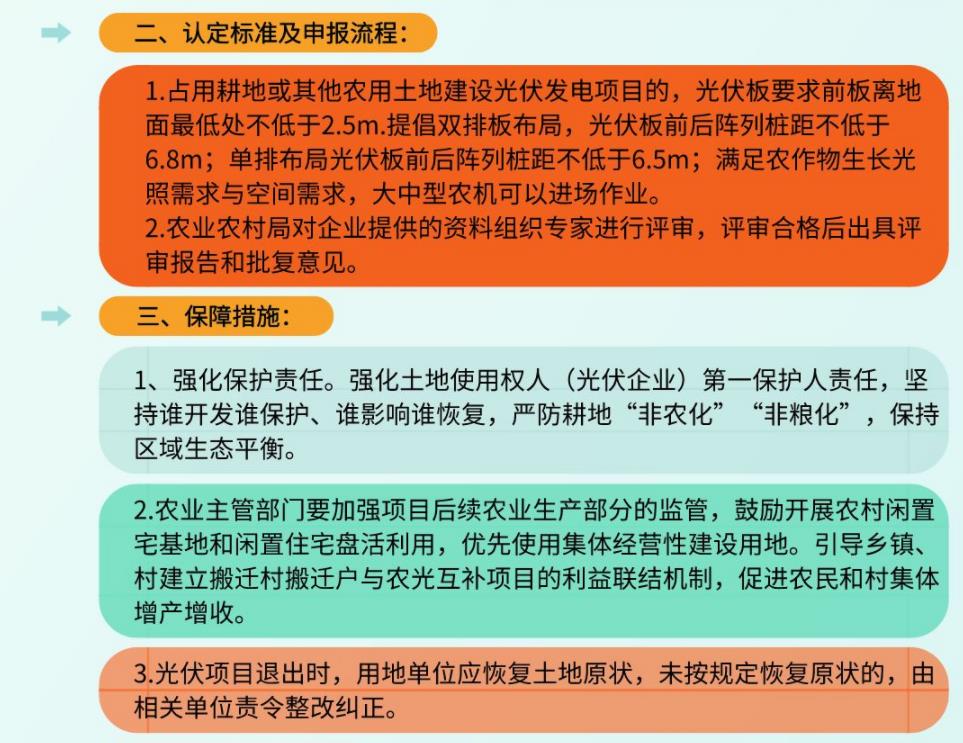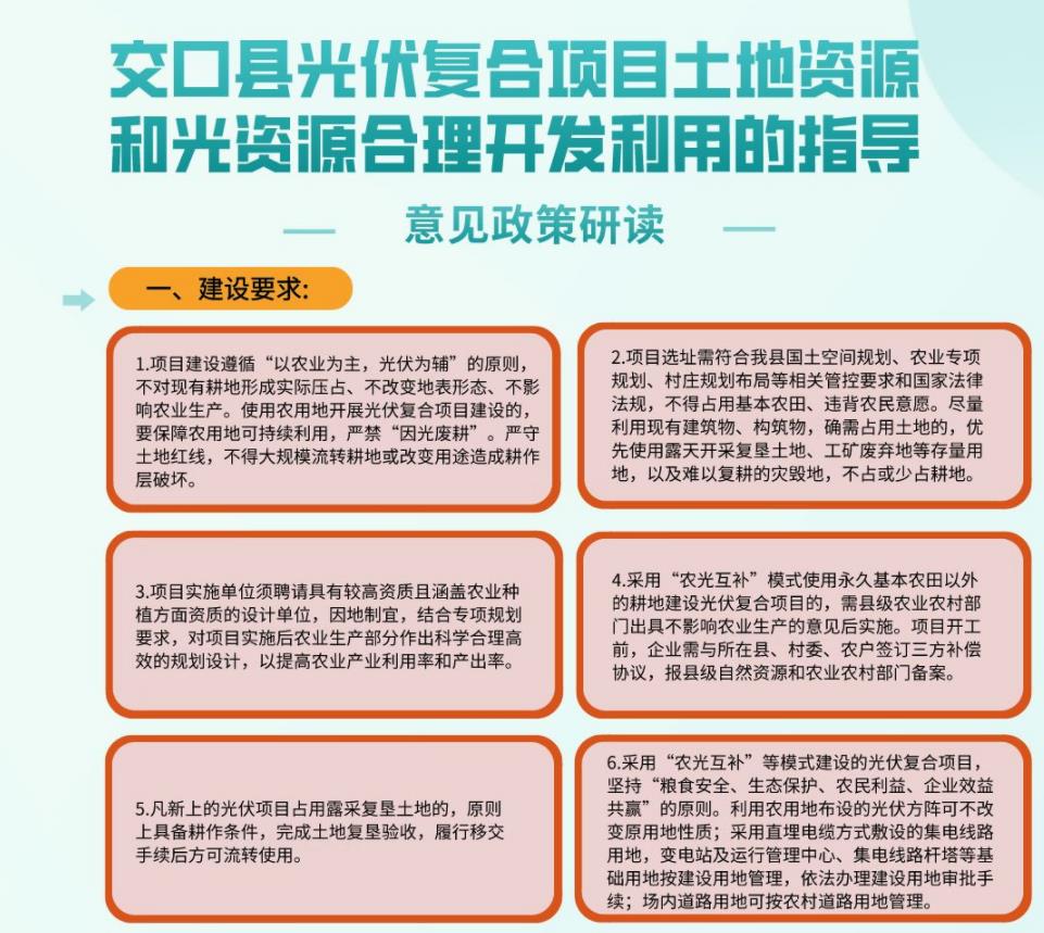 1月28日,山西省呂梁市交口縣人民政府印發(fā)《交口縣光伏復(fù)合項(xiàng)目土地資源和光資源合理開(kāi)發(fā)利用的指導(dǎo)性意見(jiàn)》,意見(jiàn)要求:項(xiàng)目建設(shè)遵循“以農(nóng)業(yè)為主,光伏為輔”的原則,不對(duì)現(xiàn)有耕地形成實(shí)際壓占、不改變地表形態(tài)、不影響農(nóng)業(yè)生產(chǎn)。使用農(nóng)用地開(kāi)展光伏復(fù)合項(xiàng)目建設(shè)的,要保障農(nóng)用地可持續(xù)利用,嚴(yán)禁“因光廢耕”。嚴(yán)守土地紅線,不得大規(guī)模流轉(zhuǎn)耕地或改變用途造成耕作層破壞。項(xiàng)目選址需符合我縣國(guó)土空間規(guī)劃、農(nóng)業(yè)專項(xiàng)規(guī)劃、村莊規(guī)劃布局等相關(guān)管控要求和國(guó)家法律法規(guī),不得占用基本農(nóng)田、違背農(nóng)民意愿。盡量利用現(xiàn)有建筑物、構(gòu)筑物,確需占用土地的,優(yōu)先使用露天開(kāi)采復(fù)墾土地、工礦廢棄地等存量用地,以及難以復(fù)耕的災(zāi)毀地,不占或少占耕地。 占用耕地或其他農(nóng)用土地建設(shè)光伏發(fā)電項(xiàng)目的,光伏板要求前板離地面最低處不低于2.5m。提倡雙排板布局,光伏板前后陣列樁距不低于6.8m;單排布局光伏板前后陣列樁距不低于6.5m;滿足農(nóng)作物生長(zhǎng)光照需求與空間需求,大中型農(nóng)機(jī)可以進(jìn)場(chǎng)作業(yè)。 全文如下: 交口縣人民政府辦公室關(guān)于印發(fā)《交口縣光伏復(fù)合項(xiàng)目土地資源和光資源合理開(kāi)發(fā)利用的指導(dǎo)性意見(jiàn)》的通知 各鄉(xiāng)鎮(zhèn)人民政府、縣直有關(guān)單位、駐縣光伏企業(yè): 《交口縣光伏復(fù)合項(xiàng)目土地資源和光資源合理開(kāi)發(fā)利用的指導(dǎo)性意見(jiàn)》已經(jīng)縣人民政府同意,現(xiàn)印發(fā)給你們,請(qǐng)認(rèn)真遵照實(shí)施。 交口縣人民政府辦公室 2022年8月11日 (此件公開(kāi)發(fā)布) 交口縣光伏復(fù)合項(xiàng)目土地資源和光資源 合理開(kāi)發(fā)利用的指導(dǎo)性意見(jiàn) 為深入貫徹習(xí)近平生態(tài)文明思想,全方位推動(dòng)高質(zhì)量發(fā)展,構(gòu)建綠色、低碳、循環(huán)發(fā)展體系,推進(jìn)能源革命引領(lǐng)經(jīng)濟(jì)轉(zhuǎn)型,助力我縣市場(chǎng)主體倍增,根據(jù)(晉自然資函[2022]323號(hào))文件精神,現(xiàn)就支持光伏產(chǎn)業(yè)發(fā)展,促進(jìn)土地資源和光資源合理開(kāi)發(fā)利用,防止耕地“非糧化”,“非農(nóng)化”和棄耕撂荒,提出如下指導(dǎo)意見(jiàn): 一、建設(shè)要求 1、項(xiàng)目建設(shè)遵循“以農(nóng)業(yè)為主,光伏為輔”的原則,不對(duì)現(xiàn)有耕地形成實(shí)際壓占、不改變地表形態(tài)、不影響農(nóng)業(yè)生產(chǎn)。使用農(nóng)用地開(kāi)展光伏復(fù)合項(xiàng)目建設(shè)的,要保障農(nóng)用地可持續(xù)利用,嚴(yán)禁“因光廢耕”。嚴(yán)守土地紅線,不得大規(guī)模流轉(zhuǎn)耕地或改變用途造成耕作層破壞。 2、項(xiàng)目選址需符合我縣國(guó)土空間規(guī)劃、農(nóng)業(yè)專項(xiàng)規(guī)劃、村莊規(guī)劃布局等相關(guān)管控要求和國(guó)家法律法規(guī),不得占用基本農(nóng)田、違背農(nóng)民意愿。盡量利用現(xiàn)有建筑物、構(gòu)筑物,確需占用土地的,優(yōu)先使用露天開(kāi)采復(fù)墾土地、工礦廢棄地等存量用地,以及難以復(fù)耕的災(zāi)毀地,不占或少占耕地。 3、項(xiàng)目實(shí)施單位須聘請(qǐng)具有較高資質(zhì)且涵蓋農(nóng)業(yè)種植方面資質(zhì)的設(shè)計(jì)單位,因地制宜,結(jié)合專項(xiàng)規(guī)劃要求,對(duì)項(xiàng)目實(shí)施后農(nóng)業(yè)生產(chǎn)部分作出科學(xué)合理高效的規(guī)劃設(shè)計(jì),以提高農(nóng)業(yè)產(chǎn)業(yè)利用率和產(chǎn)出率。 4、采用“農(nóng)光互補(bǔ)”模式使用永久基本農(nóng)田以外的耕地建設(shè)光伏復(fù)合項(xiàng)目的,需縣級(jí)農(nóng)業(yè)農(nóng)村部門(mén)出具不影響農(nóng)業(yè)生產(chǎn)的意見(jiàn)后實(shí)施。項(xiàng)目開(kāi)工前,企業(yè)需與所在縣、村委、農(nóng)戶簽訂三方補(bǔ)償協(xié)議,報(bào)縣級(jí)自然資源和農(nóng)業(yè)農(nóng)村部門(mén)備案。 5、凡新上的光伏項(xiàng)目占用露采復(fù)墾土地的,原則上具備耕作條件,完成土地復(fù)墾驗(yàn)收,履行移交手續(xù)后方可流轉(zhuǎn)使用。 6、采用“農(nóng)光互補(bǔ)”等模式建設(shè)的光伏復(fù)合項(xiàng)目,堅(jiān)持“糧食安全、生態(tài)保護(hù)、農(nóng)民利益、企業(yè)效益共贏”的原則。利用農(nóng)用地布設(shè)的光伏方陣可不改變?cè)玫匦再|(zhì);采用直埋電纜方式敷設(shè)的集電線路用地,變電站及運(yùn)行管理中心、集電線路桿塔等基礎(chǔ)用地按建設(shè)用地管理,依法辦理建設(shè)用地審批手續(xù);場(chǎng)內(nèi)道路用地可按農(nóng)村道路用地管理。 二、認(rèn)定標(biāo)準(zhǔn)及申報(bào)流程 7、占用耕地或其他農(nóng)用土地建設(shè)光伏發(fā)電項(xiàng)目的,光伏板要求前板離地面最低處不低于2.5m。提倡雙排板布局,光伏板前后陣列樁距不低于6.8m;單排布局光伏板前后陣列樁距不低于6.5m;滿足農(nóng)作物生長(zhǎng)光照需求與空間需求,大中型農(nóng)機(jī)可以進(jìn)場