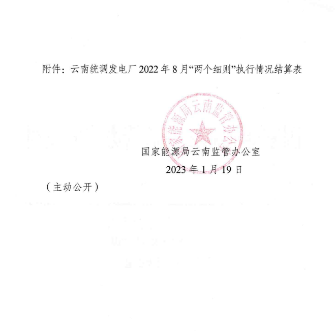 1月19日,國家能源局云南監(jiān)管辦公室公布云南統(tǒng)調(diào)電廠2022年8月“兩個細則”執(zhí)行結(jié)果。