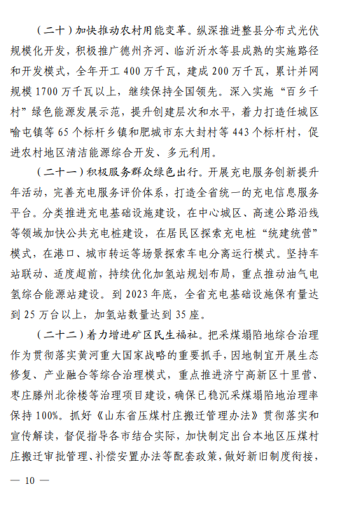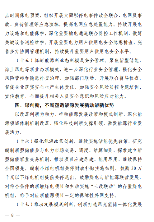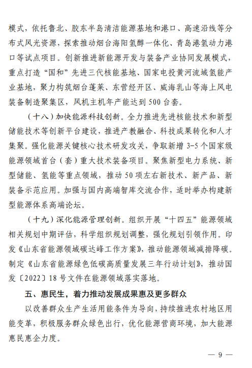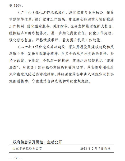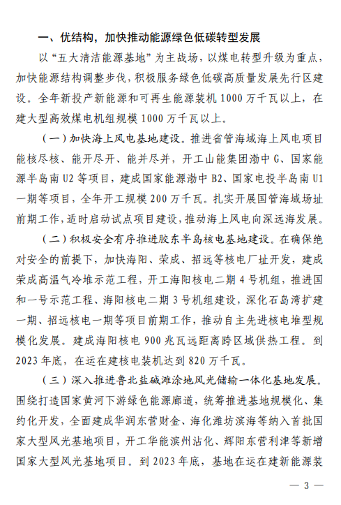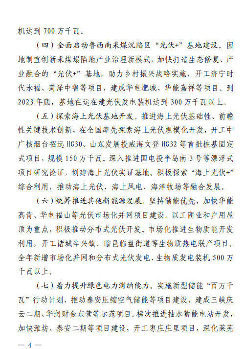2月7日,山東省能源局關(guān)于印發(fā)2023年全省能源工作指導(dǎo)意見(jiàn)的通知,通知指出,全面啟動(dòng)魯西南采煤沉陷區(qū)“光伏+”基地建設(shè)。因地制宜創(chuàng)新采煤塌陷地產(chǎn)業(yè)治理新模式,加快打造生態(tài)修復(fù)、產(chǎn)業(yè)融合的“光伏+”基地,助力鄉(xiāng)村振興戰(zhàn)略實(shí)施,開(kāi)工濟(jì)寧時(shí)代永福、菏澤中魯?shù)软?xiàng)目,建成華電肥城、華能嘉祥等項(xiàng)目。到2023年底,基地在運(yùn)在建光伏發(fā)電裝機(jī)達(dá)到300萬(wàn)千瓦以上。 探索海上光伏基地開(kāi)發(fā)。推進(jìn)海上光伏基礎(chǔ)性、前瞻性關(guān)鍵技術(shù)創(chuàng)新,在全國(guó)率先探索海上光伏規(guī)?;_(kāi)發(fā),開(kāi)工中廣核煙臺(tái)招遠(yuǎn)HG30、山東發(fā)展投威海文登HG32等首批樁基固定式項(xiàng)目,規(guī)模150萬(wàn)千瓦。深入推進(jìn)國(guó)電投半島南3號(hào)等漂浮式項(xiàng)目研究論證,創(chuàng)建海上光伏實(shí)證基地。積極探索“海上光伏+”綜合利用,推動(dòng)海上光伏、海上風(fēng)電、海洋牧場(chǎng)等融合發(fā)展。 統(tǒng)籌推進(jìn)其他新能源發(fā)展。堅(jiān)持儲(chǔ)能優(yōu)先,加快華能高青、華電福山等光伏市場(chǎng)化并網(wǎng)項(xiàng)目建設(shè)。以工商業(yè)和戶(hù)用屋頂為重點(diǎn),積極推動(dòng)分布式光伏開(kāi)發(fā)。市場(chǎng)化推進(jìn)生物質(zhì)能開(kāi)發(fā)利用,開(kāi)工諸城辛興鎮(zhèn)、臨邑臨盤(pán)街道等生物質(zhì)熱電聯(lián)產(chǎn)項(xiàng)目。全年新增市場(chǎng)化并網(wǎng)和分布式光伏發(fā)電、生物質(zhì)發(fā)電裝機(jī)500萬(wàn)千瓦以上。 原文如下: 山東省能源局關(guān)于印發(fā)2023年全省能源工作指導(dǎo)意見(jiàn)的通知 各市發(fā)展改革委(能源局),有關(guān)能源企業(yè): 為統(tǒng)籌做好2023年全省能源工作,加快推動(dòng)能源綠色低碳高質(zhì)量發(fā)展,省能源局研究制定了《2023年全省能源工作指導(dǎo)意見(jiàn)》?,F(xiàn)印發(fā)你們,請(qǐng)認(rèn)真組織實(shí)施。 山東省能源局 2023年2月7日