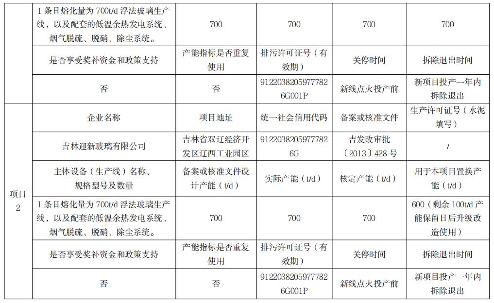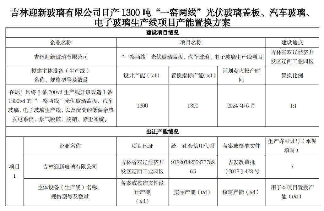 2月27日,吉林省工信廳發(fā)布《關于對吉林迎新玻璃有限公司日產1200噸“一窯兩線”光伏玻璃蓋板、汽車玻璃、電子玻璃生產線項目產能置換方案變更的公示》,根據公示,吉林迎新玻璃有限公司擬在吉林省雙遼經濟開發(fā)區(qū)遼西工業(yè)園區(qū)將2條700t/d生產線升級改造1條 1300t/d的“一窯兩線”光伏玻璃蓋板、汽車 玻璃、電子玻璃生產線,以及配套的低溫余熱 發(fā)電系統、煙氣脫硫、脫硝、除塵系統。設計產能1300t/d,置換指標產能1300t/d,1:1比例置換,新生產線計劃點火投產時間2024年6月。 詳情如下: 關于對吉林迎新玻璃有限公司日產1200噸“一窯兩線”光伏玻璃蓋板、汽車玻璃、電子玻璃 生產線項目產能置換方案變更的公示 吉工信辦函〔2023〕14號 按照工信部《水泥玻璃行業(yè)產能置換實施辦法》(工信部原〔2021〕80號)文件要求,我廳于2022年10月13日,對吉林迎新玻璃有限公司原廠區(qū)升級改造的日熔化1200噸“一窯兩線”光伏玻璃蓋板、汽車玻璃、電子玻璃生產線項目進行了公告。 吉林迎新玻璃有限公司為提升項目節(jié)能降碳能力,需將原設計并通過產能置換公告的1200t/d熔化量升級為1300t/d,剩余100t/d產能保留日后升級改造使用?,F將吉林迎新玻璃有限公司日產1300噸“一窯兩線”光伏玻璃蓋板、汽車玻璃、電子玻璃生產線項目產能置換方案予以變更公示,公示時間為2023年2月27日-3月10日,請廣大社會公眾監(jiān)督。 聯系電話:0431-87077670(原材料工業(yè)處) 附件:吉林迎新玻璃有限公司日產1300噸“一窯兩線”光伏玻璃蓋板、汽車玻璃、電子玻璃生產線項目產能置換方案 吉林省工信廳 2023年2月27日