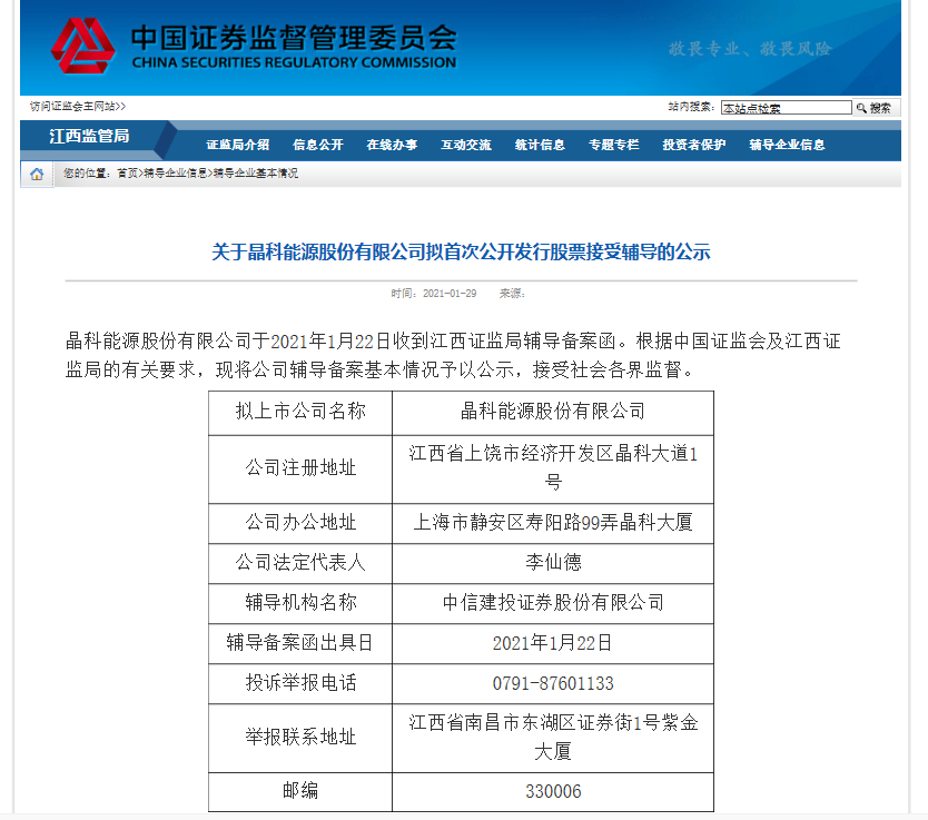 1月29日,江西監(jiān)管局披露了關(guān)于晶科能源股份有限公司(以下簡稱:晶科能源)擬首次公開發(fā)行股票接受輔導的具體信息。其輔導機構(gòu)為中信建投證券,并于1月22日進行上市輔導備案。