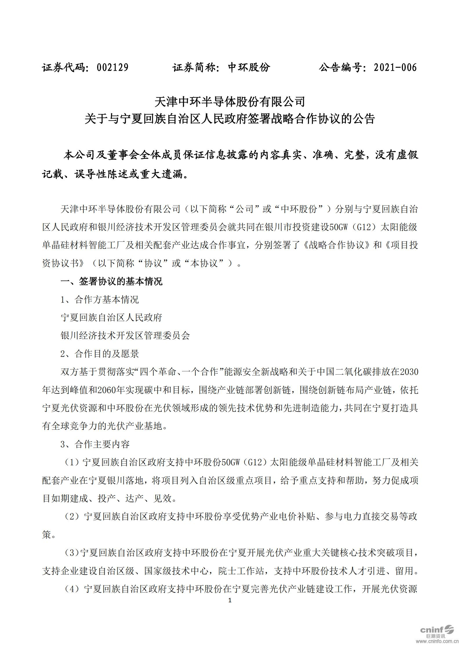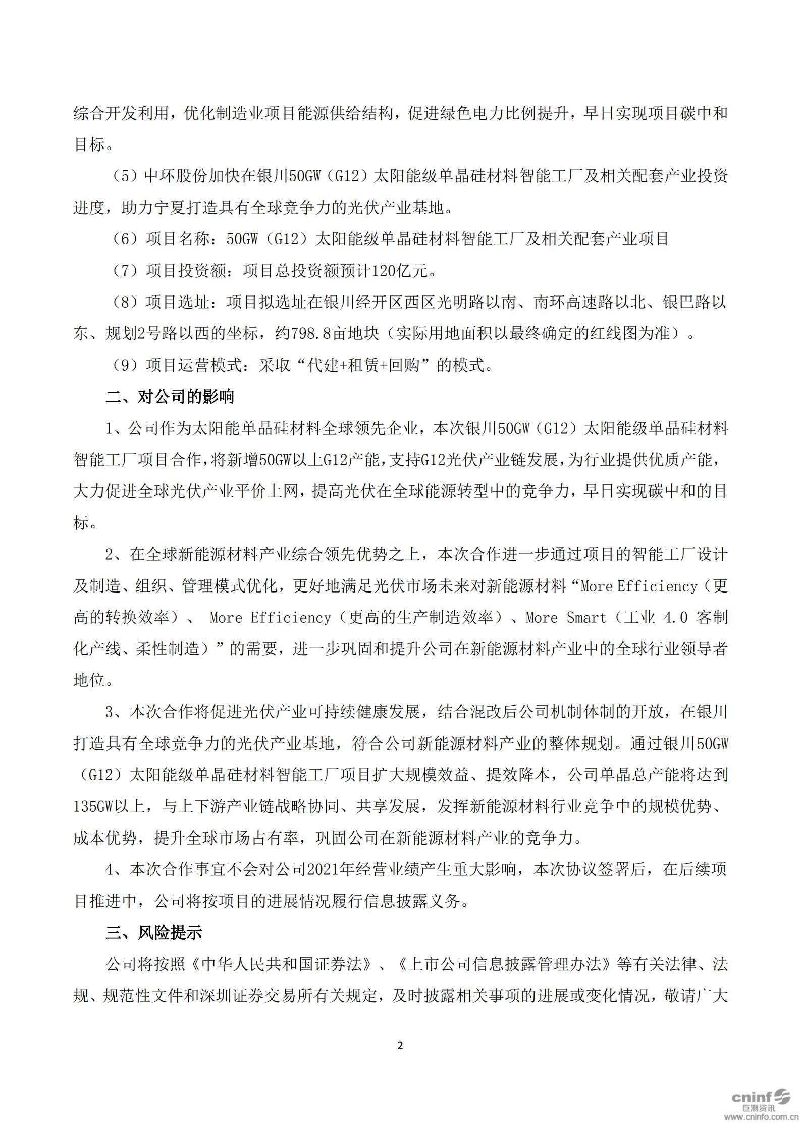 2月1日,中環(huán)股份發(fā)布《關(guān)于與寧夏回族自治區(qū)人民政府簽署戰(zhàn)略合作協(xié)議的公告》,根據(jù)公告,中環(huán)股份分別與寧夏回族自治區(qū)人民政府和銀川經(jīng)濟(jì)技術(shù)開發(fā)區(qū)管理委員會(huì)就共同在銀川市投資建設(shè)50GW(G12)太陽能級(jí)單晶硅材料智能工廠及相關(guān)配套產(chǎn)業(yè)達(dá)成合作事宜,分別簽署了《戰(zhàn)略合作協(xié)議》和《項(xiàng)目投 資協(xié)議書》,項(xiàng)目總投資額預(yù)計(jì)120億元。 公告顯示,項(xiàng)目擬選址在銀川經(jīng)開區(qū)西區(qū)光明路以南、南環(huán)高速路以北、銀巴路以 東、規(guī)劃2號(hào)路以西的坐標(biāo),約798.8畝地塊(實(shí)際用地面積以最終確定的紅線圖為準(zhǔn))。項(xiàng)目采取“代建+租賃+回購”的運(yùn)營模式。