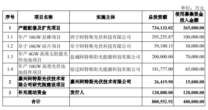 據(jù)上交所信息顯示,阿特斯在2022年1月7日提交注冊的基礎上,于2023年2月23日更新“注冊稿”。 據(jù)悉,阿特斯的A股IPO申請最早于2021年6月獲受理,在經(jīng)過問詢、上市委會議、提交注冊等階段后,于2022年6月突然中止,迄今已耗時近兩年之久。 招股說明書顯示,阿特斯本次發(fā)行的股票數(shù)量不超過541,058,824股,占發(fā)行后總股本的比例不低于15%,募資40億元。為解決公司單晶產(chǎn)能相對較小且生產(chǎn)環(huán)節(jié)的一體化程度較低的問題,本次募集資金擬投資建設“年產(chǎn)10GW拉棒項目”“阜寧10GW硅片項目”“年產(chǎn)4GW高效太陽能光伏電池項目”“年產(chǎn)10GW高效光伏電池組件項目”。上述項目投產(chǎn)后,公司產(chǎn)品產(chǎn)能將在現(xiàn)有基礎上大幅提升。 本次發(fā)行募集資金扣除發(fā)行費用后,將投資于以下項目: 1、年產(chǎn)10GW拉棒項目 項目以西寧阿特斯光伏科技有限公司為實施主體,在南川工業(yè)園區(qū)尕莊灘區(qū)域新購工業(yè)用地用于建設 10GW單晶拉棒項目??⒐み_產(chǎn)后,將實現(xiàn)年產(chǎn)27,800噸單晶方棒(10GW),項目總投資293,255.87萬元,建設期為24個月。 2、阜寧10GW硅片項目項目 以阜寧阿特斯光伏科技有限公司為實施主體,在鹽城市阜寧經(jīng)濟開發(fā)區(qū)阜寧智能裝備制造產(chǎn)業(yè)園租賃廠房進行10GW硅片項目建設。項目達產(chǎn)后,將實現(xiàn)年產(chǎn)10GW單晶(210mm)切片,項目總投資59,100.15萬元,建設期為20個月。 3、年產(chǎn)4GW高效太陽能光伏電池項目 項目實施主體為鹽城阿特斯陽光能源科技有限公司,建設地點為鹽城經(jīng)濟技術(shù)開發(fā)區(qū)內(nèi)。項目建成后,可年產(chǎn)4GW高效太陽能電池,項目總投資200,000.00萬元,本項目建設期為16個月。 4、年產(chǎn)10GW高效光伏電池組件項目 項目實施主體為宿遷阿特斯陽光能源科技有限公司,建設地點為江蘇省宿遷經(jīng)濟技術(shù)開發(fā)區(qū)。項目分兩期建設,建成后可年產(chǎn)10GW太陽能高效組件本項目總投資181,777.00萬元,建設期為18個月。