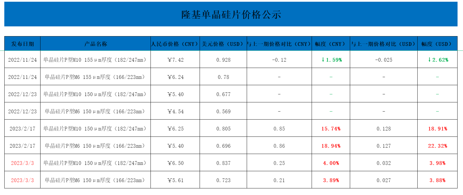 隆基關(guān)于3月3日單晶硅片價(jià)格價(jià)格公示2023-03-03 16:41來源:gessey瀏覽數(shù):601次