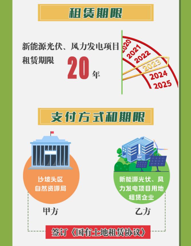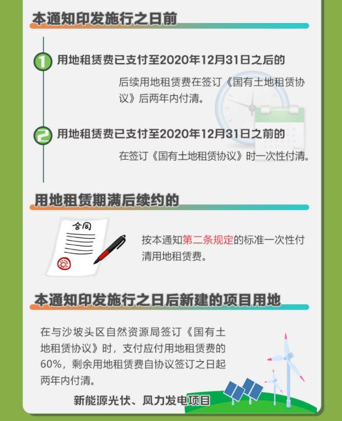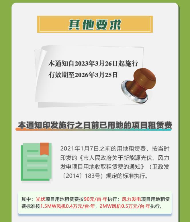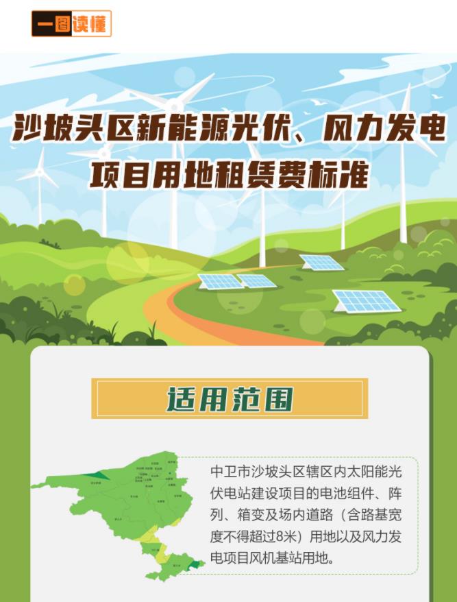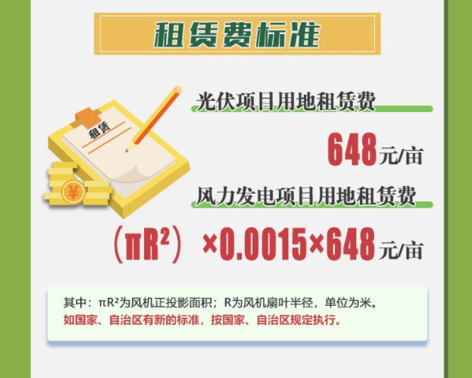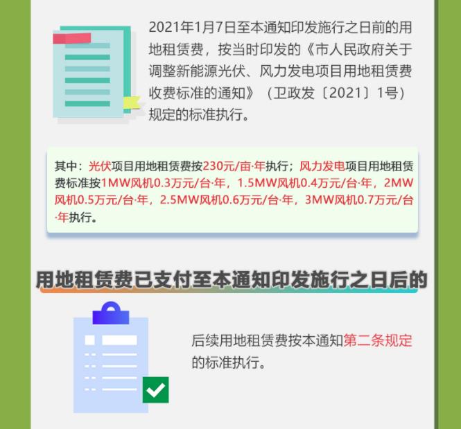 全文如下: 中衛(wèi)市沙坡頭區(qū)自然資源局關(guān)于印發(fā)《關(guān)于規(guī)范沙坡頭區(qū)新能源光伏、風(fēng)力發(fā)電項目用地租賃費標(biāo)準(zhǔn)的通知》的通知 各鄉(xiāng)鎮(zhèn)人民政府,區(qū)直各部門,各有關(guān)光伏企業(yè): 《關(guān)于規(guī)范沙坡頭區(qū)新能源光伏、風(fēng)力發(fā)電項目用地租賃費標(biāo)準(zhǔn)的通知》已經(jīng)區(qū)人民政府同意,現(xiàn)印發(fā)給你們,請認(rèn)真遵照執(zhí)行。 中衛(wèi)市沙坡頭區(qū)自然資源局 2023年2月24日 (此件公開發(fā)布) 關(guān)于規(guī)范沙坡頭區(qū)新能源光伏、風(fēng)力發(fā)電項目用地租賃費標(biāo)準(zhǔn)的通知 為規(guī)范沙坡頭區(qū)新能源光伏、風(fēng)力發(fā)電項目用地租賃費收費標(biāo)準(zhǔn),嚴(yán)格落實國有土地有償使用制度,根據(jù)《中華人民共和國土地管理法》《中華人民共和國土地管理法實施條例》《國土資源部關(guān)于印發(fā)〈規(guī)范國有土地租賃若干意見〉的通知》(國土資發(fā)〔1999〕222號)、《自治區(qū)人民政府關(guān)于公布自治區(qū)征收農(nóng)用地區(qū)片綜合地價的通知》(寧政規(guī)發(fā)〔2020〕8號)、《自治區(qū)人民政府辦公廳關(guān)于規(guī)范新能源產(chǎn)業(yè)用地的通知》(寧政辦發(fā)〔2015〕108號)等精神,結(jié)合沙坡頭區(qū)實際,現(xiàn)將有關(guān)事宜通知如下: 一、適用范圍 中衛(wèi)市沙坡頭區(qū)轄區(qū)內(nèi)太陽能光伏電站建設(shè)項目的電池組件、陣列、箱變及場內(nèi)道路(含路基寬度不得超過8米)用地以及風(fēng)力發(fā)電項目風(fēng)機(jī)基站用地。 二、租賃費標(biāo)準(zhǔn) 自本通知印發(fā)施行之日起光伏項目用地租賃費按648元/畝?年執(zhí)行;風(fēng)力發(fā)電項目用地租賃費按風(fēng)機(jī)正投影面積(πR2)×0.0015×648元/畝?年執(zhí)行(其中R為風(fēng)機(jī)扇葉半徑,單位為米)。如國家、自治區(qū)有新的標(biāo)準(zhǔn),按國家、自治區(qū)規(guī)定執(zhí)行。 三、租賃期限 本通知印發(fā)施行之日后的新能源光伏、風(fēng)力發(fā)電項目租賃期限按20年執(zhí)行。 四、租賃費支付方式和期限 本通知印發(fā)施行之日后,沙坡頭區(qū)轄區(qū)內(nèi)新能源光伏、風(fēng)力發(fā)電項目用地租賃企業(yè)應(yīng)當(dāng)與沙坡頭區(qū)自然資源局簽訂《國有土地租賃協(xié)議》,按協(xié)議約定的用地租賃費和付費期限支付至沙坡頭區(qū)財政收款賬戶。 五、其他要求 (一)本通知印發(fā)施行之日前已用地的新能源光伏、風(fēng)力發(fā)電項目租賃費按以下要求執(zhí)行: 1.2021年1月7日之前的用地租賃費,按當(dāng)時印發(fā)的《市人民政府關(guān)于新能源光伏、風(fēng)力發(fā)電項目用地收取租賃費的通知》(衛(wèi)政發(fā)〔2014〕183號)規(guī)定的標(biāo)準(zhǔn)執(zhí)行,其中:光伏項目用地租賃費按90元/畝?年執(zhí)行;風(fēng)力發(fā)電項目用地租賃費標(biāo)準(zhǔn)按1.5MW風(fēng)機(jī)0.4萬元/臺?年,2MW風(fēng)機(jī)0.5萬元/臺?年執(zhí)行。 2.2021年1月7日至本通知印發(fā)施行之日前的用地租賃費,按當(dāng)時印發(fā)的《市人民政府關(guān)于調(diào)整新能源光伏、風(fēng)力發(fā)電項目用地租賃費收費標(biāo)準(zhǔn)的通知》(衛(wèi)政發(fā)〔2021〕1號)規(guī)定的標(biāo)準(zhǔn)執(zhí)行,其中:光伏項目用地租賃費按230元/畝?年執(zhí)行;風(fēng)力發(fā)電項目用地租賃費標(biāo)準(zhǔn)按1MW風(fēng)機(jī)0.3萬元/臺?年,1.5MW風(fēng)機(jī)0.4萬元/臺?年,2MW風(fēng)機(jī)0.5萬元/臺?年,2.5MW風(fēng)機(jī)0.6萬元/臺?年,3MW風(fēng)機(jī)0.7萬元/臺?年執(zhí)行。 (二)用地租賃費已支付至本通知印發(fā)施行之日后的,后續(xù)用地租賃費按本通知第二條規(guī)定的標(biāo)準(zhǔn)執(zhí)行。 (三)本通知印發(fā)施行之日前,用地租賃費已支付至2020年12月31日之后的,后續(xù)用地租賃費在簽訂《國有土地租賃協(xié)議》后兩年內(nèi)付清;支付至2020年12月31日之前的,在簽訂《國有土地租賃協(xié)議》時一次性付清。 (四)用地租賃期滿的,如續(xù)約,按本通知第二條規(guī)定的標(biāo)準(zhǔn)一次性付清用地租賃費。 (五)本通知印發(fā)施行之日后新建的新能源光伏、風(fēng)力發(fā)電項目用地,在與沙坡頭區(qū)自然資源局簽訂《國有土地租賃協(xié)議》時,支付應(yīng)付用地租賃費的60%,剩余用地租賃費自協(xié)議簽訂之日起兩年內(nèi)付清。 (六)用地租賃費不包含法律法規(guī)規(guī)定的其他需要繳納的稅收、使用國有草原補(bǔ)償費及植被恢復(fù)保證金等費用。 (七)本通知自2023年3月26日起施行,有效期至2026年3月25日。