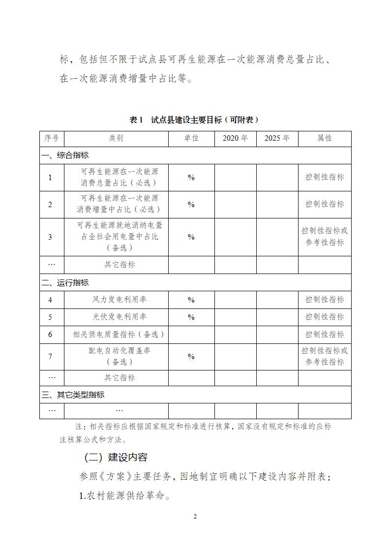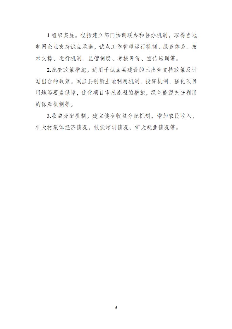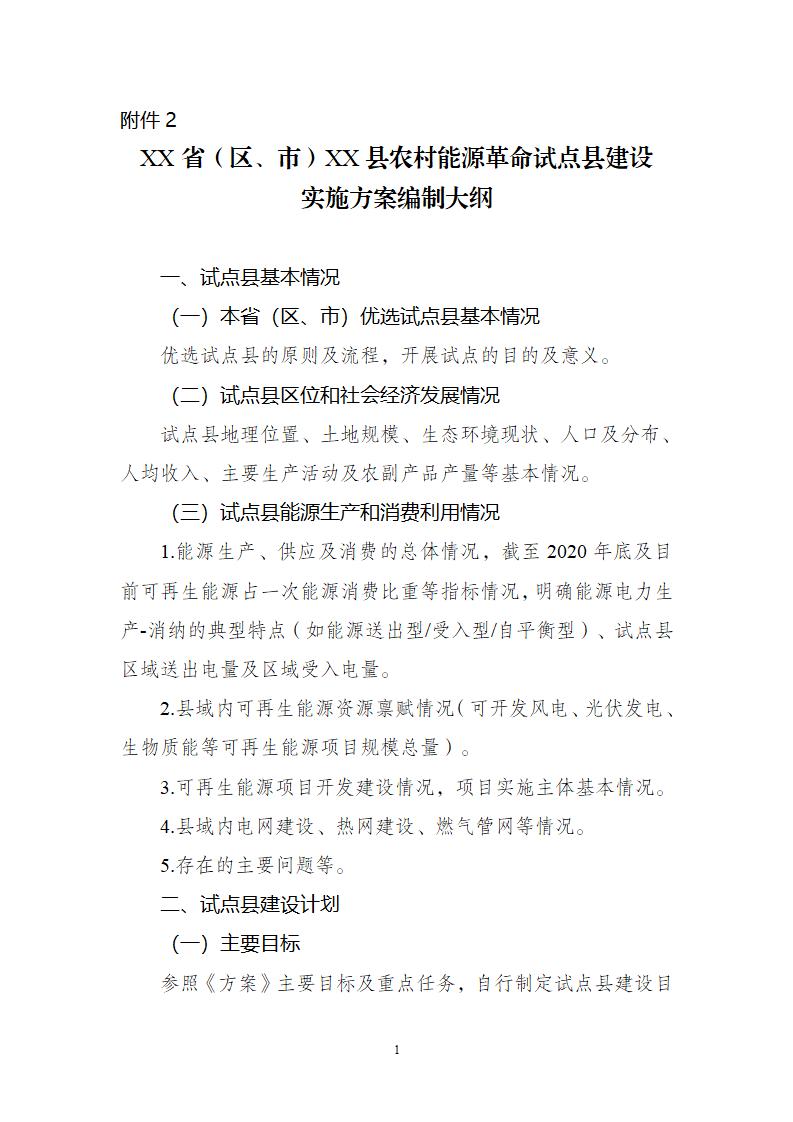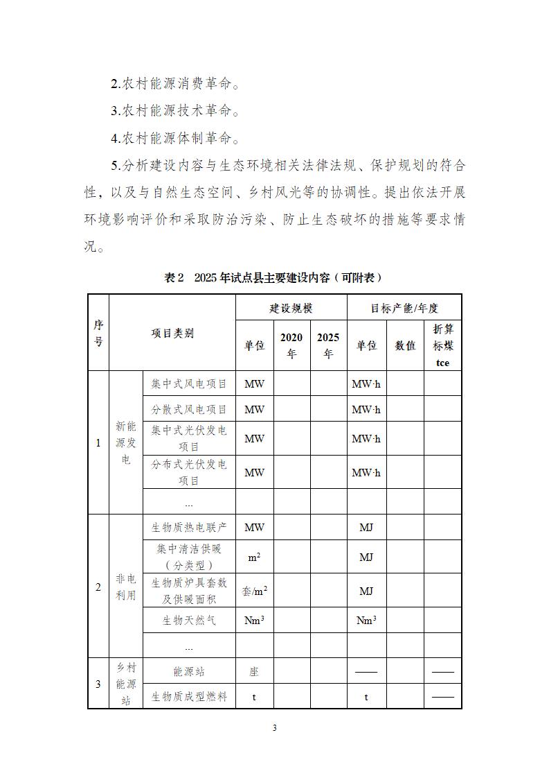 3月23日,國家能源局等部門發(fā)布關(guān)于組織開展農(nóng)村能源革命試點縣建設(shè)的通知。 通知提出,各?。▍^(qū)、市)能源主管部門會同生態(tài)環(huán)境、農(nóng)業(yè)農(nóng)村、鄉(xiāng)村振興等相關(guān)部門,自愿組織優(yōu)選不超過1個可再生能源資源稟賦好、開發(fā)潛力大、用能需求明確、地方政府及農(nóng)民積極性高,特別是現(xiàn)有支持政策完備、支持力度較大的縣域,申報農(nóng)村能源革命試點縣。 到2025年,試點縣可再生能源在一次能源消費總量占比超過30%,在一次能源消費增量中占比超過60%??稍偕茉葱履J叫聵I(yè)態(tài)廣泛發(fā)展,就地消納能力明顯提升,新型電力系統(tǒng)配電網(wǎng)建設(shè)成效顯著,非電利用多元化、成規(guī)模。國家大氣污染防治重點區(qū)域試點縣平原地區(qū)實現(xiàn)炊事、取暖和農(nóng)業(yè)散煤基本清零,其它區(qū)域試點縣制訂平原地區(qū)炊事、取暖和農(nóng)業(yè)散煤清零規(guī)劃并有序組織實施。以可再生能源產(chǎn)業(yè)經(jīng)濟(jì)帶動農(nóng)民增收,基本形成以清潔能源為主、安全可靠的農(nóng)村能源供給、消費、技術(shù)體系和管理體制。 原文如下: 《國家能源局 生態(tài)環(huán)境部 農(nóng)業(yè)農(nóng)村部 國家鄉(xiāng)村振興局關(guān)于組織開展農(nóng)村能源革命試點縣建設(shè)的通知》 (國能發(fā)新能〔2023〕23號) 各省、自治區(qū)、直轄市、新疆生產(chǎn)建設(shè)兵團(tuán)發(fā)展改革委(能源局)、生態(tài)環(huán)境廳(局)、農(nóng)業(yè)農(nóng)村(農(nóng)牧)廳(局、委)、鄉(xiāng)村振興局: 為深入貫徹落實黨中央、國務(wù)院決策部署,加大鄉(xiāng)村清潔能源建設(shè)力度,助力全面推進(jìn)鄉(xiāng)村振興,國家能源局、生態(tài)環(huán)境部、農(nóng)業(yè)農(nóng)村部、國家鄉(xiāng)村振興局決定聯(lián)合組織開展農(nóng)村能源革命試點縣建設(shè)。現(xiàn)將《農(nóng)村能源革命試點縣建設(shè)方案》(以下簡稱《方案》,詳見附件1)印發(fā)你們,并就有關(guān)事項通知如下。 一、能源產(chǎn)業(yè)是鄉(xiāng)村振興的重要支撐,發(fā)揮可再生能源分布式創(chuàng)新發(fā)展的優(yōu)勢,加快推進(jìn)農(nóng)村能源革命,對保障農(nóng)村地區(qū)能源安全、助力實現(xiàn)碳達(dá)峰碳中和目標(biāo)任務(wù)、全面推進(jìn)鄉(xiāng)村振興具有重要意義。各地要高度重視農(nóng)村能源革命試點縣建設(shè)工作,加大組織協(xié)調(diào)力度,建立工作機制,確保盡快取得實效。 二、各省(區(qū)、市)能源主管部門會同生態(tài)環(huán)境、農(nóng)業(yè)農(nóng)村、鄉(xiāng)村振興等相關(guān)部門,自愿組織優(yōu)選不超過1個可再生能源資源稟賦好、開發(fā)潛力大、用能需求明確、地方政府及農(nóng)民積極性高,特別是現(xiàn)有支持政策完備、支持力度較大的縣域,申報農(nóng)村能源革命試點縣。 三、各省(區(qū)、市)能源主管部門會同相關(guān)部門組織試點地區(qū)按《方案》總體要求,根據(jù)自身經(jīng)濟(jì)社會發(fā)展水平和能源資源條件,科學(xué)論證、因地制宜編制農(nóng)村能源革命試點縣實施方案,提出建設(shè)目標(biāo)和內(nèi)容,明確激勵政策措施,并對實施方案進(jìn)行初步審核(實施方案編制大綱見附件2)。 四、各?。▍^(qū)、市)能源主管部門會同相關(guān)部門于2023年5月底前,向國家能源局、生態(tài)環(huán)境部、農(nóng)業(yè)農(nóng)村部、國家鄉(xiāng)村振興局報送實施方案。國家能源局牽頭委托咨詢機構(gòu)或組織專家對實施方案進(jìn)行評估。經(jīng)評估具備試點縣建設(shè)條件的,分批公布名單,開展試點縣建設(shè)。 五、各地要根據(jù)實施方案,因地制宜打造深入推進(jìn)農(nóng)村能源革命、助力實現(xiàn)鄉(xiāng)村振興的示范和樣板,合法合規(guī)、統(tǒng)籌利用好各領(lǐng)域支持政策,加強指導(dǎo)協(xié)調(diào)和監(jiān)督管理,高效高質(zhì)完成試點縣建設(shè)目標(biāo)任務(wù)。 六、各?。▍^(qū)、市)能源主管部門會同相關(guān)部門按《方案》要求每年上報試點縣建設(shè)情況,建設(shè)完成后及時組織驗收并報送總結(jié)報告。未通過驗收的,責(zé)令限期整改,整改未通過的,取消試點資格。 附件:1.農(nóng)村能源革命試點縣建設(shè)方案 2.XX?。▍^(qū)、市)XX縣農(nóng)村能源革命試點縣實施方案編制大綱 國家能源局 生態(tài)環(huán)境部 農(nóng)業(yè)農(nóng)村部 國家鄉(xiāng)村振興局 2023年3月15日 附件1 農(nóng)村能源革命試點縣建設(shè)方案 廣大農(nóng)村地區(qū)風(fēng)能、太陽能、生物質(zhì)能等可再生能源資源豐富,是落實碳達(dá)峰目標(biāo)、大力發(fā)展新能源的重要增長極。推動農(nóng)村能源革命,加大鄉(xiāng)村清潔能源建設(shè)力度,有助于實現(xiàn)碳達(dá)峰、碳中和目標(biāo)任務(wù),促進(jìn)農(nóng)村產(chǎn)業(yè)提檔升級、拉動產(chǎn)業(yè)鏈延伸,支撐宜居宜業(yè)和美鄉(xiāng)村建設(shè)。為深入貫徹黨中央、國務(wù)院關(guān)于鄉(xiāng)村振興戰(zhàn)略的重要決策部署及“四個革命、一個合作”能源安全新戰(zhàn)略,落實《中共中央 國務(wù)院關(guān)于全面推進(jìn)鄉(xiāng)村振興加快農(nóng)業(yè)農(nóng)村現(xiàn)代化的意