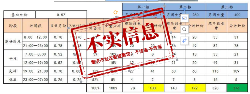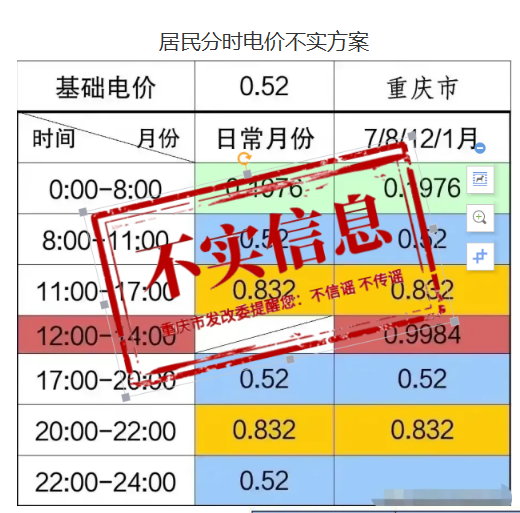 3月24日,重慶市發(fā)展和改革委員會發(fā)布關(guān)于居民分時電價不實方案的辟謠聲明。 原文如下: 重慶市發(fā)展和改革委員會關(guān)于居民分時電價不實方案的辟謠聲明 市發(fā)展改革委按照法定程序于3月20日正式啟動了我市居民分時電價聽證程序,向社會公開發(fā)布了1號公告(https://fzggw.cq.gov.cn/zwgk/zfxxgkml/zcwj/qtwj/202303/t20230320_11783830.html),邀請新聞媒體進行了公開報道(https://cqxyh5.cbgcloud.com/pages/details/details.html?companyId=cqxwzx&productId=6B1BEE01515143AFAF290F6044E54A89&docid=6417dc84cef31d19a70295ab&isNew=yes&downloadTips=true)。 公告發(fā)布后,部分網(wǎng)絡(luò)平臺流轉(zhuǎn)多則我市居民分時電價方案,現(xiàn)特予嚴正聲明,所傳方案均為不實方案,請廣大網(wǎng)民不信謠、不傳謠。依法定程序,我委將于4月初發(fā)布居民分時電價聽證方案,屆時將邀請權(quán)威媒體予以宣傳報道,歡迎社會各界持續(xù)關(guān)注。 附件:居民分時電價不實方案 重慶市發(fā)展和改革委員會 2023年3月24日 附件