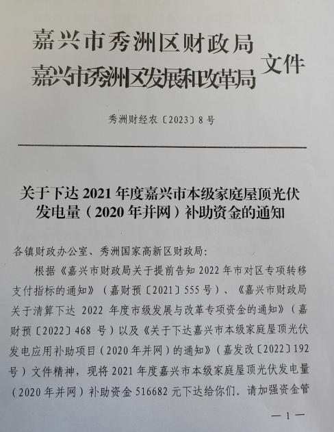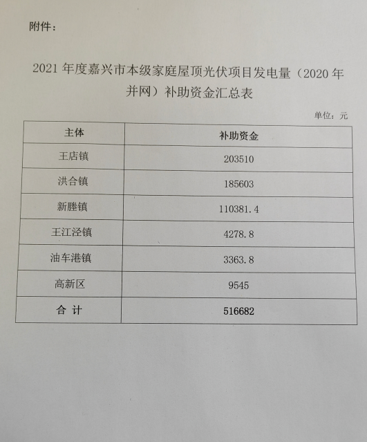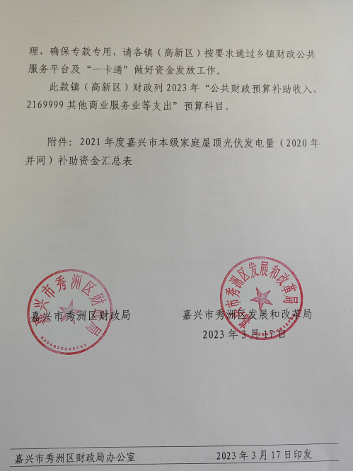 3月29日,秀洲區(qū)人民政府發(fā)布關(guān)于下達(dá)2021年度嘉興市本級(jí)家庭屋頂光伏發(fā)電量(2020年并網(wǎng))補(bǔ)助資金的通知。