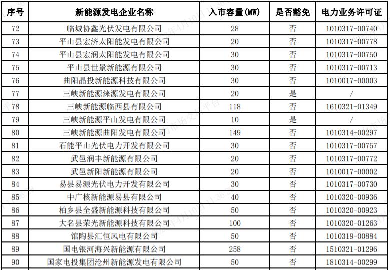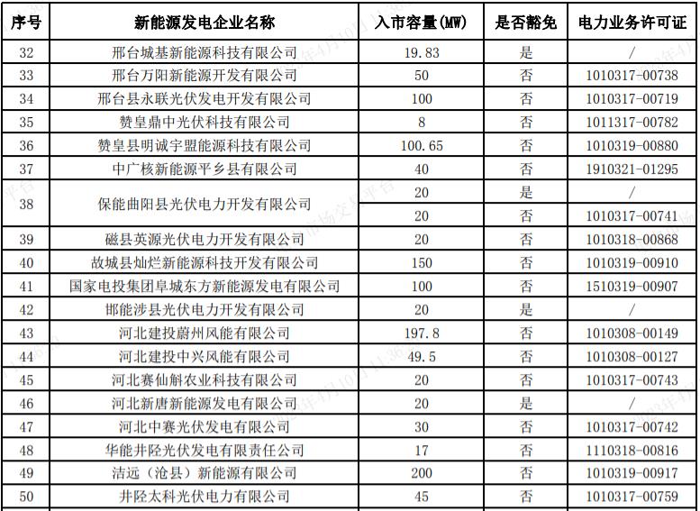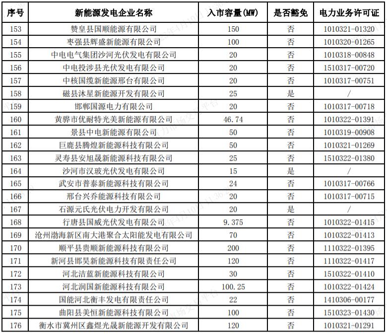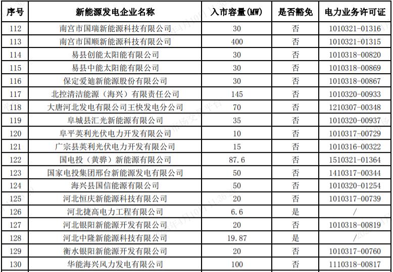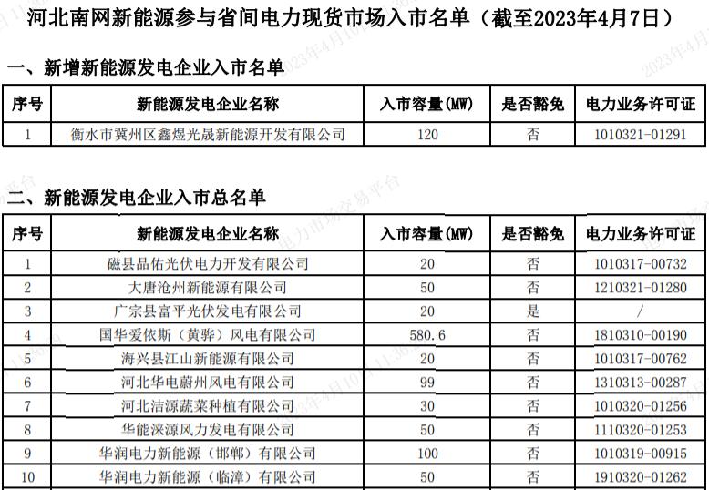 4月7日,河北電力交易中心更新《河北南網(wǎng)新能源參與省間電力現(xiàn)貨市場入市名單》,新增一家光伏企業(yè)衡水市冀州區(qū)鑫煜光晟新能源開發(fā)有限公司,入市容量120MW。截至2023年4月7日,河北南網(wǎng)新能源參與省間電力現(xiàn)貨市場入市新能源企業(yè)數(shù)量已達(dá)176家。