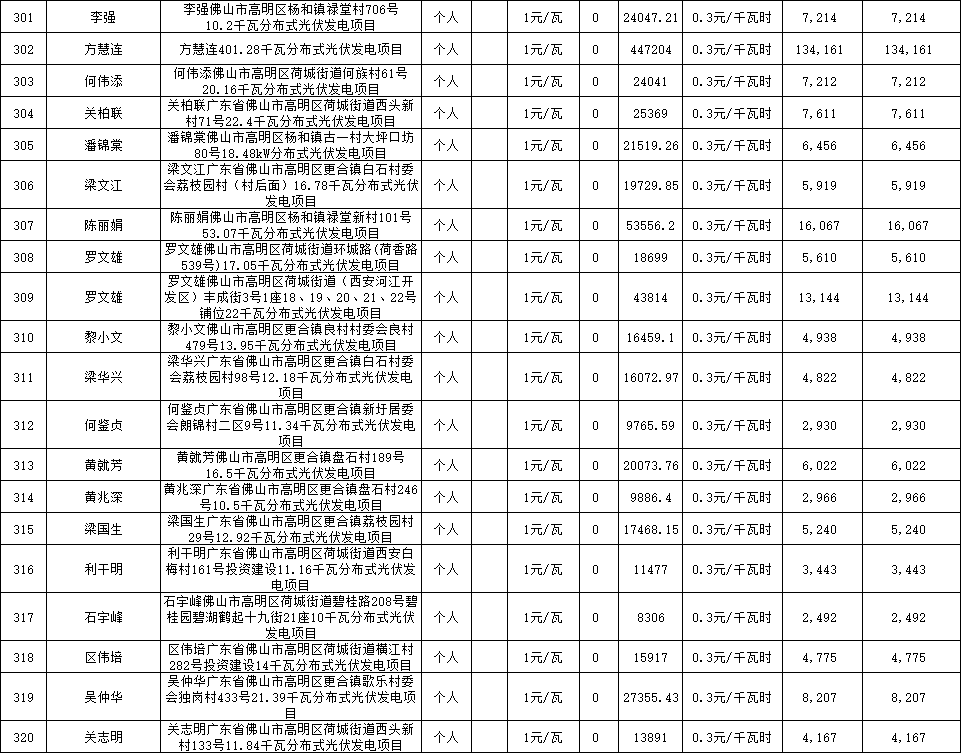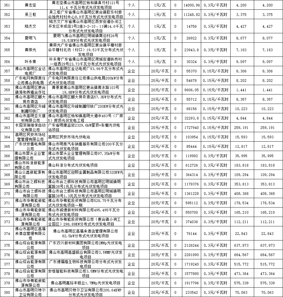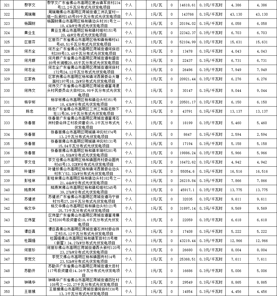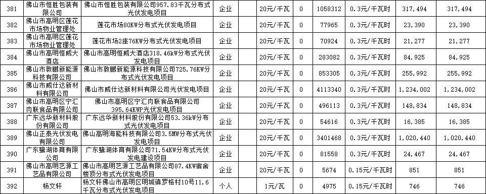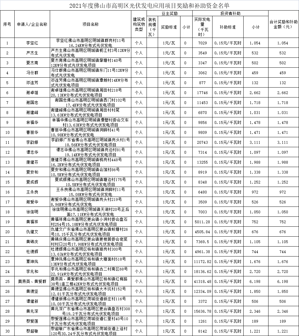 4月17日,廣東省佛山市高明區(qū)發(fā)改局發(fā)布《關(guān)于高明區(qū)2021年度光伏發(fā)電應(yīng)用項目補助資金的公示》,共涉及392個分布式光伏項目,補貼總額915.1465萬元。 詳情如下: 關(guān)于高明區(qū)2021年度光伏發(fā)電應(yīng)用項目補助資金的公示 根據(jù)《佛山市高明區(qū)發(fā)展和改革局關(guān)于組織申報2021年度光伏發(fā)電應(yīng)用項目補助資金的通知》精神,經(jīng)個人和企業(yè)申報及第三方審核,共392個項目符合本次專項資金申領(lǐng)條件,現(xiàn)將高明區(qū)2021年度光伏發(fā)電應(yīng)用項目補助資金結(jié)果進(jìn)行公示(詳見附件),公示期為10個工作日。如對補助信息有異議,可在公示期間向我局反映,并請?zhí)峁┫嚓P(guān)證明材料。 附件:2021年度佛山市高明區(qū)光伏發(fā)電應(yīng)用項目獎勵和獎補資金名單.xlsx 佛山市高明區(qū)發(fā)展和改革局 2023年4月11日 (聯(lián)系人:柳衛(wèi)民,聯(lián)系電話:88637655) (放大查看下圖)