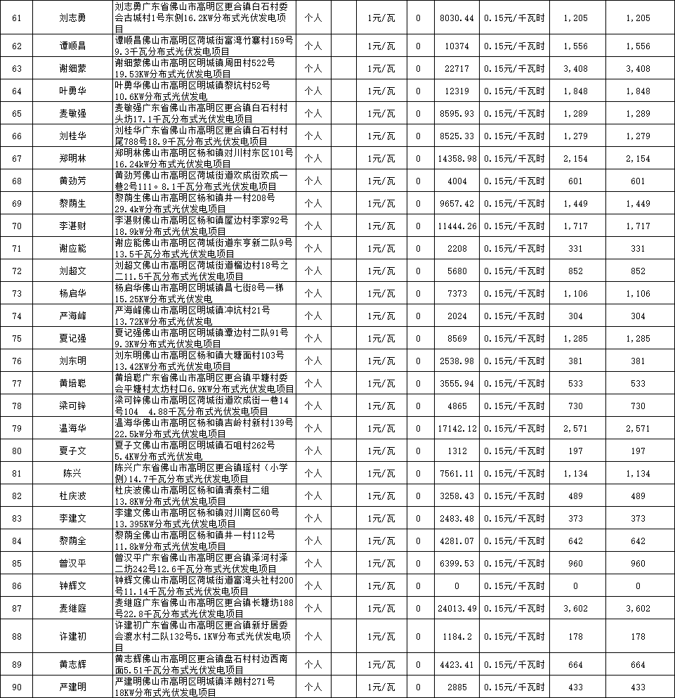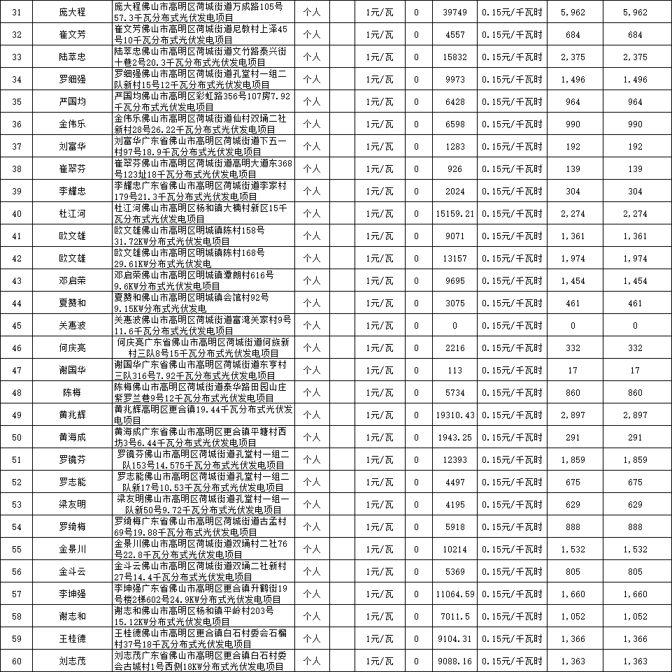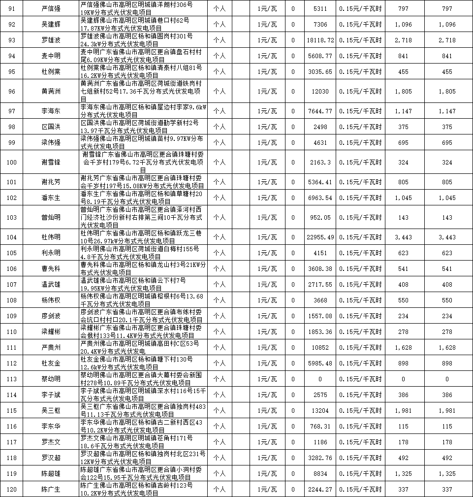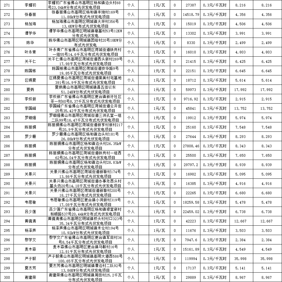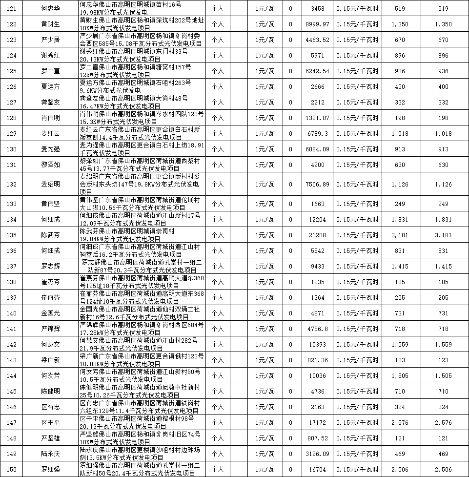 4月17日,廣東省佛山市高明區(qū)發(fā)改局發(fā)布《關(guān)于高明區(qū)2021年度光伏發(fā)電應(yīng)用項目補助資金的公示》,共涉及392個分布式光伏項目,補貼總額915.1465萬元。 詳情如下: 關(guān)于高明區(qū)2021年度光伏發(fā)電應(yīng)用項目補助資金的公示 根據(jù)《佛山市高明區(qū)發(fā)展和改革局關(guān)于組織申報2021年度光伏發(fā)電應(yīng)用項目補助資金的通知》精神,經(jīng)個人和企業(yè)申報及第三方審核,共392個項目符合本次專項資金申領(lǐng)條件,現(xiàn)將高明區(qū)2021年度光伏發(fā)電應(yīng)用項目補助資金結(jié)果進(jìn)行公示(詳見附件),公示期為10個工作日。如對補助信息有異議,可在公示期間向我局反映,并請?zhí)峁┫嚓P(guān)證明材料。 附件:2021年度佛山市高明區(qū)光伏發(fā)電應(yīng)用項目獎勵和獎補資金名單.xlsx 佛山市高明區(qū)發(fā)展和改革局 2023年4月11日 (聯(lián)系人:柳衛(wèi)民,聯(lián)系電話:88637655) (放大查看下圖)