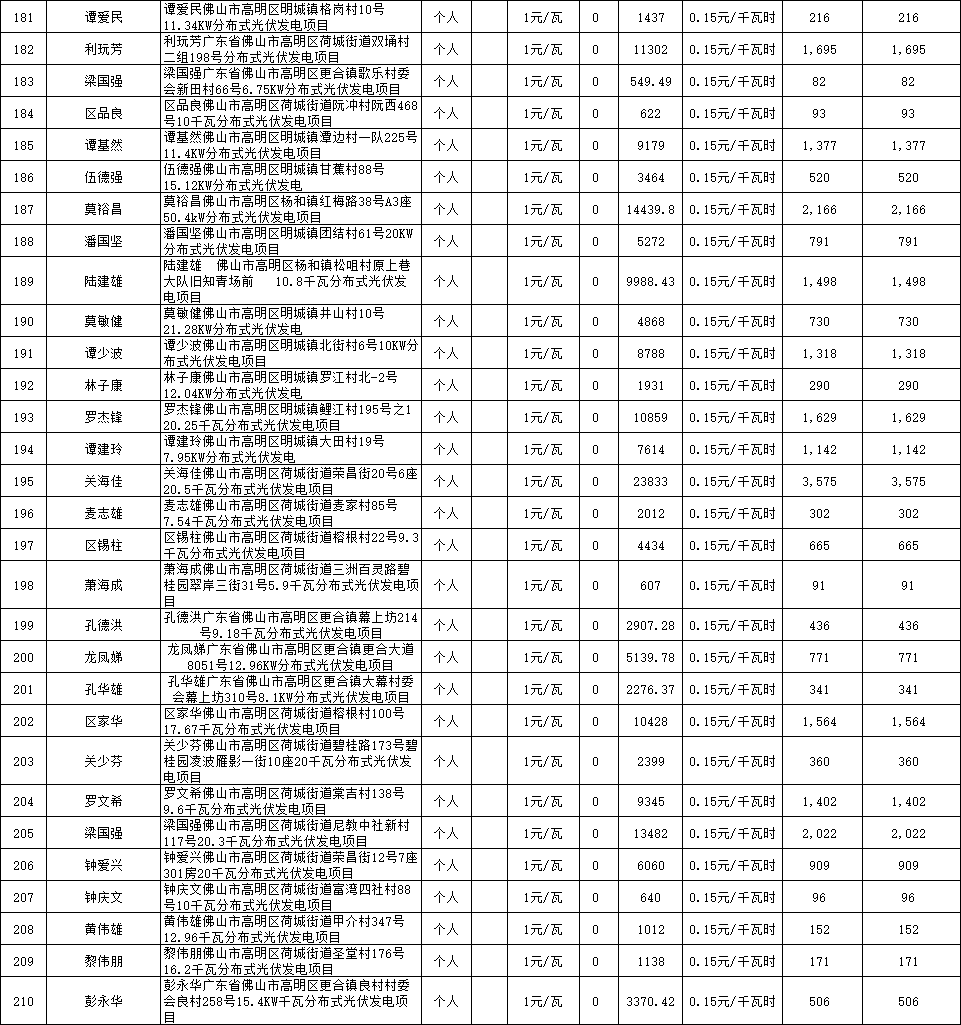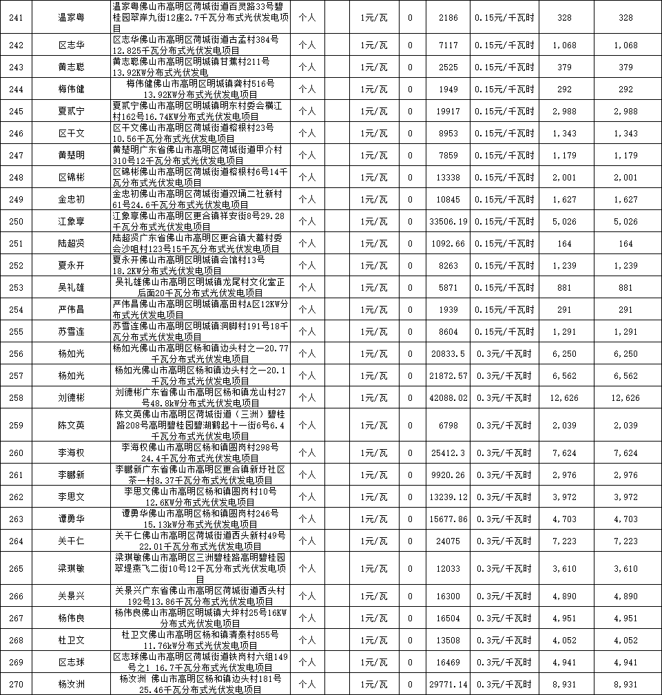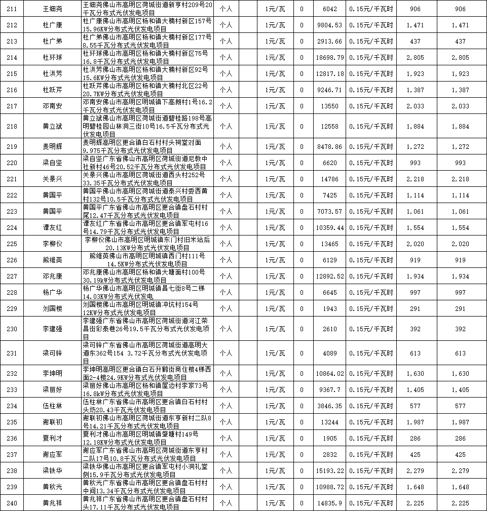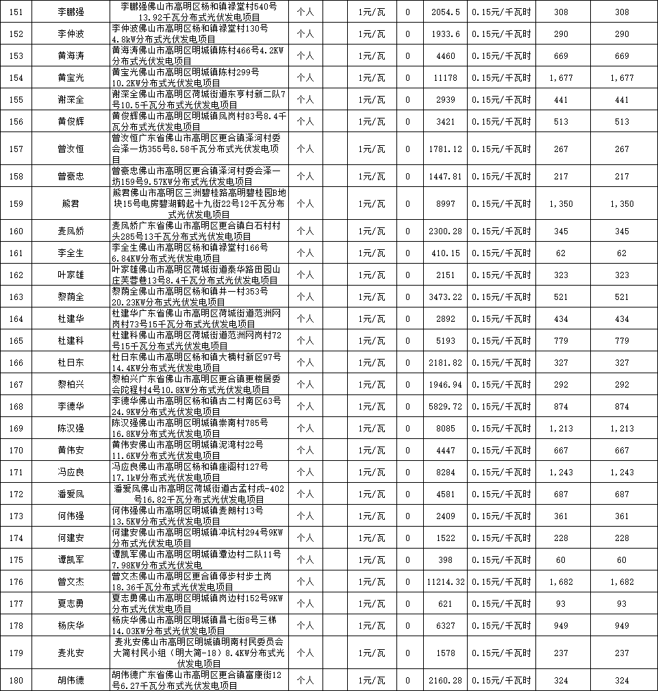 4月17日,廣東省佛山市高明區(qū)發(fā)改局發(fā)布《關(guān)于高明區(qū)2021年度光伏發(fā)電應(yīng)用項目補助資金的公示》,共涉及392個分布式光伏項目,補貼總額915.1465萬元。 詳情如下: 關(guān)于高明區(qū)2021年度光伏發(fā)電應(yīng)用項目補助資金的公示 根據(jù)《佛山市高明區(qū)發(fā)展和改革局關(guān)于組織申報2021年度光伏發(fā)電應(yīng)用項目補助資金的通知》精神,經(jīng)個人和企業(yè)申報及第三方審核,共392個項目符合本次專項資金申領(lǐng)條件,現(xiàn)將高明區(qū)2021年度光伏發(fā)電應(yīng)用項目補助資金結(jié)果進(jìn)行公示(詳見附件),公示期為10個工作日。如對補助信息有異議,可在公示期間向我局反映,并請?zhí)峁┫嚓P(guān)證明材料。 附件:2021年度佛山市高明區(qū)光伏發(fā)電應(yīng)用項目獎勵和獎補資金名單.xlsx 佛山市高明區(qū)發(fā)展和改革局 2023年4月11日 (聯(lián)系人:柳衛(wèi)民,聯(lián)系電話:88637655) (放大查看下圖)