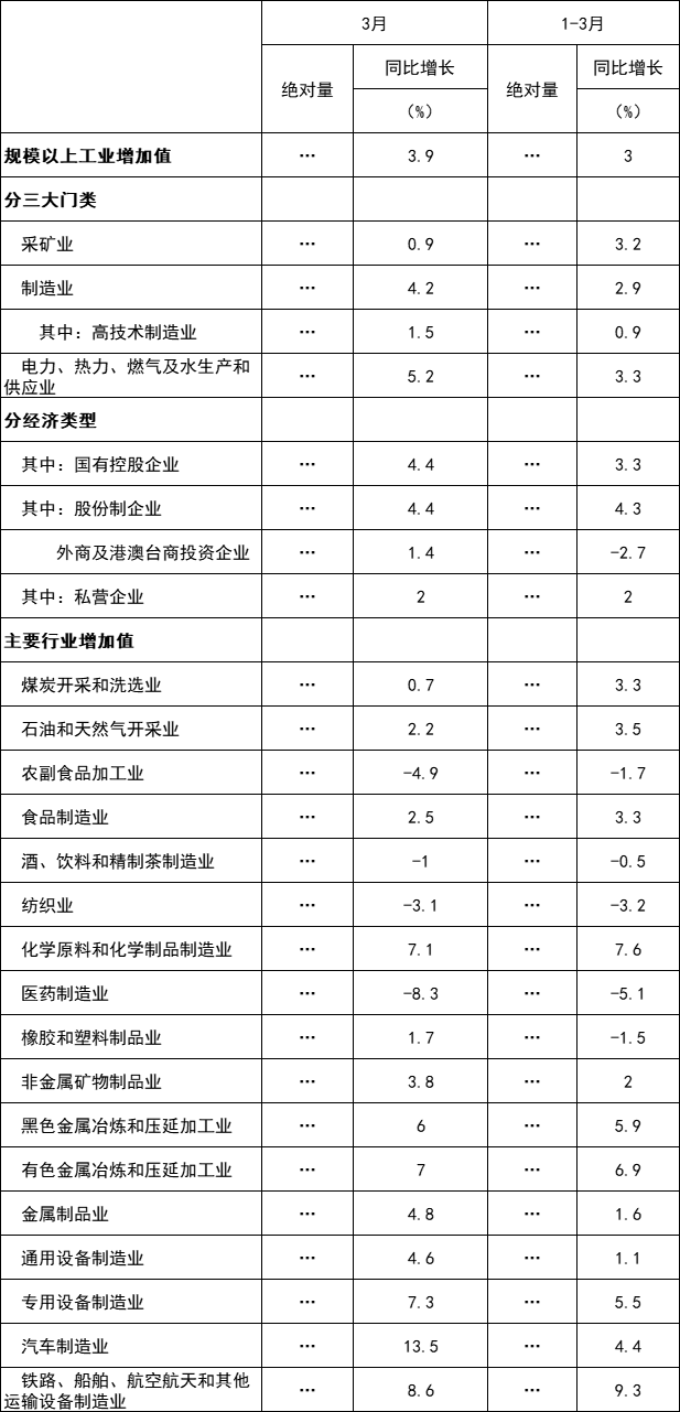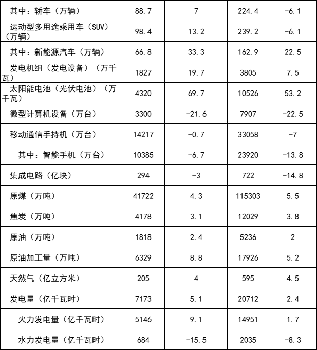 4月18日,國家統(tǒng)計局發(fā)布2023年3月份規(guī)模以上工業(yè)生產主要數(shù)據(jù),數(shù)據(jù)顯示,3月太陽能發(fā)電量達到243億千瓦時,同比增長13.9%。 原文如下: 2023年3月份規(guī)模以上工業(yè)增加值增長3.9% 3月份,規(guī)模以上工業(yè)增加值同比實際增長3.9%(增加值增速均為扣除價格因素的實際增長率)。從環(huán)比看,3月份,規(guī)模以上工業(yè)增加值比上月增長0.12%。1—3月份,規(guī)模以上工業(yè)增加值同比增長3.0%。 分三大門類看,3月份,采礦業(yè)增加值同比增長0.9%,制造業(yè)增長4.2%,電力、熱力、燃氣及水生產和供應業(yè)增長5.2%。 分經(jīng)濟類型看,3月份,國有控股企業(yè)增加值同比增長4.4%;股份制企業(yè)增長4.4%,外商及港澳臺商投資企業(yè)增長1.4%;私營企業(yè)增長2.0%。 分行業(yè)看,3月份,41個大類行業(yè)中有26個行業(yè)增加值保持同比增長。其中煤炭開采和洗選業(yè)增長0.7%,石油和天然氣開采業(yè)增長2.2%,農副食品加工業(yè)下降4.9%,酒、飲料和精制茶制造業(yè)下降1.0%,紡織業(yè)下降3.1%,化學原料和化學制品制造業(yè)增長7.1%,非金屬礦物制品業(yè)增長3.8%,黑色金屬冶煉和壓延加工業(yè)增長6.0%,有色金屬冶煉和壓延加工業(yè)增長7.0%,通用設備制造業(yè)增長4.6%,專用設備制造業(yè)增長7.3%,汽車制造業(yè)增長13.5%,鐵路、船舶、航空航天和其他運輸設備制造業(yè)增長8.6%,電氣機械和器材制造業(yè)增長16.9%,計算機、通信和其他電子設備制造業(yè)增長1.2%,電力、熱力生產和供應業(yè)增長5.3%。 分產品看,3月份,620種產品中有347種產品產量同比增長。鋼材12725萬噸,同比增長8.1%;水泥20580萬噸,增長10.4%;十種有色金屬628萬噸,增長6.9%;乙烯261萬噸,增長3.6%;汽車260.8萬輛,增長11.2%,其中新能源汽車66.8萬輛,增長33.3%;發(fā)電量7173億千瓦時,同比增長5.1%;原油加工量6329萬噸,同比增長8.8%。 3月份,工業(yè)企業(yè)產品銷售率為94.1%,同比下降0.6個百分點;工業(yè)企業(yè)實現(xiàn)出口交貨值12596億元,同比名義下降5.4%。 2023年3月份規(guī)模以上工業(yè)生產主要數(shù)據(jù)
