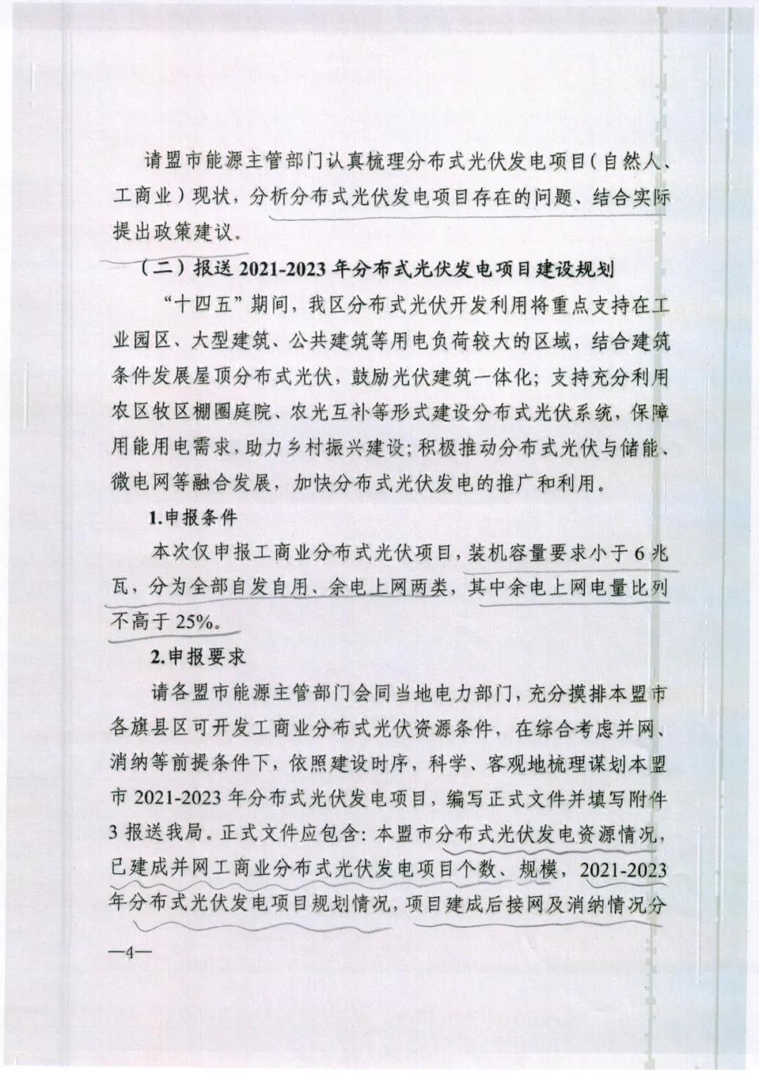 日前,內(nèi)蒙古自治區(qū)能源局發(fā)布關(guān)于報(bào)送分布式新能源項(xiàng)目建設(shè)三年行動(dòng)計(jì)劃(2021-2023年)的通知,文件要求,各盟市能源主管部門(mén)全面梳理分布式新能源項(xiàng)目的發(fā)展現(xiàn)狀,并結(jié)合實(shí)際梳理申報(bào)2021-2021年分布式新能源開(kāi)發(fā)建設(shè)規(guī)劃。 文件明確要加快發(fā)展分布式光伏項(xiàng)目。“十四五”期間,內(nèi)蒙古自治區(qū)分布式光伏開(kāi)發(fā)利用將重點(diǎn)支持在工業(yè)園區(qū)、大型建筑、公共建筑等用電負(fù)荷較大的區(qū)域,結(jié)合建筑條件發(fā)展屋頂分布式光伏,鼓勵(lì)光伏建筑一體化;支持充分利用農(nóng)區(qū)牧區(qū)棚圈庭院、農(nóng)光互補(bǔ)等形式建設(shè)分布式光伏系統(tǒng),保障用能用電需求,助力鄉(xiāng)村振興建設(shè);積極推動(dòng)分布式光伏與儲(chǔ)能、微電網(wǎng)等融合發(fā)展,加快分布式光伏發(fā)電的推廣和利用。 值得注意的是,此次僅申報(bào)工商業(yè)分布式光伏項(xiàng)目,裝機(jī)容量要求小于6MW,分為全部自發(fā)自用、余電上網(wǎng)兩類(lèi),其中余電上網(wǎng)電量比例不高于25%。 原文如下: