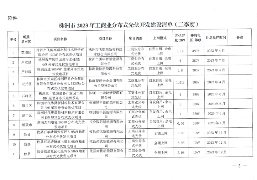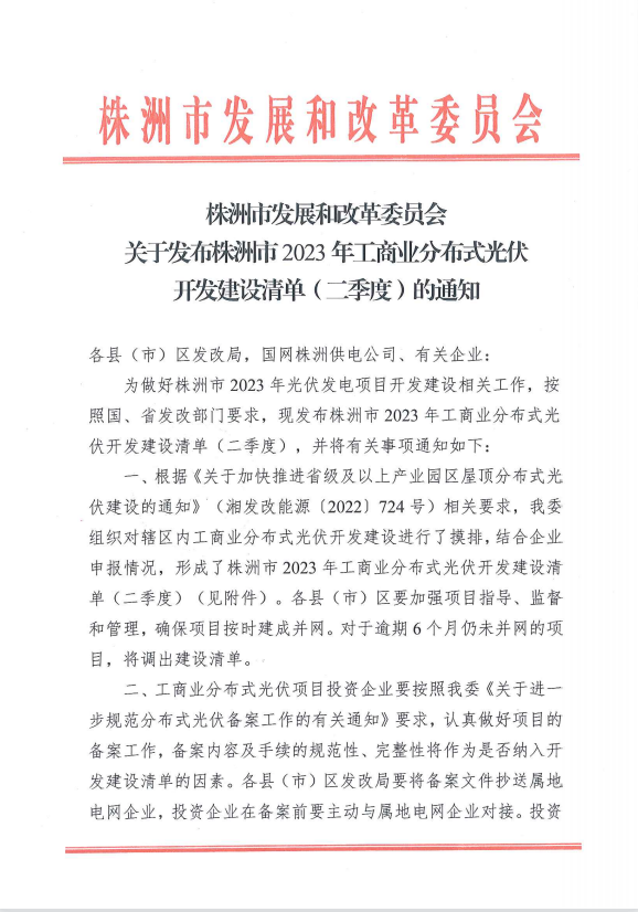 4月18日,株洲市發(fā)改委關于發(fā)布株洲市2023年工商業(yè)分布式光伏開發(fā)建設清單(二季度)的通知。對轄區(qū)內工商業(yè)分布式光伏開發(fā)建設進行了摸排,結合企業(yè)申報情況,形成了株洲市2023年工商業(yè)分布式光伏開發(fā)建設清單(二季度)(見附件)。其中強調,對于逾期6個月仍未并網的項目,將調出建設清單。 原文如下:
