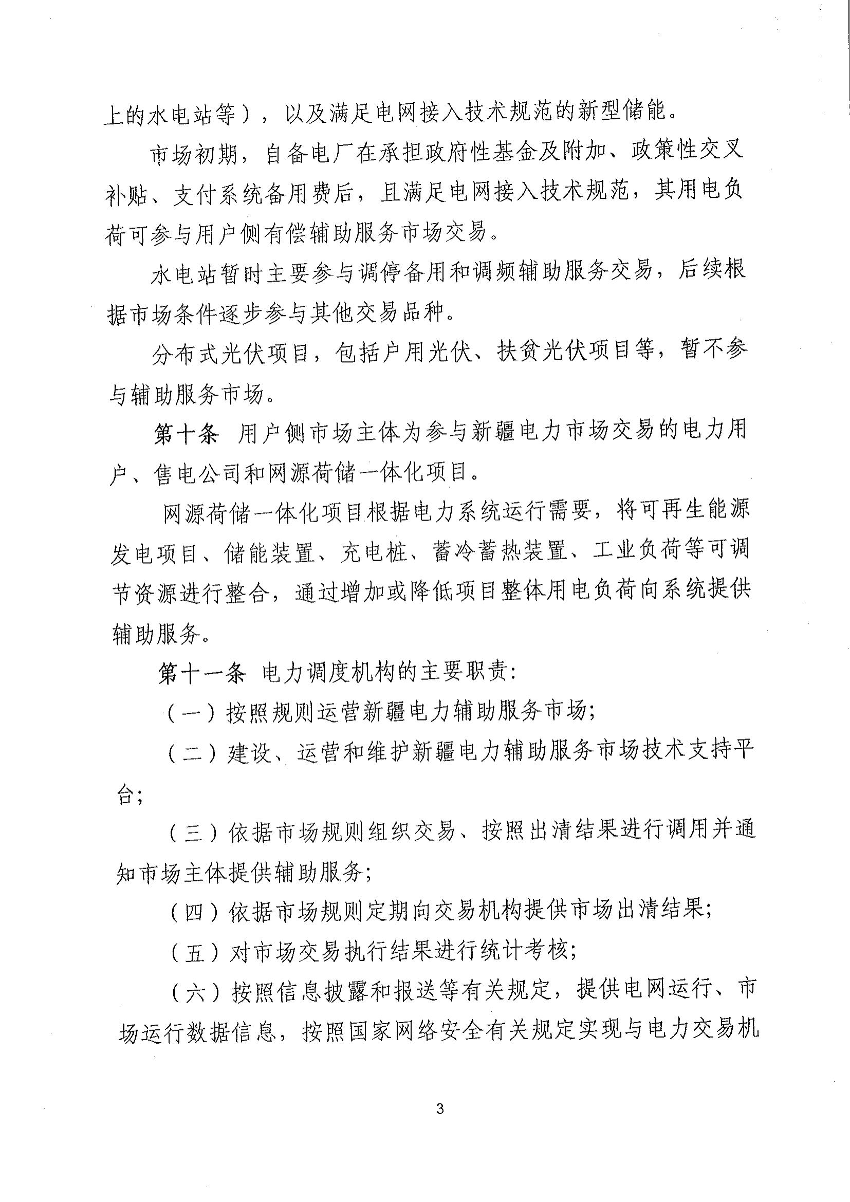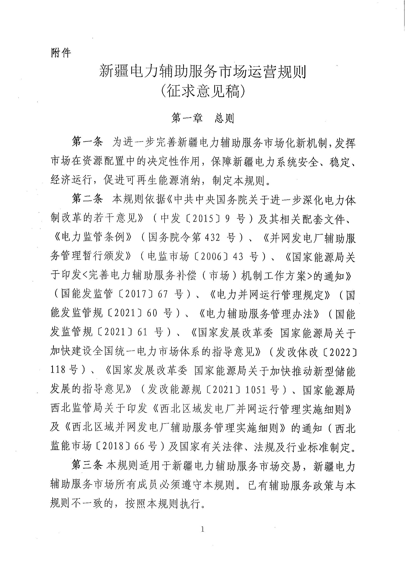 4月28日,國家能源局新疆監(jiān)管辦公室發(fā)布關(guān)于對《新疆電力輔助服務(wù)市場運營規(guī)則(征求意見稿》征求意見的通知,通知指出,發(fā)電側(cè)市場主體為新疆省級及以上調(diào)度機構(gòu)直接調(diào)管的,參與新疆區(qū)域內(nèi)電力電量平衡的并網(wǎng)發(fā)電企業(yè)(包括單機容量100MW及以上的火電機組、風(fēng)電、光伏和裝機容量50MW及以上的水電站等),以及滿足電網(wǎng)接入技術(shù)規(guī)范的新型儲能。 分布式光伏項目,包括戶用光伏、扶貧光伏項目等,暫不參與輔助服務(wù)市場。 風(fēng)電、光伏企業(yè)與獨立電儲能設(shè)施協(xié)商的儲能設(shè)施充電電力為風(fēng)電、光伏企業(yè)對應(yīng)時段新增發(fā)電空間。除發(fā)生危及電網(wǎng)安全運行等極特殊情況外,電力調(diào)度機構(gòu)須嚴(yán)格保證風(fēng)電、光伏企業(yè)的發(fā)電空間。 原文如下: 關(guān)于對《新疆電力輔助服務(wù)市場運營規(guī)則(征求意見稿》征求意見的通知 國網(wǎng)新疆電力有限公司、新疆生產(chǎn)建設(shè)兵團電力集團有限責(zé)任公司、新疆電力交易中心有限公司、各發(fā)電企業(yè)、各電力用戶、各電力市場主體單位: 為進一步深化新疆電力輔助服務(wù)市場機制建設(shè),通過市場化手段發(fā)掘電力系統(tǒng)調(diào)節(jié)能力,著力提升電力系統(tǒng)安全穩(wěn)定運行水平,國家能源局新疆監(jiān)管辦公室對《新疆電力輔助服務(wù)市場運營規(guī)則》進行了修訂,形成《新疆電力輔助服務(wù)市場運營規(guī)則(征求意見稿)》現(xiàn)印發(fā)給你們。請各單位結(jié)合工作實際提出意見和建議,并于2023年6月1日前書面反饋我辦,逾期未反饋視為無意見。附件可在國家能源局新疆監(jiān)管辦公室門戶網(wǎng)站公告欄下載(網(wǎng)址為http://xjb.nea.gov.cn/)。 聯(lián)系人:張碩 電 話:13369662826 郵 箱:51112149@qq.com 附件:《新疆電力輔助服務(wù)市場運營規(guī)則(征求意見稿)》 國家能源局新疆監(jiān)管辦公室 2023年4月27日