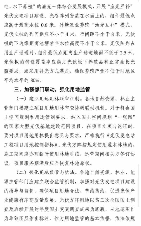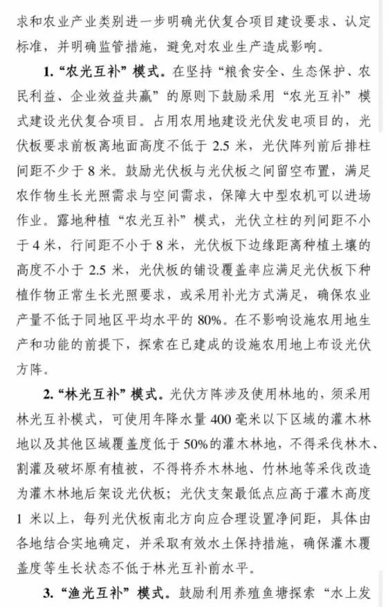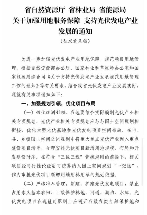 5月12日,江蘇省自然資源廳、林業(yè)局、能源局三部門聯(lián)合印發(fā)《關(guān)于加強用地服務(wù)保障支持光伏發(fā)電產(chǎn)業(yè)發(fā)展的通知》(征求意見稿),進一步加強江蘇省光伏發(fā)電產(chǎn)業(yè)用地保障,規(guī)范項目用地管理。 根據(jù)文件,各地要結(jié)合實際編制光伏產(chǎn)業(yè)相關(guān)專項規(guī)劃,光伏產(chǎn)業(yè)相關(guān)專項規(guī)劃應與與國土空間規(guī)劃相銜接,將重大重點光伏產(chǎn)業(yè)列入重點建設(shè)項目清單,合理安排光伏項目新增用地規(guī)模、布局和開發(fā)建設(shè)時序,以國土空間規(guī)劃“一張圖”作為審批光伏項目新增用地用林用草的規(guī)劃依據(jù)。 文件鼓勵光伏發(fā)電項目因地制宜,通過采用“農(nóng)光互補”“林光互補”和“漁光互補”等復合用地模式,具體要求為: 1、農(nóng)光互補模式:占用農(nóng)用地建設(shè)光伏發(fā)電項目的,光伏板要求前板離地面高度不低于2.5米,光伏陣列前后排柱間距不少于8米。露地種植“農(nóng)光互補”模式,光伏立柱的列間距不小于4米,行間距不小于8米,光伏板下邊緣距離種植土壤的高度不小于2.5米,光伏板的鋪設(shè)覆蓋率應滿足光伏板下種植作物正常生長光照要求,或采用補光方式滿足,確保農(nóng)業(yè)產(chǎn)量不低于同地區(qū)平均水平的80%。 2、林光互補模式:可使用年降水量400毫米以下區(qū)域的灌木林地以及其他區(qū)域覆蓋度低于50%的灌木林地,光伏支架最低點應高于灌木高度1米以上,每列光伏板南北方向應合理設(shè)置凈間距。 3、漁光互補模式:光谷陣列安裝在水面上的,組件最低點應高于最高水位0.6米。外塘漁業(yè)養(yǎng)殖“漁光互補”模式,光伏立柱的列間距應不小于4米,行間距不小于8米,光伏板的下邊緣距離池塘常年水位高度不小于2米。光伏陣列占用生產(chǎn)通道時,組件最低點距離生產(chǎn)通道地面不低于2.5米。 需要注意的是,對于歷史遺留問題,在《關(guān)于支持光伏發(fā)電產(chǎn)業(yè)發(fā)展規(guī)范用地管理有關(guān)工作的通知》(自然資辦發(fā)【2023】12號文)之前已按《關(guān)于支持光伏扶貧和規(guī)范光伏發(fā)電產(chǎn)業(yè)用地的意見》(國土資規(guī)【2017】8號文)辦理立項的動工或未動工項目可按批準立項時用地預審和用地有關(guān)意見執(zhí)行;對于已經(jīng)通過用地預審但未立項的,則按照新規(guī)定執(zhí)行。 文件指出,禁止占用永久基本農(nóng)田、I級保護林地、河道、湖泊、水庫,光伏要避讓自然保護地和重要濕地,在湖泊周邊、水庫庫汊建設(shè)光伏發(fā)電項目的,應當經(jīng)過科學論證,嚴格管控,已有項目則嚴禁虧大范圍與規(guī)模。 對列入國家、省重大項目清單的光伏項目,用地計劃由省級直接核銷,予以“應保盡保”。對于難以復墾或修復的采煤沉陷區(qū),支持利用其中的非耕地區(qū)域規(guī)劃建設(shè)光伏基地。鼓勵和支持利用城鎮(zhèn)存量低效用地、村莊用地以及受污染的閑置或廢棄土地開發(fā)建設(shè)光伏發(fā)電項目,盤活土地資源,提高存量資源配置效率。 明確強調(diào),光伏方陣用地不得占用耕地,占用其他農(nóng)用地的不需辦理非農(nóng)建設(shè)用地審批;對不占壓土地、不改變地表形態(tài)的用地部分,可按原地類認定。對于配套設(shè)施用地,則要依法依規(guī)辦理建設(shè)用地審批手續(xù)。 文件要求,各地自然資源、林業(yè)主管部門要建立項目用地用林審查協(xié)調(diào)聯(lián)動機制與聯(lián)合監(jiān)管機制,光伏方陣用地以第三次全國國土調(diào)查及后續(xù)開展的年度國土變更調(diào)查成果為底版,占地范圍作為單獨圖層作出標注,作為用地監(jiān)管的基本依據(jù)。