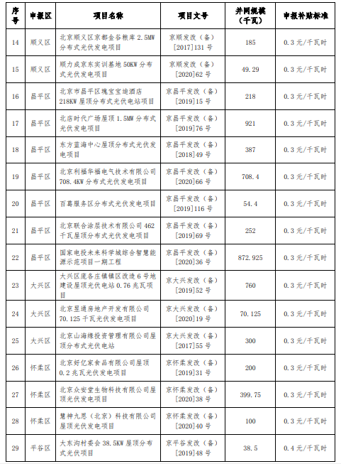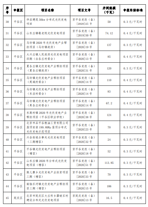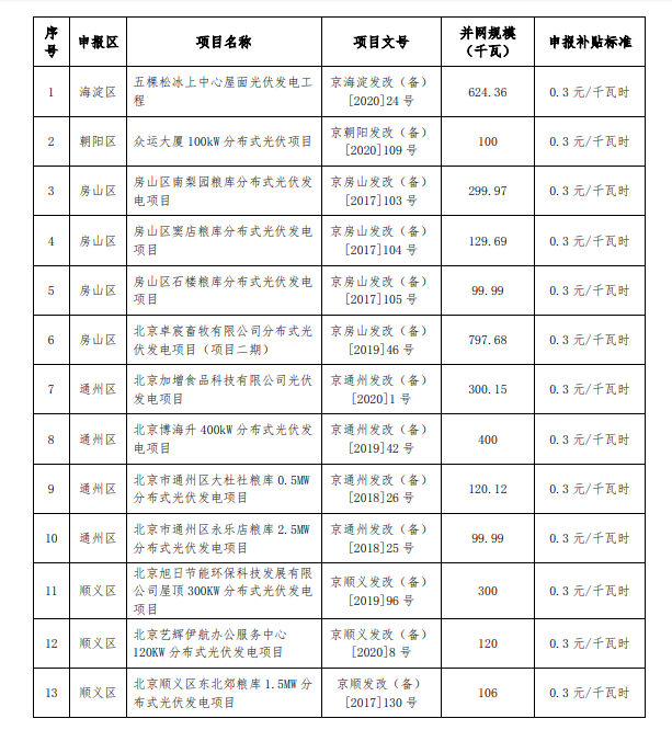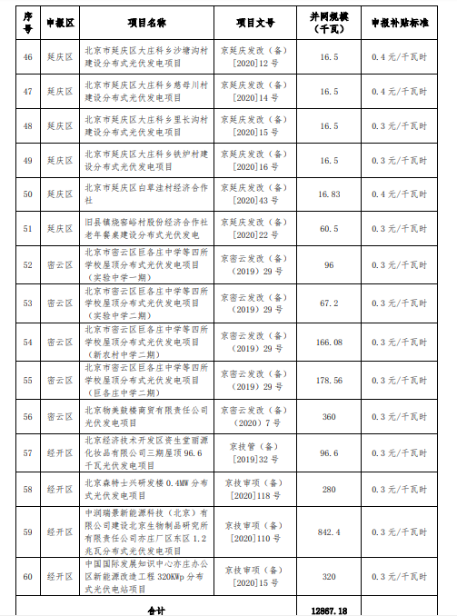 日前,北京市發(fā)展和改革委員會公布了納入《北京市分布式光伏發(fā)電項目補貼名單(2021年第一次)》的分布光伏發(fā)電項目及北京市分布式光伏發(fā)電項目變更名單進行公示。公示時間為2021年3月1日—2021年3月5日(5個工作日)。 根據(jù)統(tǒng)計,北京市分布式光伏發(fā)電項目補貼名單(法人單位)共有60個項目,總規(guī)模12867.18千瓦。北京市分布式光伏發(fā)電項目補貼名單(個人)共699個項目,規(guī)模9139.405千瓦。此外,發(fā)改委還公布了《北京市分布式光伏發(fā)電項目獎勵名單變更項目》名單,詳情見附件。 一、《北京市分布式光伏發(fā)電項目補貼名單(法人單位, 2021 年第一次)》項目表