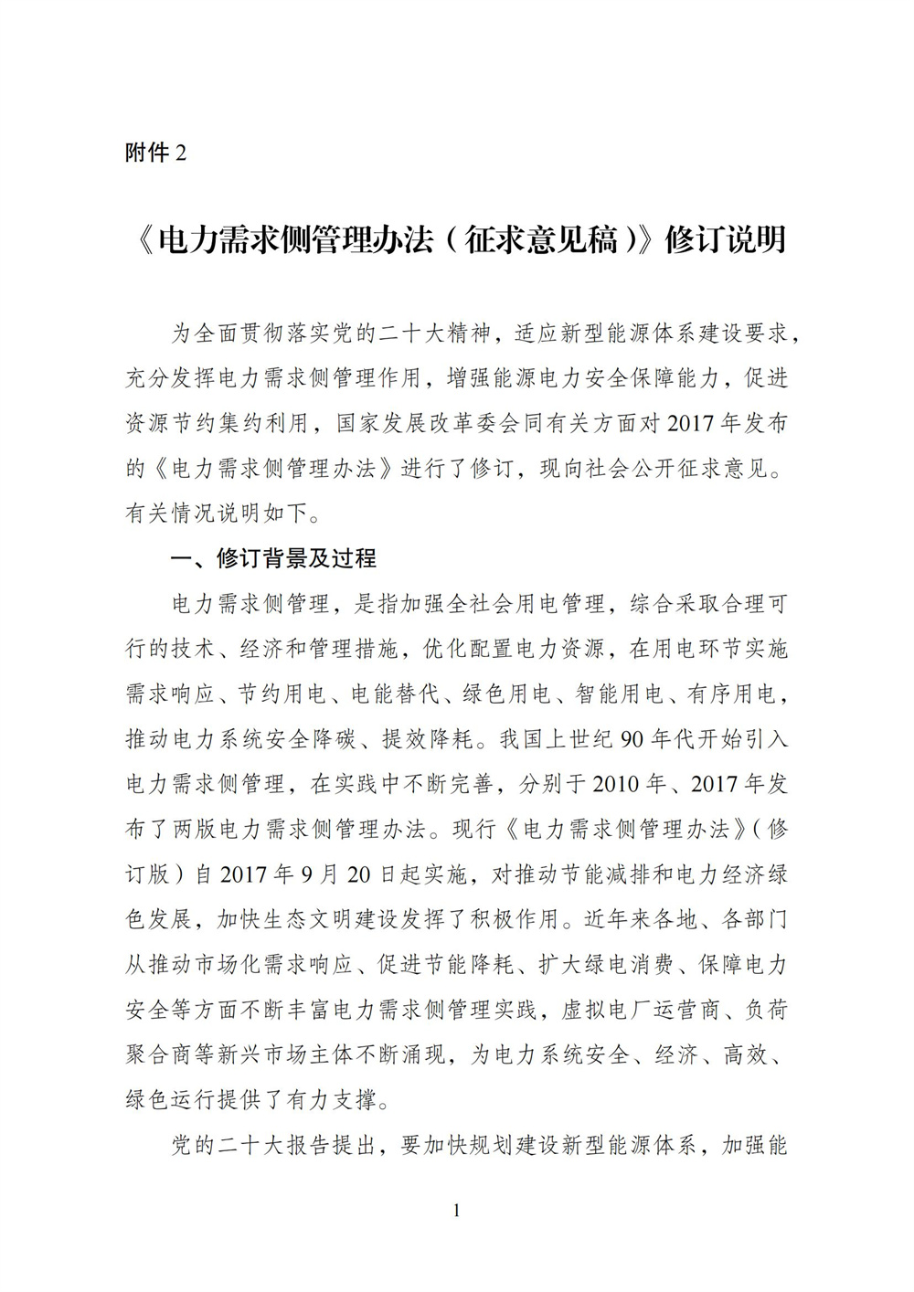 5月19日,國家發(fā)展改革委發(fā)布關(guān)于向社會公開征求《電力需求側(cè)管理辦法(征求意見稿)》《電力負(fù)荷管理辦法(征求意見稿)》意見的公告。此次公開征求意見的時間為2023年5月19日至2023年6月18日。 其中《電力需求側(cè)管理辦法(征求意見稿)》中指出,積極拓寬需求響應(yīng)主體范圍。各類經(jīng)營性電力用戶均可參與需求響應(yīng),有序引導(dǎo)具備響應(yīng)能力的非經(jīng)營性電力用戶參與 需求響應(yīng)。鼓勵推廣新型儲能、分布式電源、電動汽車、空調(diào)負(fù)荷 等主體參與需求響應(yīng)。 提升需求響應(yīng)能力。到2025年,各省需求響應(yīng)能力達(dá)到最大用電負(fù)荷的 3%—5%,其中年度最大用電負(fù)荷峰谷差率超過40%的省份達(dá)到 5%或以上。到2030年,形成規(guī)模化的實時需求響 應(yīng)能力,結(jié)合輔助服務(wù)市場、電能量市場交易可實現(xiàn)電網(wǎng)區(qū)域內(nèi)可 調(diào)節(jié)資源共享互濟。 建立并完善與電力市場銜接的需求響應(yīng)價格機制。 根據(jù)“誰受益、誰承擔(dān)”的原則,支持具備條件的地區(qū),通過實施尖峰電價等手段提高經(jīng)濟激勵水平。鼓勵需求響應(yīng)主體參與相應(yīng)電 能量市場、輔助服務(wù)市場、容量市場等,按市場規(guī)則獲取經(jīng)濟收益。 鼓勵行業(yè)龍頭企業(yè)、大型國有企業(yè)、跨國公司等消費綠電,發(fā)揮示范帶頭作用,推動外向型企業(yè)較多、經(jīng)濟承受能 力較強的地區(qū)逐步提升綠電消費比例。加強高耗能、高排放企業(yè)使 用綠電的剛性約束,各地可根據(jù)實際情況制定高耗能、高排放企業(yè) 電力消費中綠電最低占比。提升新型基礎(chǔ)設(shè)施綠電消費水平,促進(jìn) 綠電就近消納。 提高京津冀、長三角、粵港澳等重點區(qū)域綠色電 力消費比重,提升新增產(chǎn)業(yè)、新建項目、新建園區(qū)可再生能源利用水平。支持以縣域或村鎮(zhèn)為單位,充分利用當(dāng)?shù)仫L(fēng)、光、生物質(zhì)、 地?zé)岬瓤稍偕茉促Y源,因地制宜建設(shè)分布式綠色低碳綜合能源網(wǎng) 絡(luò),提高鄉(xiāng)村用能的綠電比例。積極推動工業(yè)廠房、公共建筑等屋頂光伏建設(shè)和實施光伏建筑一體化應(yīng)用,因地制宜推廣淺層地?zé)狎?qū) 動的冷熱電一體化模式。 詳情如下: 國家發(fā)展改革委關(guān)于向社會公開征求《電力需求側(cè)管理辦法(征求意見稿)》《電力負(fù)荷管理辦法(征求意見稿)》意見的公告 為貫徹落實黨的二十大精神,加快規(guī)劃建設(shè)新型能源體系,服務(wù)經(jīng)濟社會高質(zhì)量發(fā)展,確保能源安全,我們組織修訂了2017年國家發(fā)展改革委、工業(yè)和信息化部、財政部、住房城鄉(xiāng)建設(shè)部、國務(wù)院國資委、國家能源局聯(lián)合發(fā)布的《電力需求側(cè)管理辦法》和2011年國家發(fā)展改革委發(fā)布的《有序用電管理辦法》,形成《電力需求側(cè)管理辦法(征求意見稿)》和《電力負(fù)荷管理辦法(征求意見稿)》,現(xiàn)向社會公開征求意見。 此次公開征求意見的時間為2023年5月19日至2023年6月18日。請登錄國家發(fā)展改革委門戶網(wǎng)站(.cn)首頁“互動交流”板塊,進(jìn)入“意見征求”專欄,提出意見建議并說明理由。 感謝您的參與和支持! 附件:1.《電力需求側(cè)管理辦法(征求意見稿)》 2.《〈電力需求側(cè)管理辦法(征求意見稿)〉修訂說明》 3.《電力負(fù)荷管理辦法(征求意見稿)》 4.《〈電力負(fù)荷管理辦法(征求意見稿)〉修訂說明》 國家發(fā)展改革委 2023年5月19日
